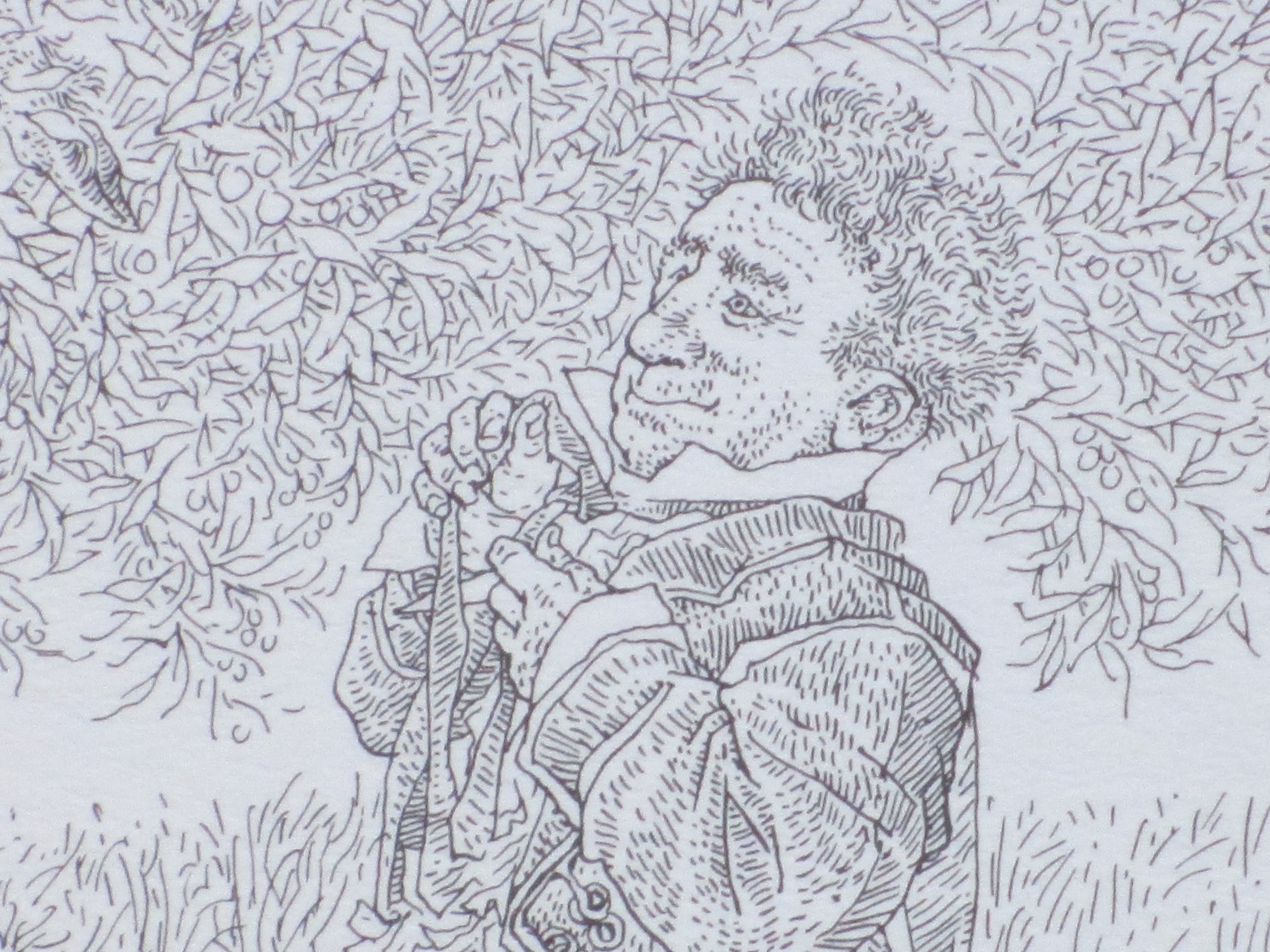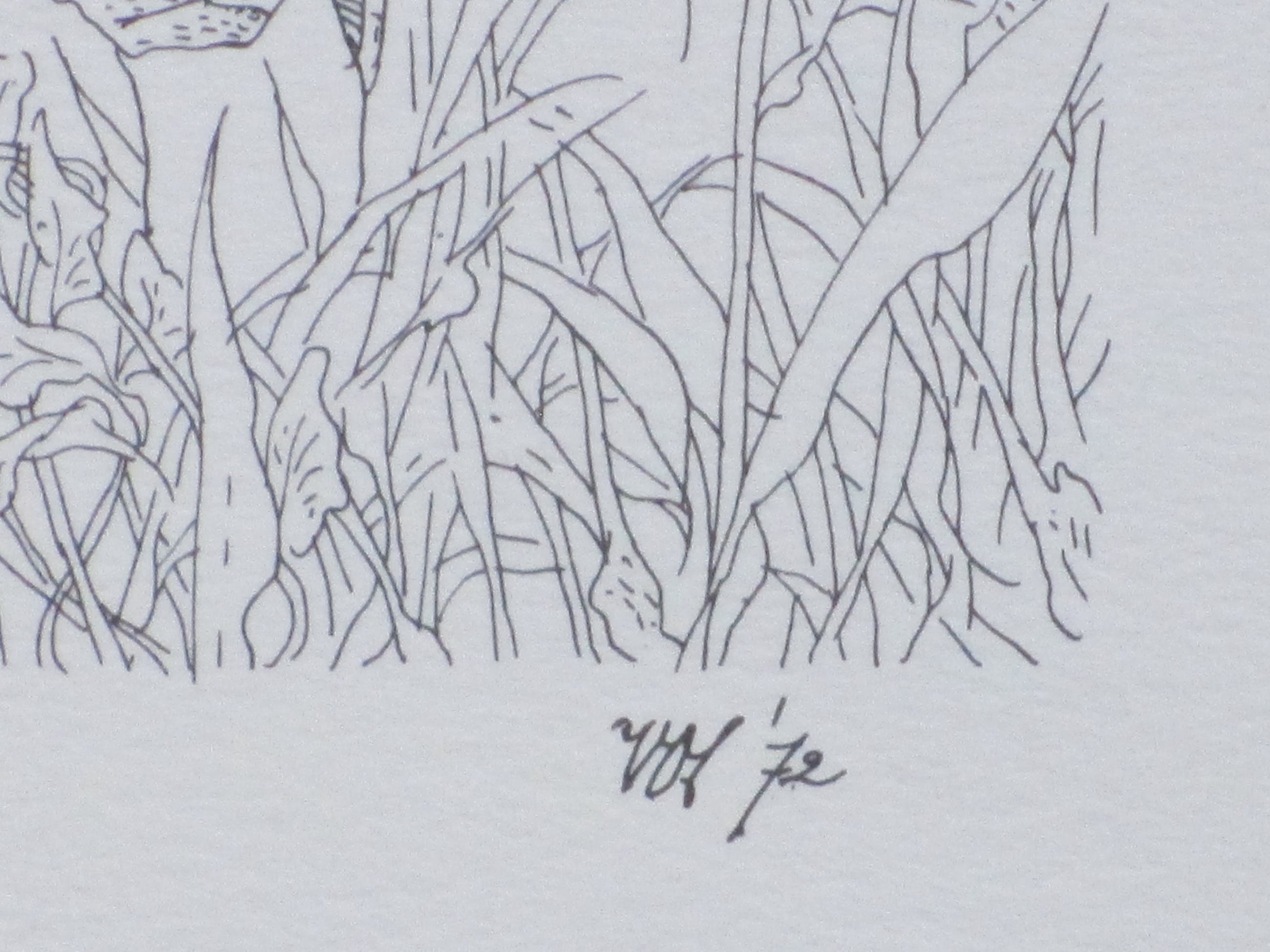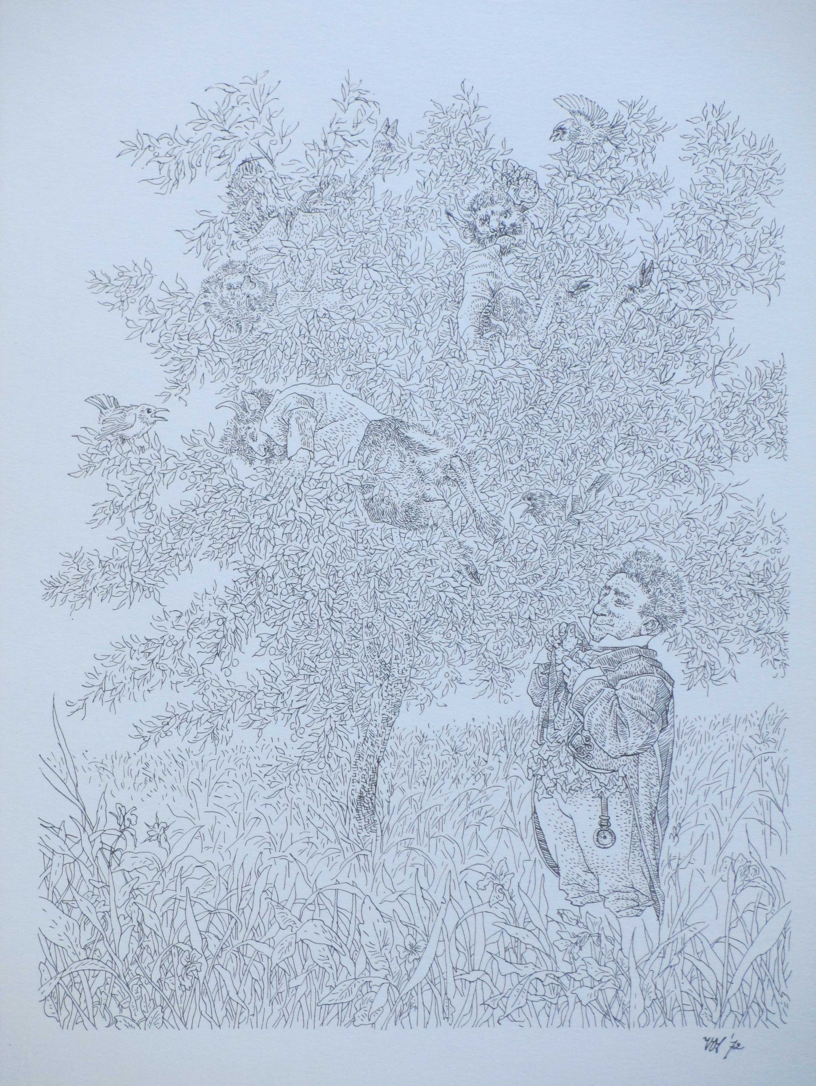 Litho doorPeter Vos. Voorstelling van een zelfportret voor een beestenboom. Losbladig, beeldmaat 28x22, bladmaat 34x25 Gesigneerd en gedateerd in de druk rechtsonder: 'Vos '72' Watermerk papier rechtsboven: 'E.G. Volkers'