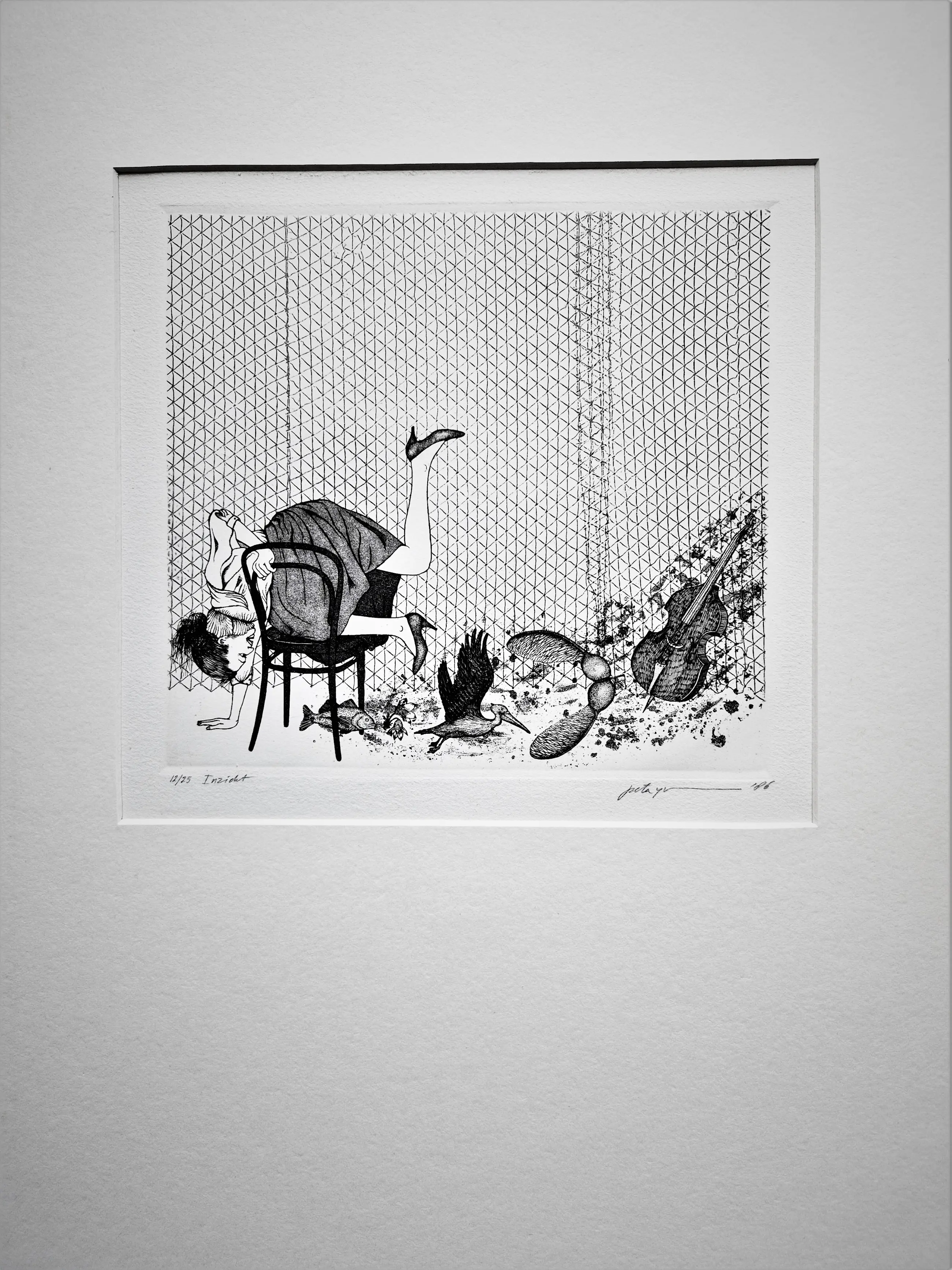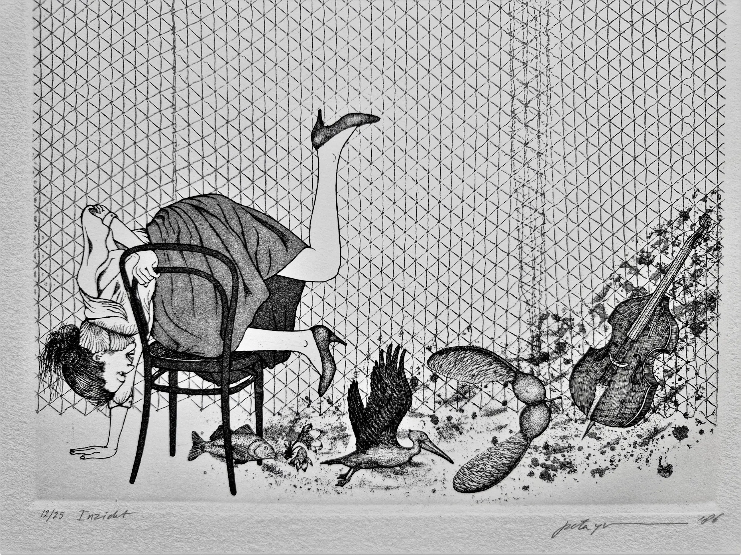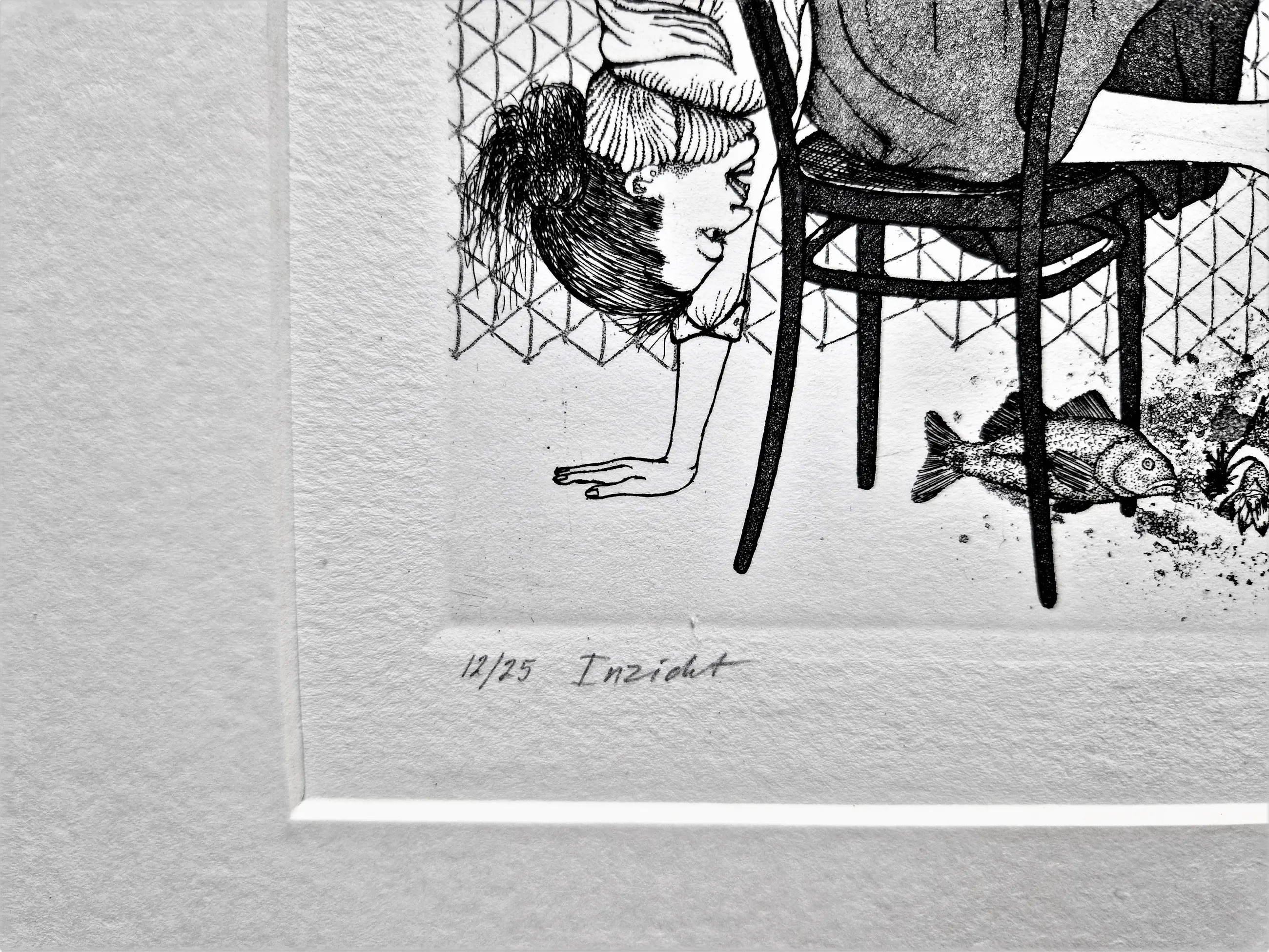 Fraaie, in zeer kleine oplage van slechts 25 exemplaren door de bekende Groningse graficus peter yvon de Vries (1952-) gemaakte Ets & Aquatint "Inzicht". Met potlood gesigneerd, gedateerd en genummerd. Verkeert in zeer goede conditie.