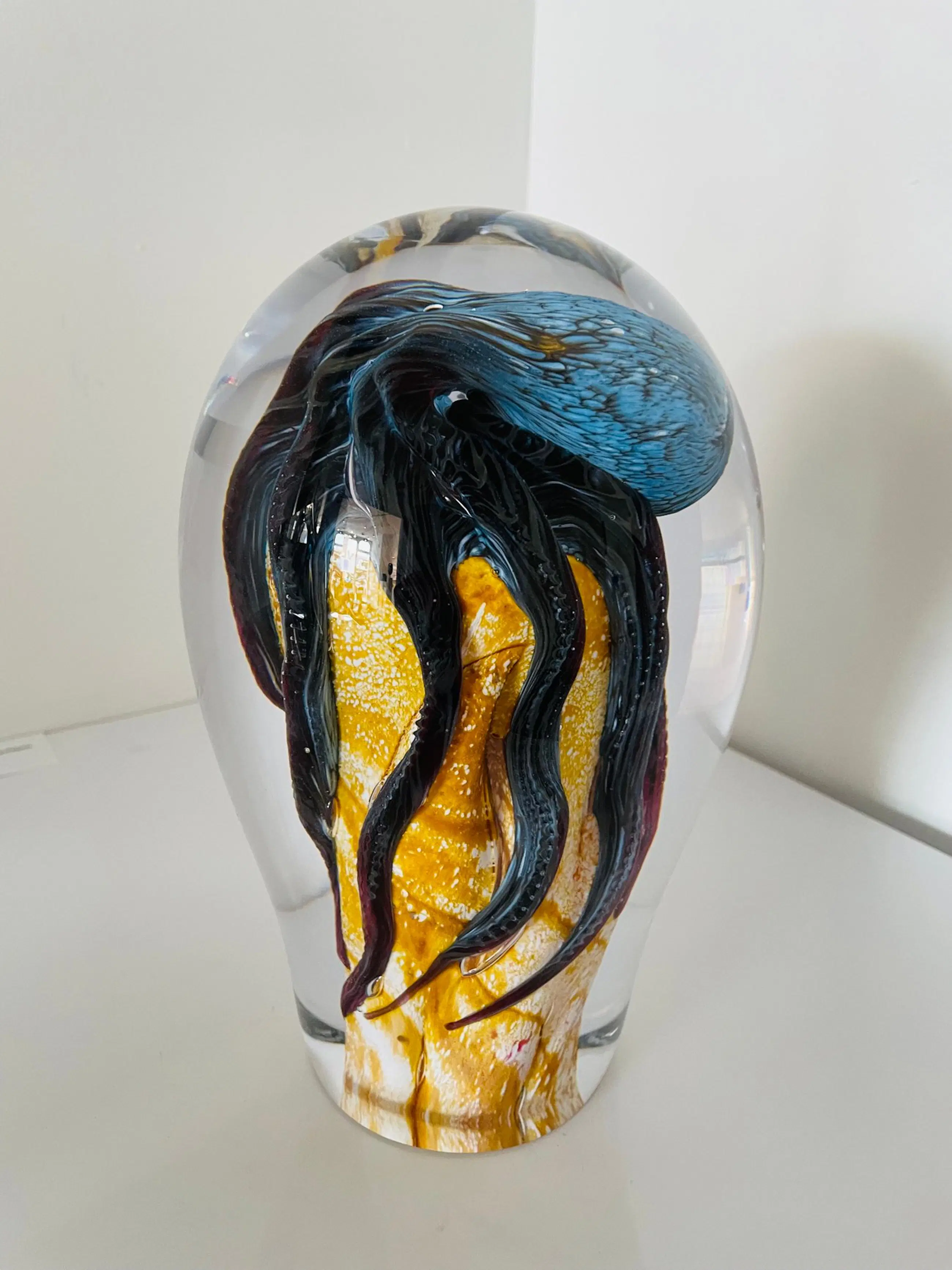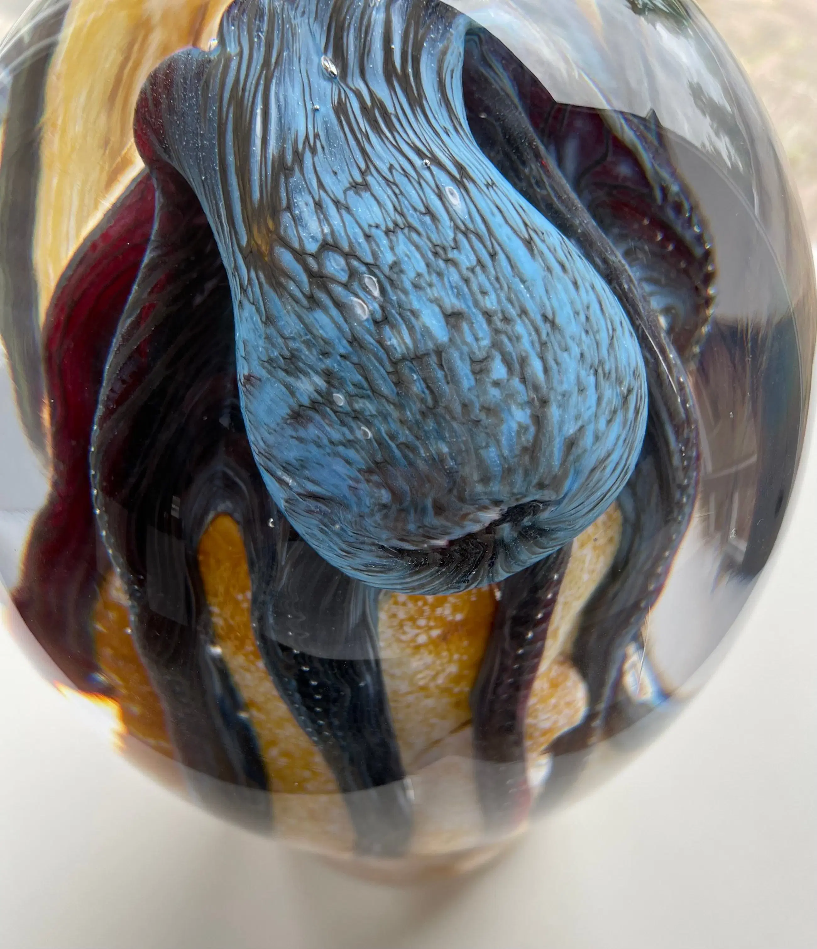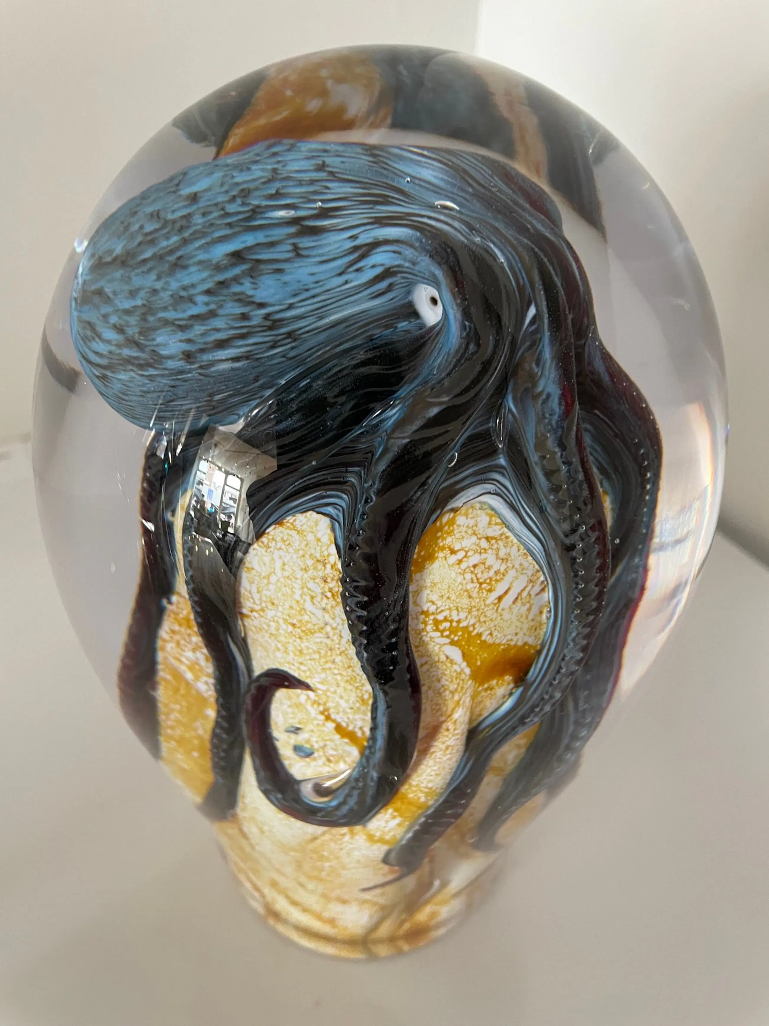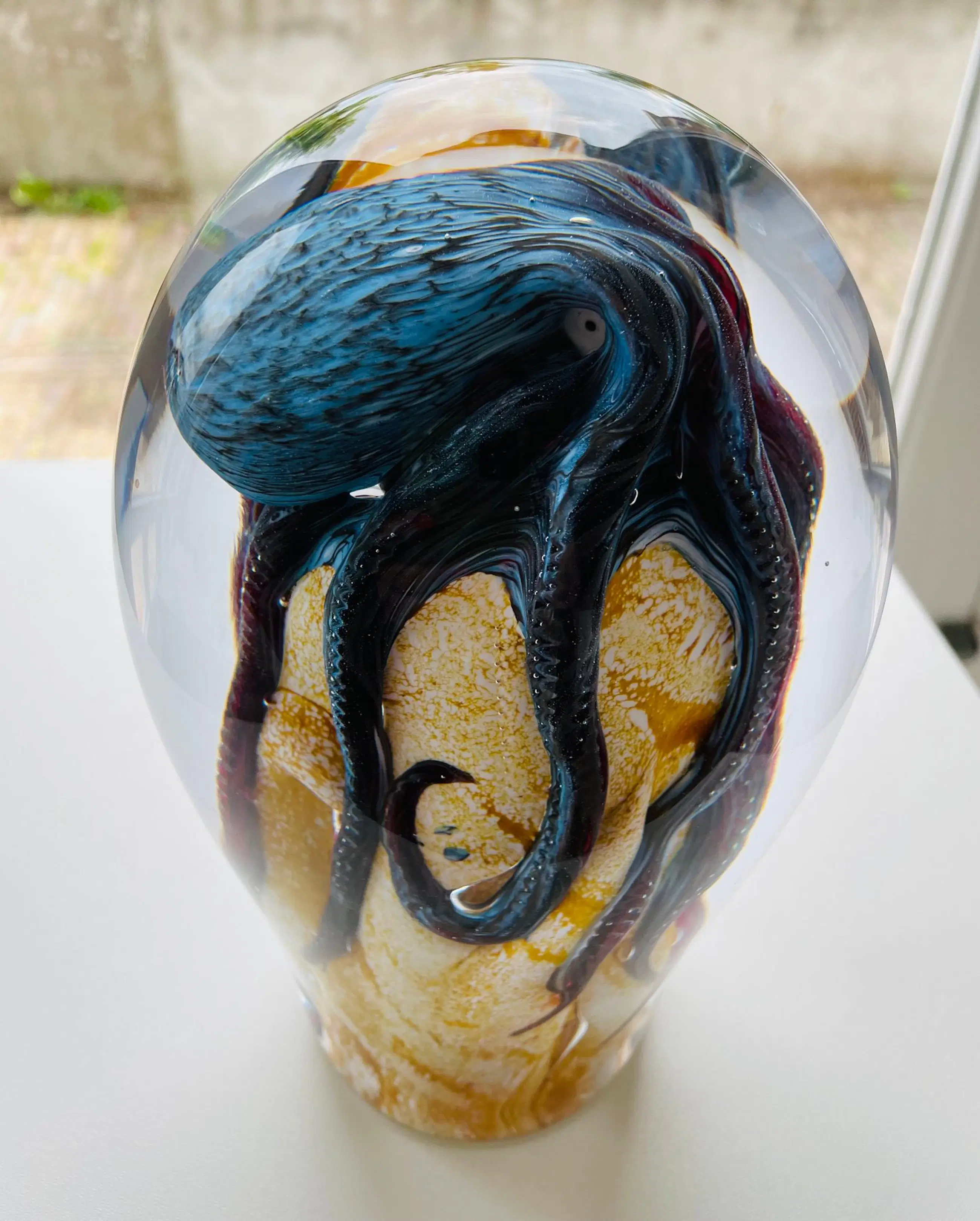 Unique glasobject “ Octopus “ de Tsjechische glaskunstenaar Petr Kuchta. Mondgeblazen en handgevormd, gepolijst en geslepen. Aan de onderzijde gesigneerd met een diamantstift. Hoog 22 cm. Diameter 15 cm. Gewicht 4,9 kilo! Gefotografeerd met daglicht en kunstlicht.
