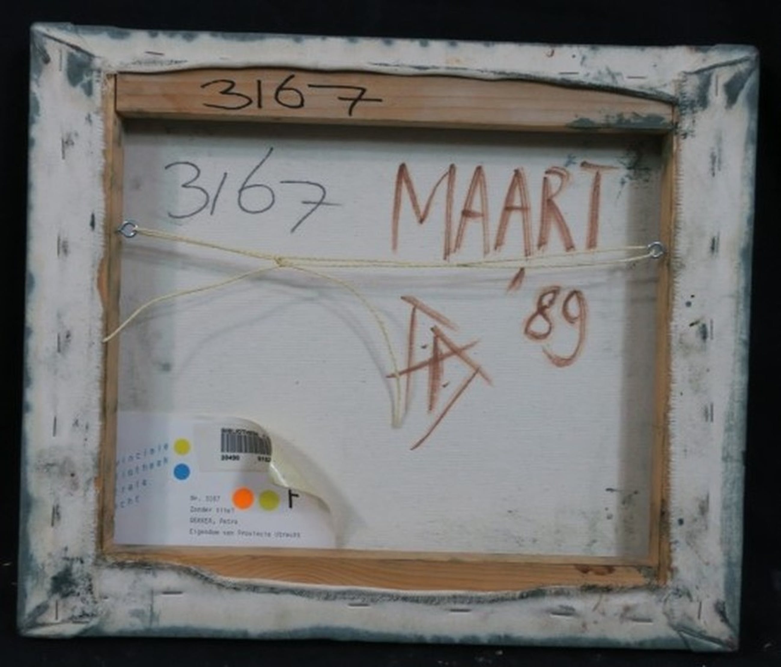 Conditie: In goede staat, maar met wat lichte beschadigingen langs de randen en een kraslijn in de verflaag van boven naar beneden aan beide zijkanten van het beeld (zichtbaar op de foto).