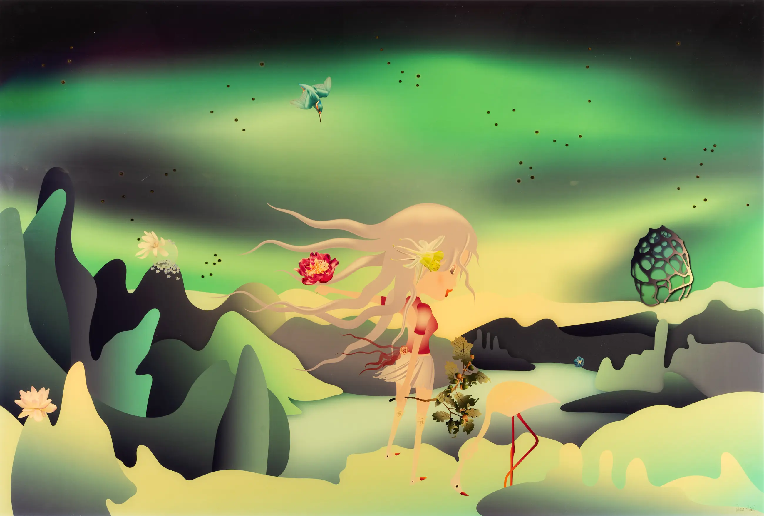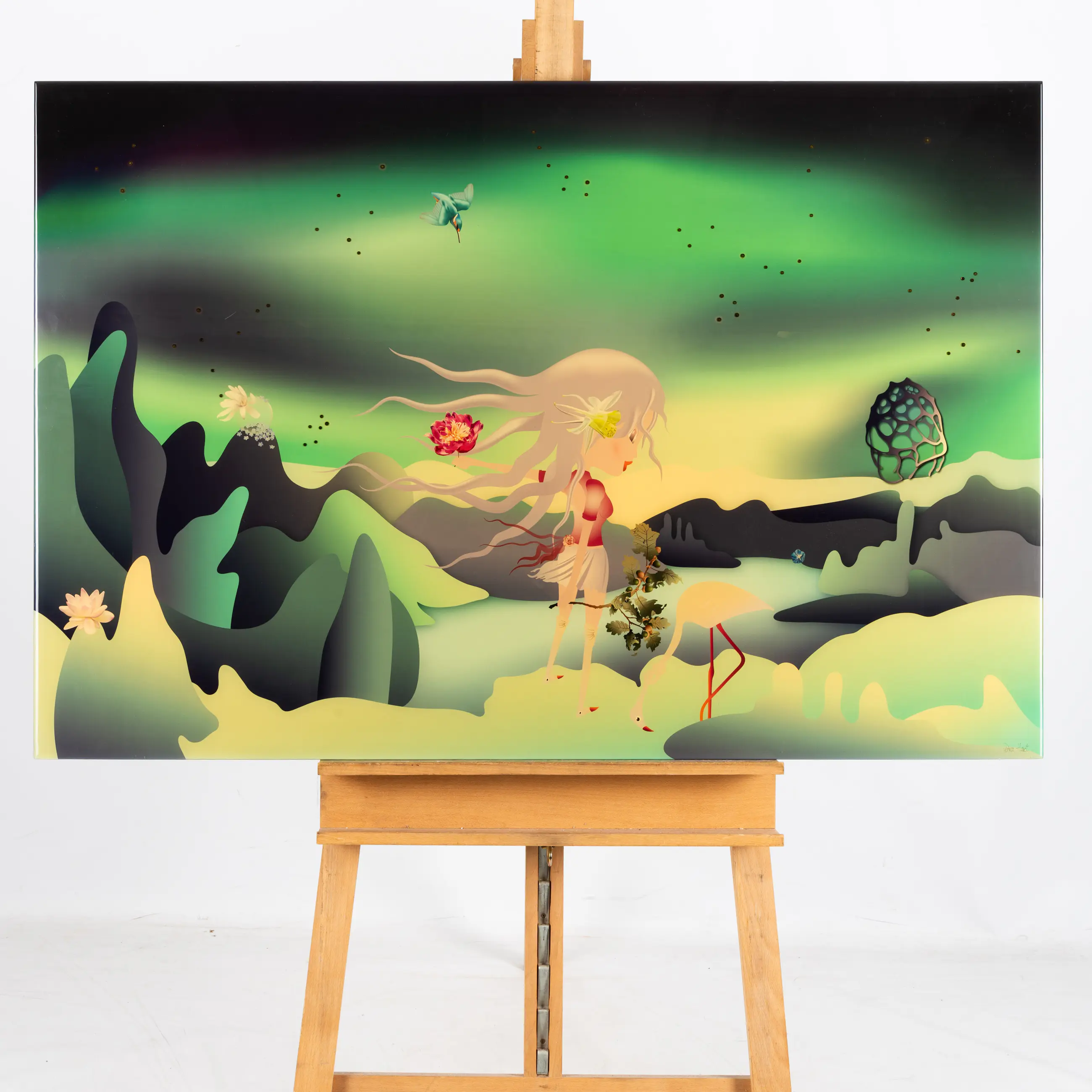 Dit werk is een digitaal schilderij, geprint op liquid glass en verrijkt met Swarovski-kristallen. Het toont een vrouwelijk figuur met een flamingo en een vogel in een abstracte, natuurlijke omgeving.