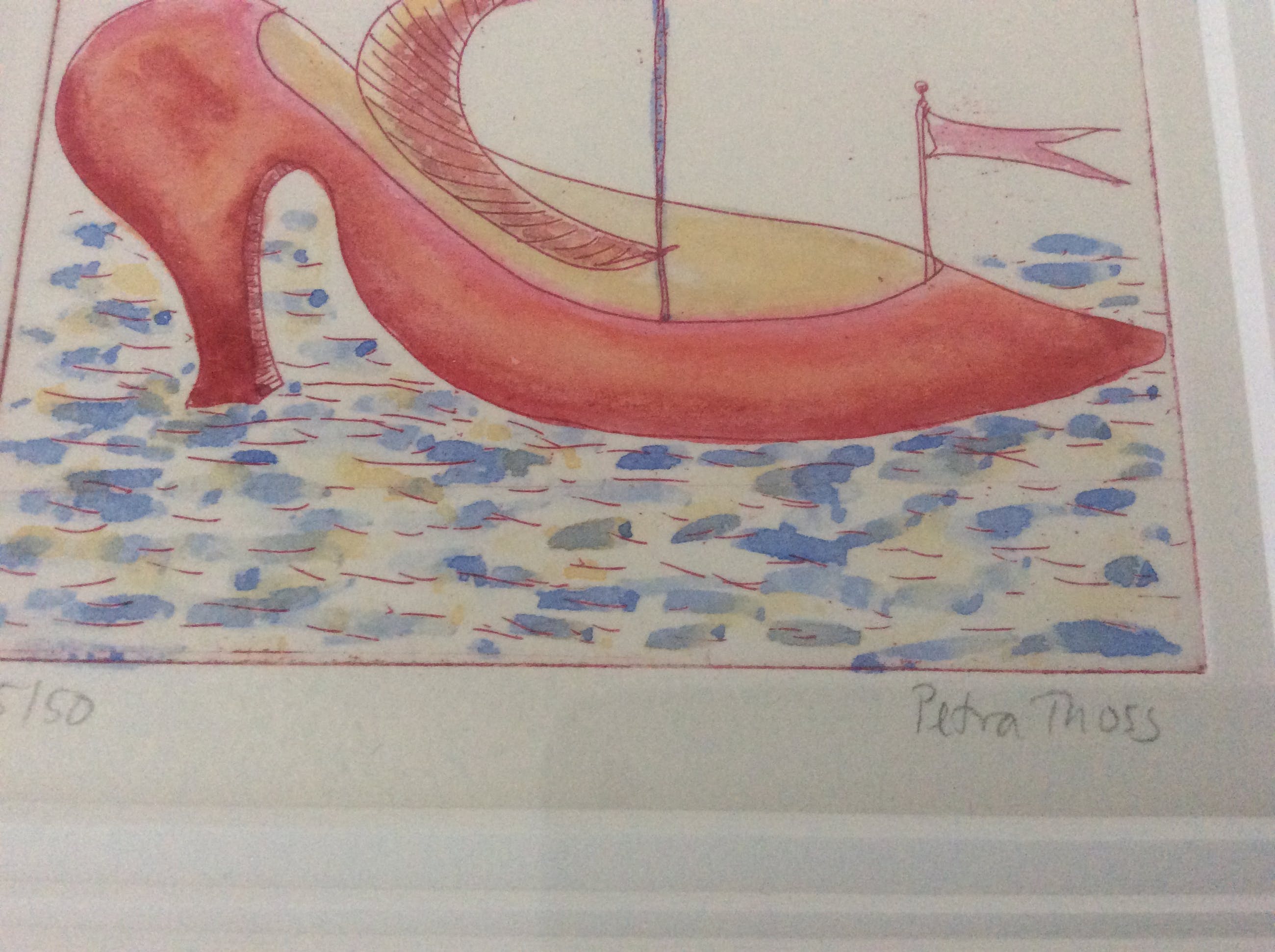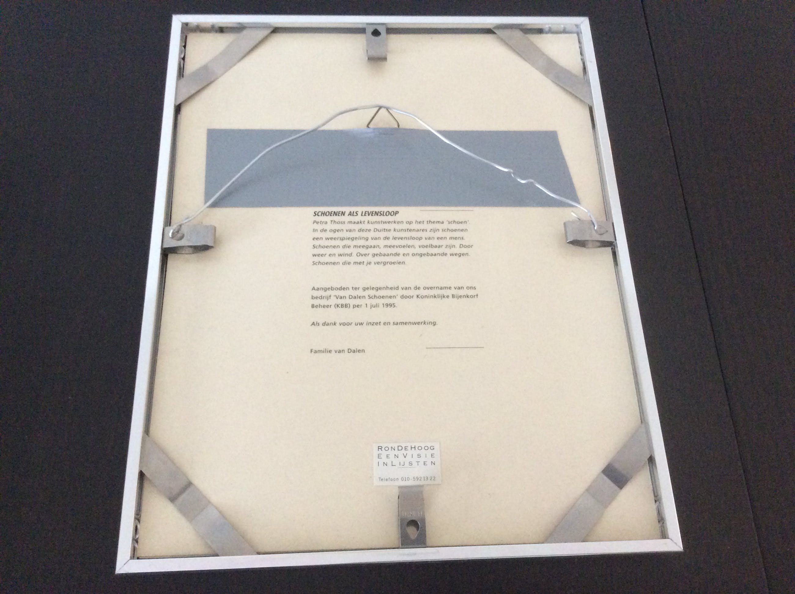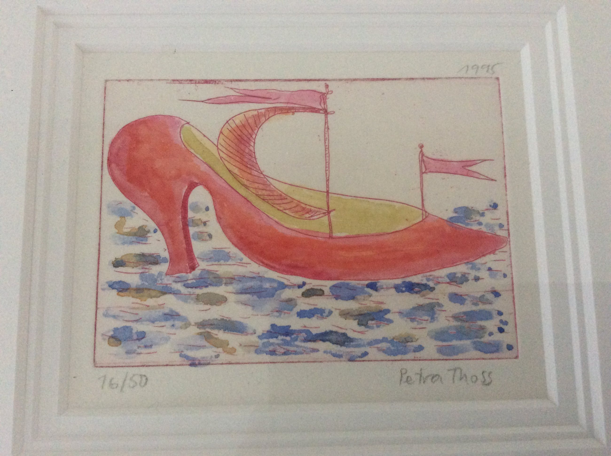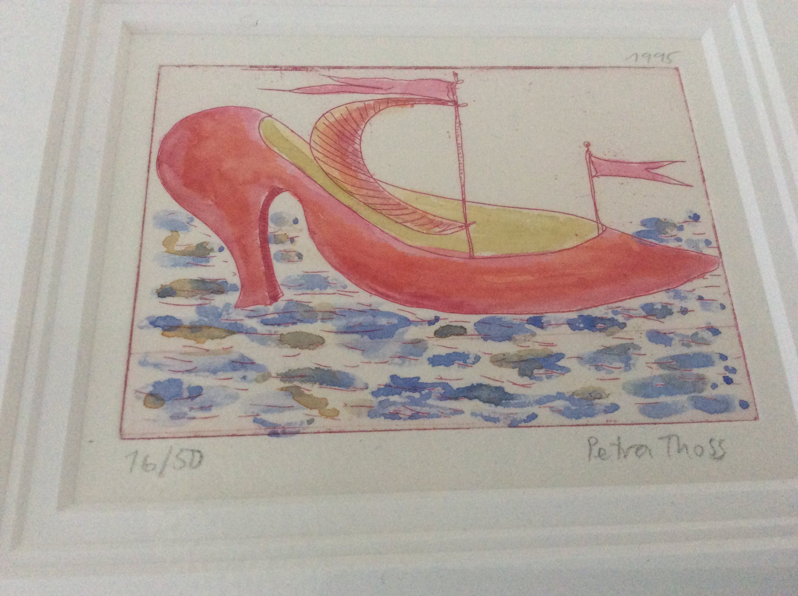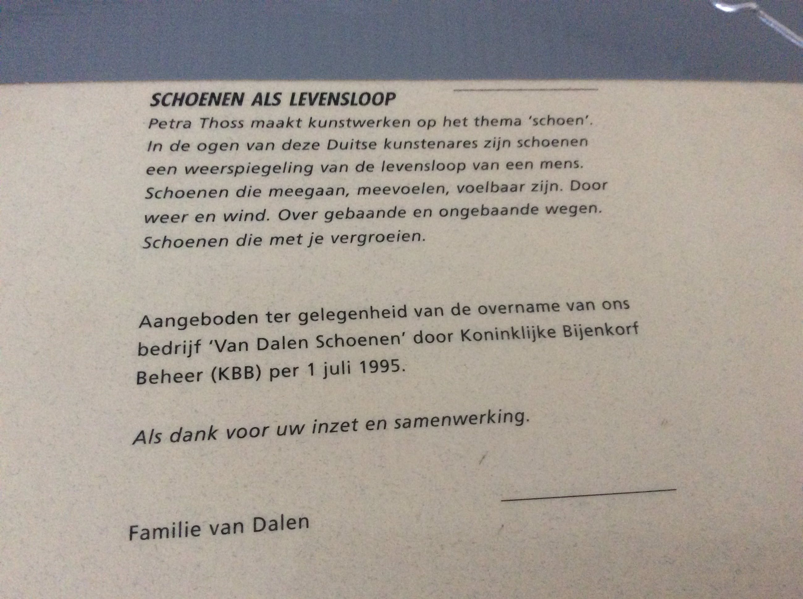 Petra Thoss maakt kunstwerken op het thema ‘schoen’ in de ogen van deze Duitse kunstenares zijn schoenen een weerspiegeling van de levensloop van een mens. Schoenen die meegaan,meevoelen,voelbaar zijn. Door weer en wind.Over gebaande en ongebaande wegen. Schoenen die je vergroeien.