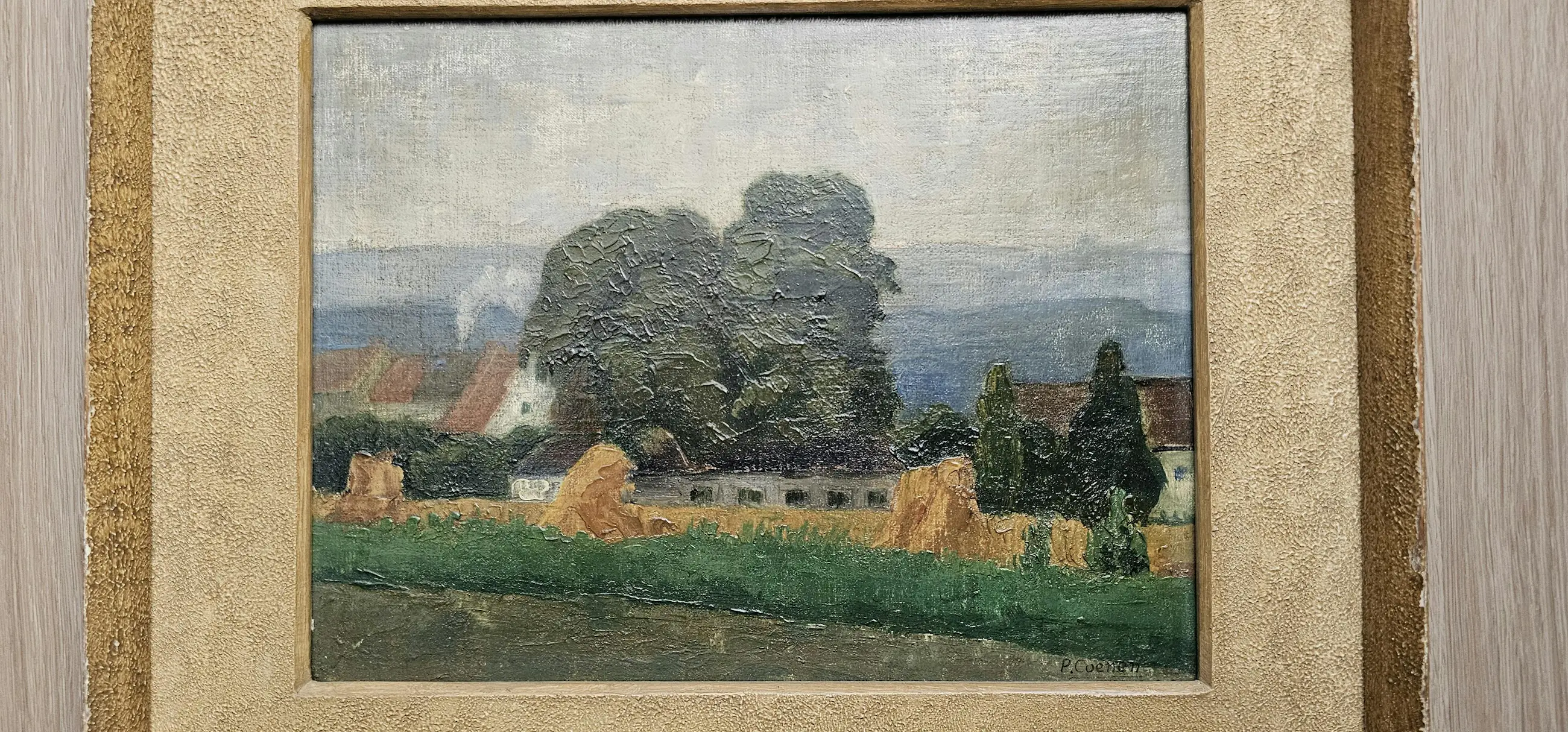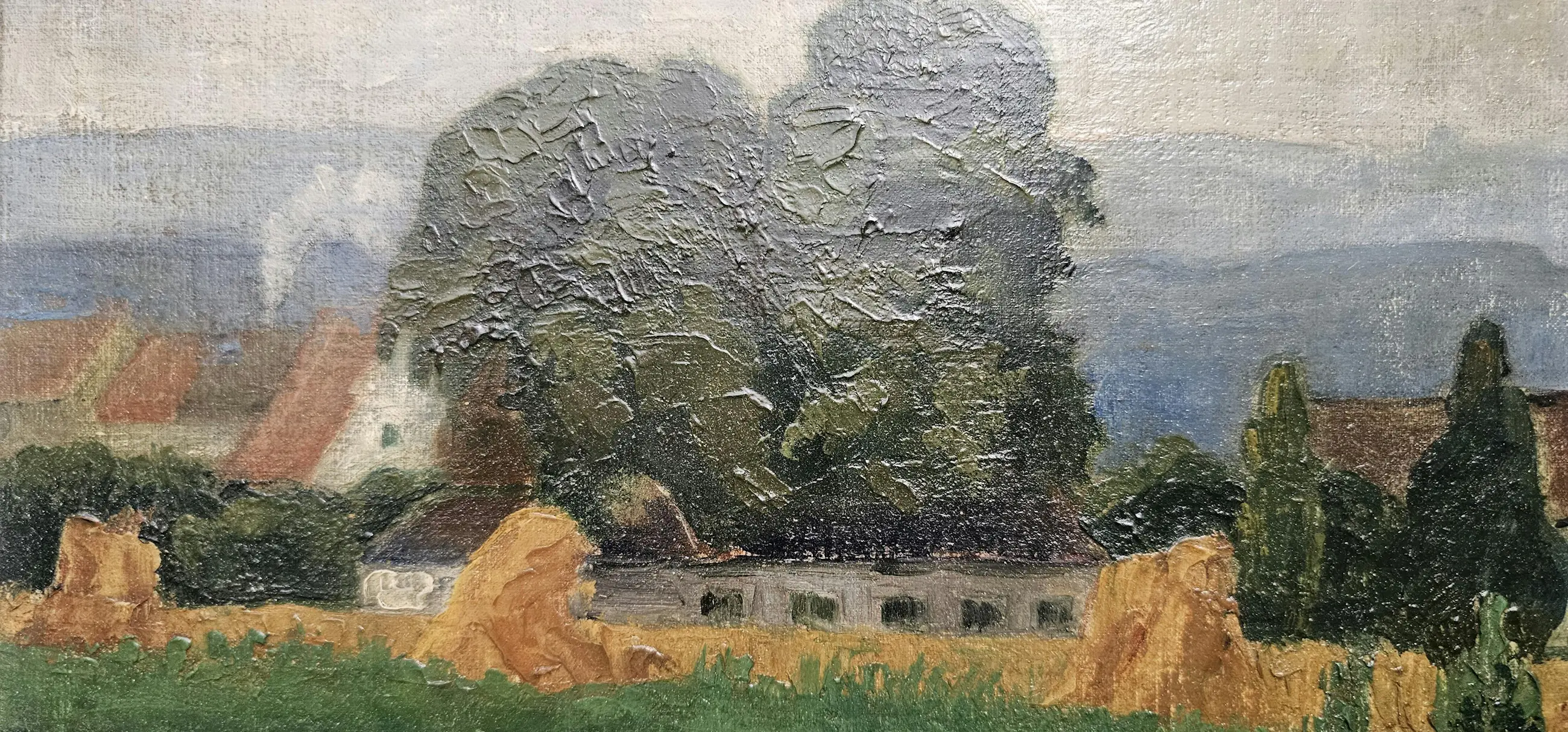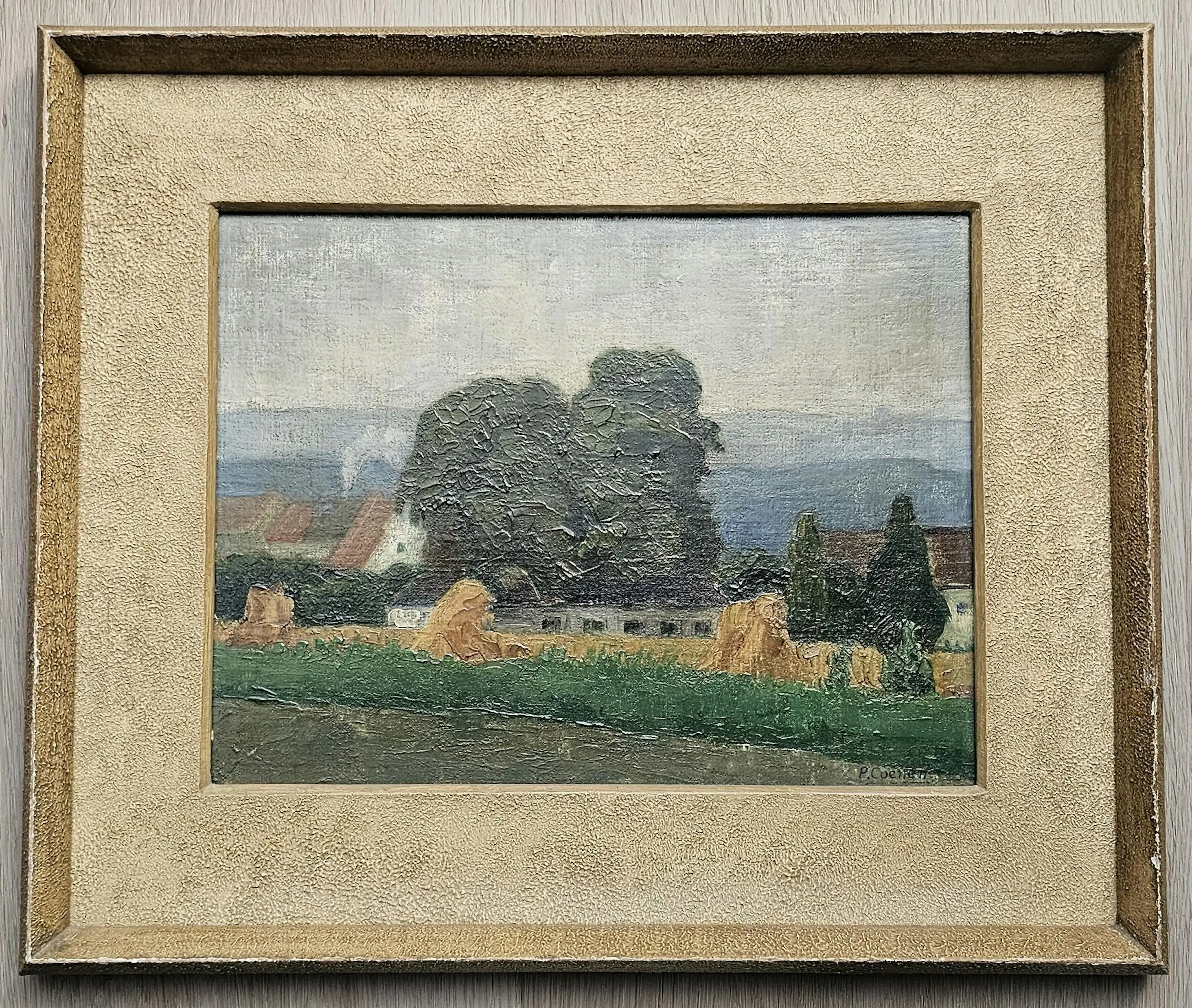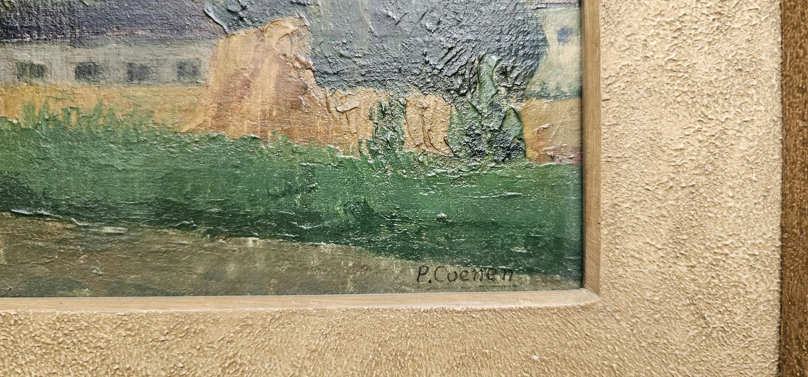 Een schattig Limburgs landschap tafereel in olieverf op een paneel, ingelijst.