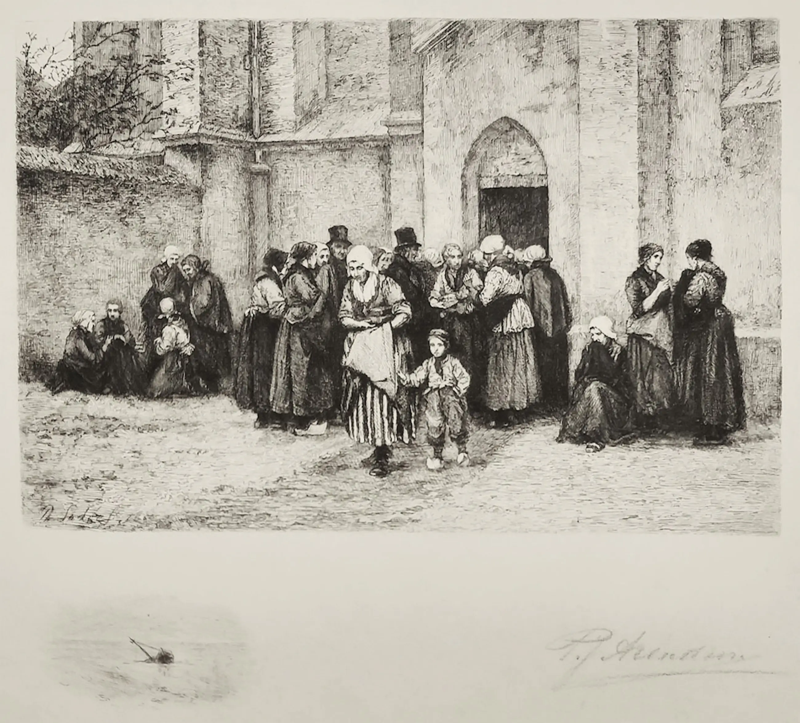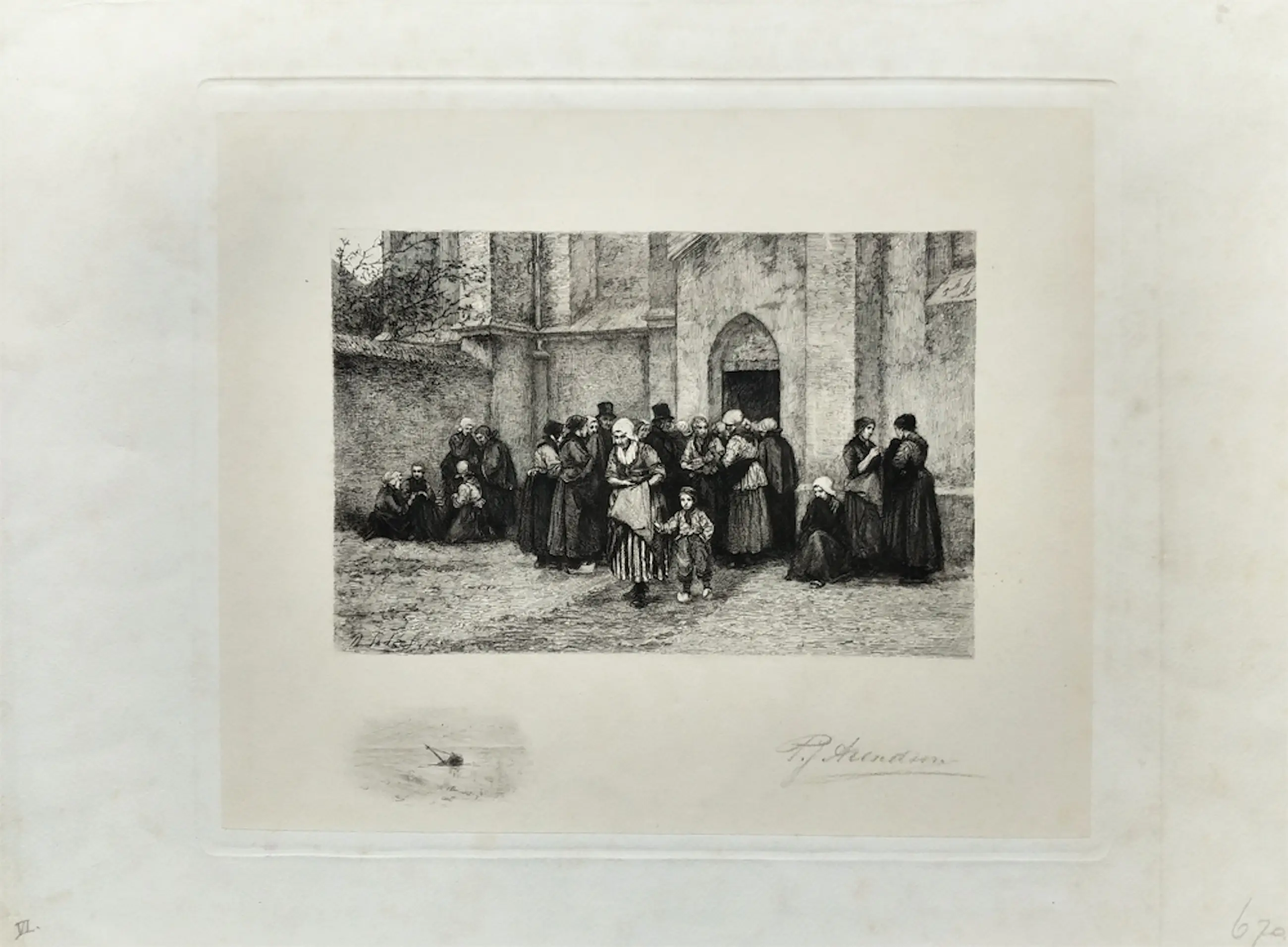 Ets van Petrus Johannes Arendzen. Afgebeeld zijn armen bij een kerk die brood krijgen. Het werk is rechtsonder gesigneerd met 'P.J. Arendzen'. Het blad is 35 centimeter hoog en 48 centimeter breed.