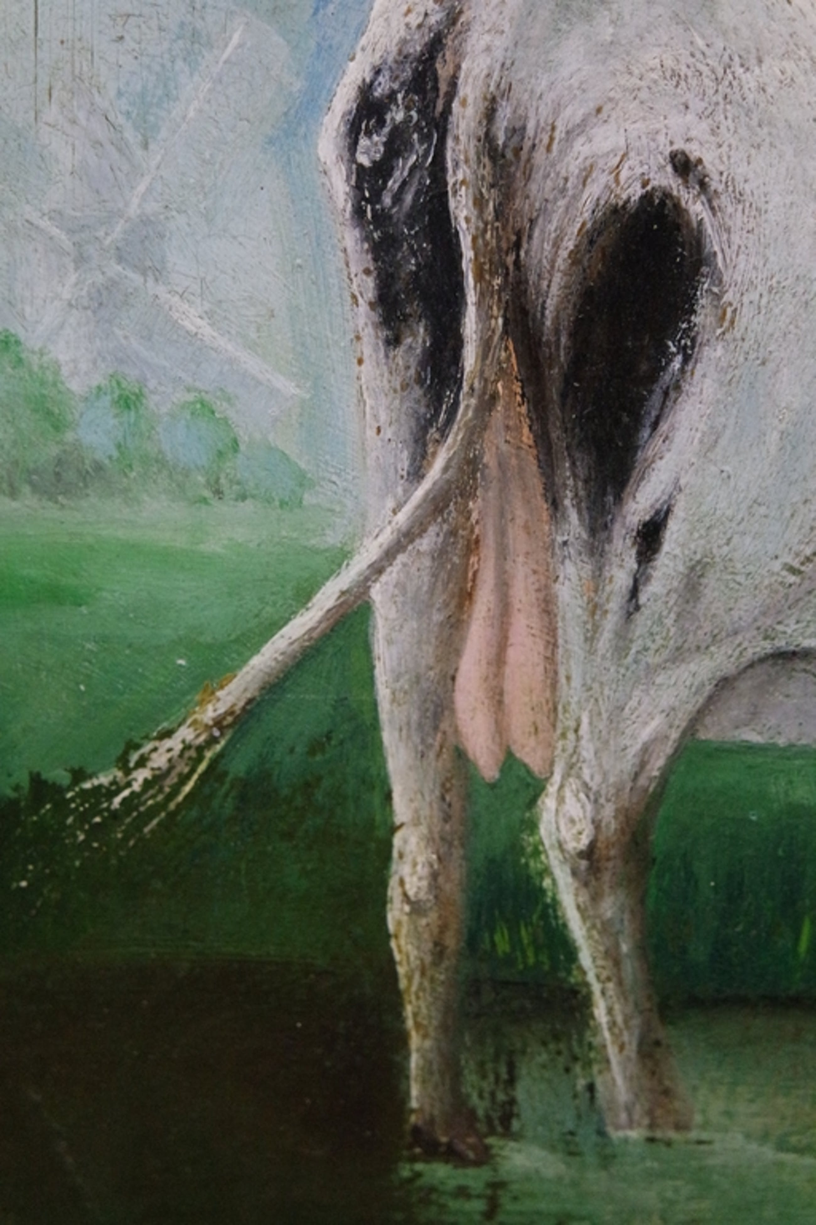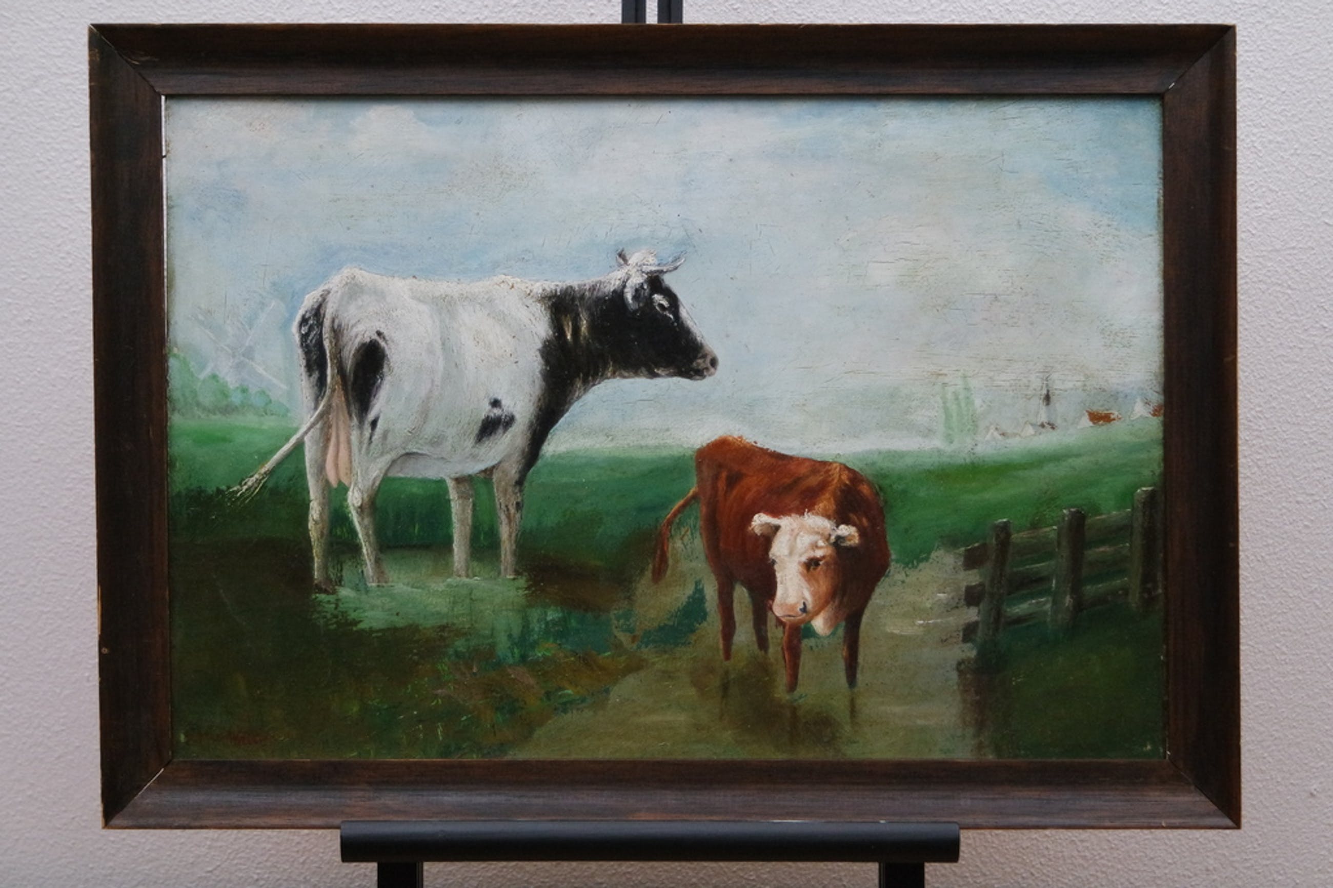 Een prachtig veegezicht met 2 koeien van de oude kunstenaar P.M. van Walcheren. Gesigneerd l.o. Afmetingen: 50 cm. x 35 cm. ( met lijst ). Conditie paneel: gezien de leeftijd goed. Het schilderij wordt verzekerd verzonden. Afhalen is een optie.