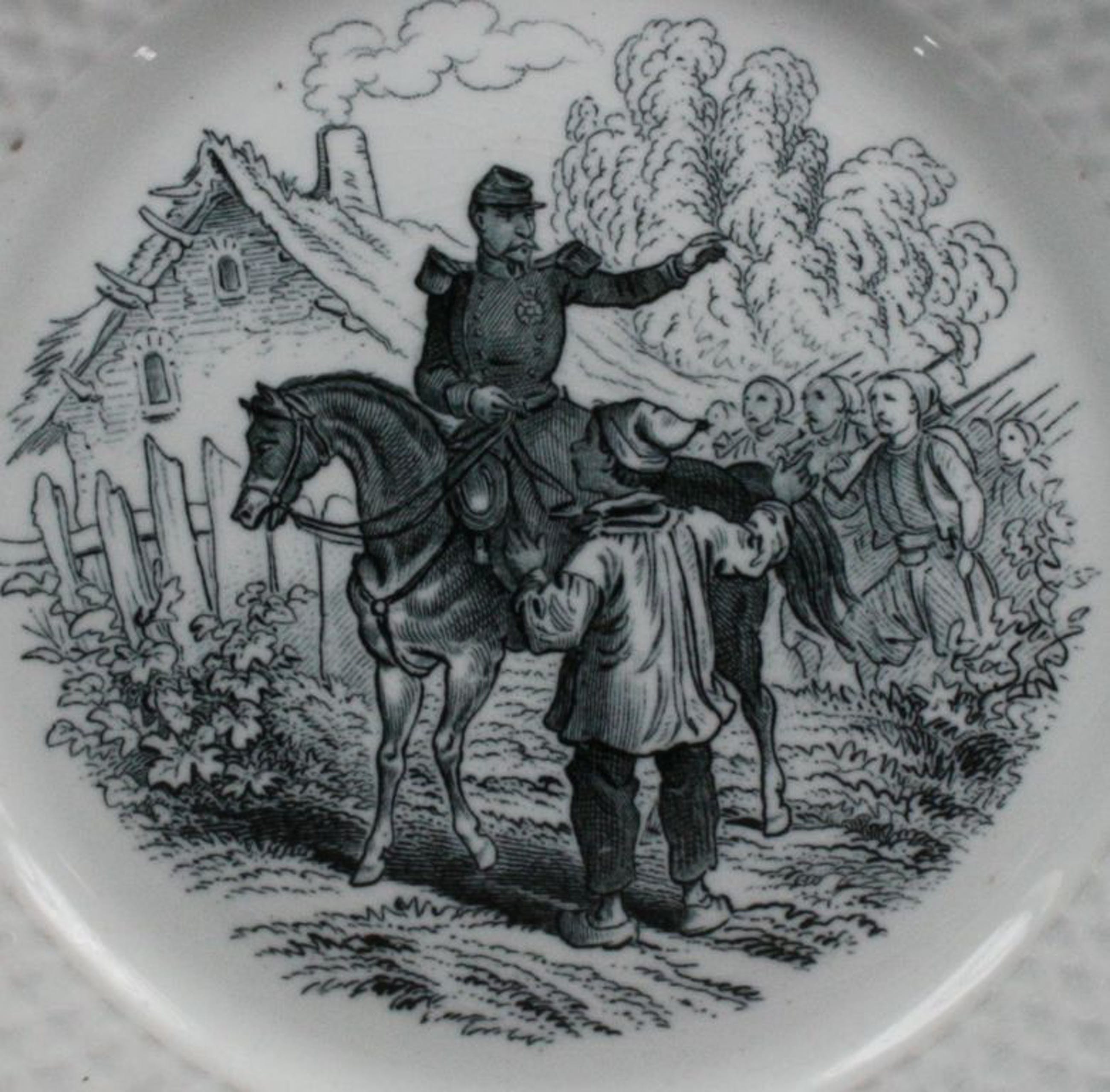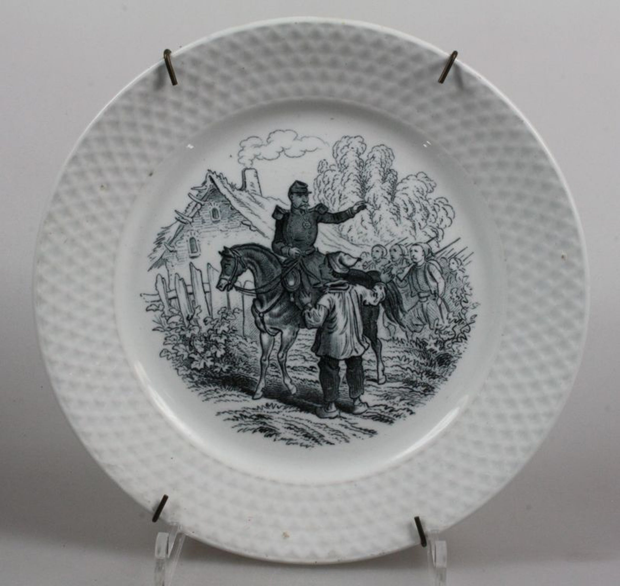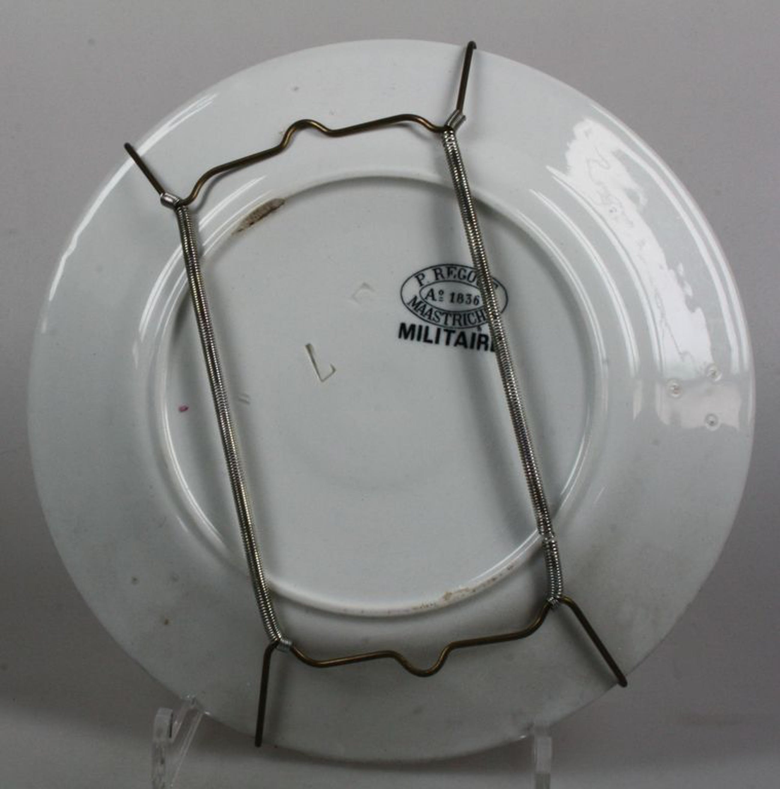 Antiek bordje van Petrus Regout Masstricht. Decor Militaire dat tussen 1879-1909 gebruikt is. Diameter 19.5 cm. Eind 19e eeuw. In goede conditie, aan achterzijde een tweetal oneffenheden aan standring.