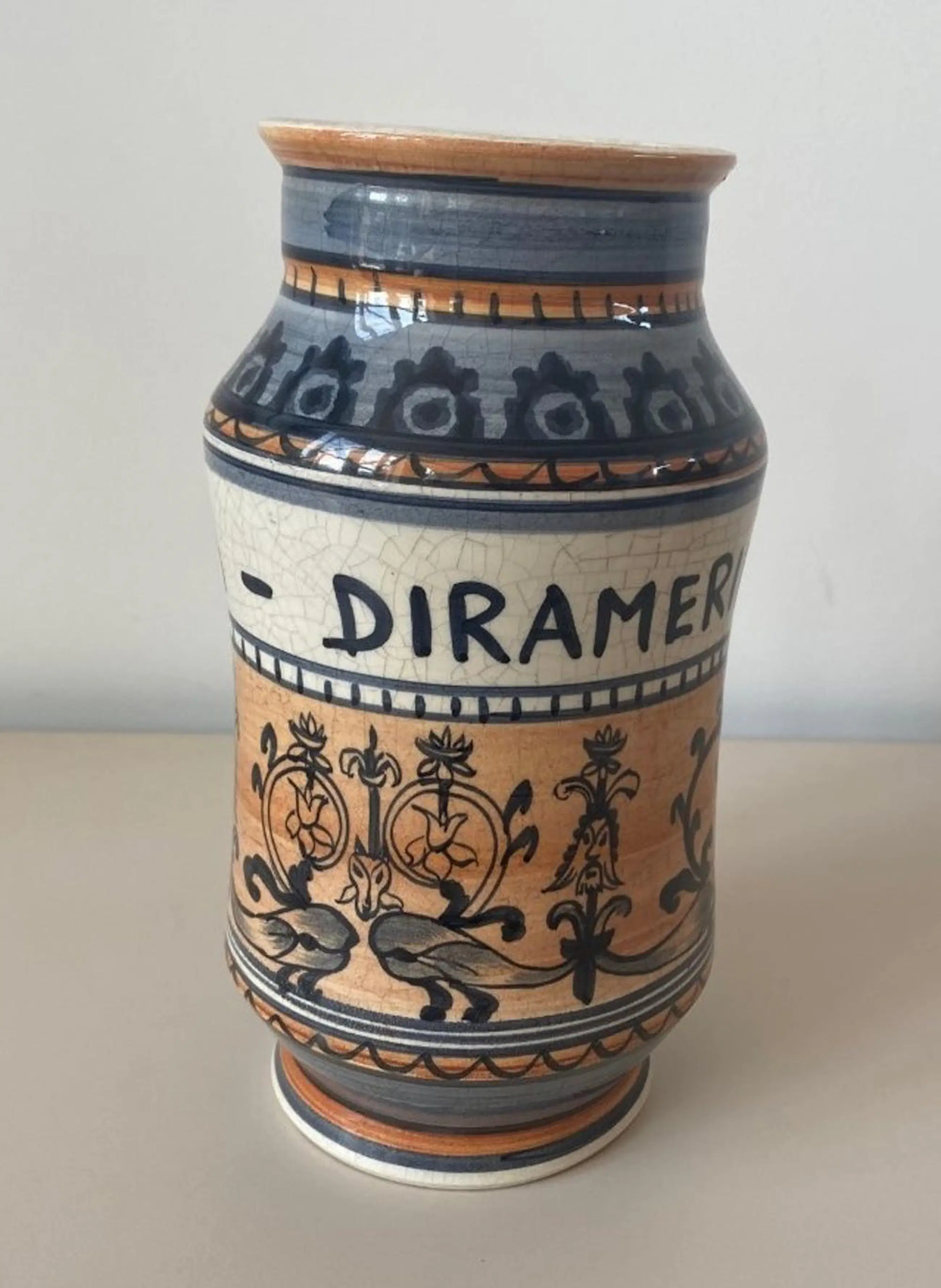 Mooie handbeschilderde aardewerken apothekerspot van het kunst aardewerken atelier van prof. Petucco e Tolio, Nove Vicenza. In zeer goede conditie, alleen het glazuur heeft wat craquelé. Voorzien van merksticker on de onderkant.