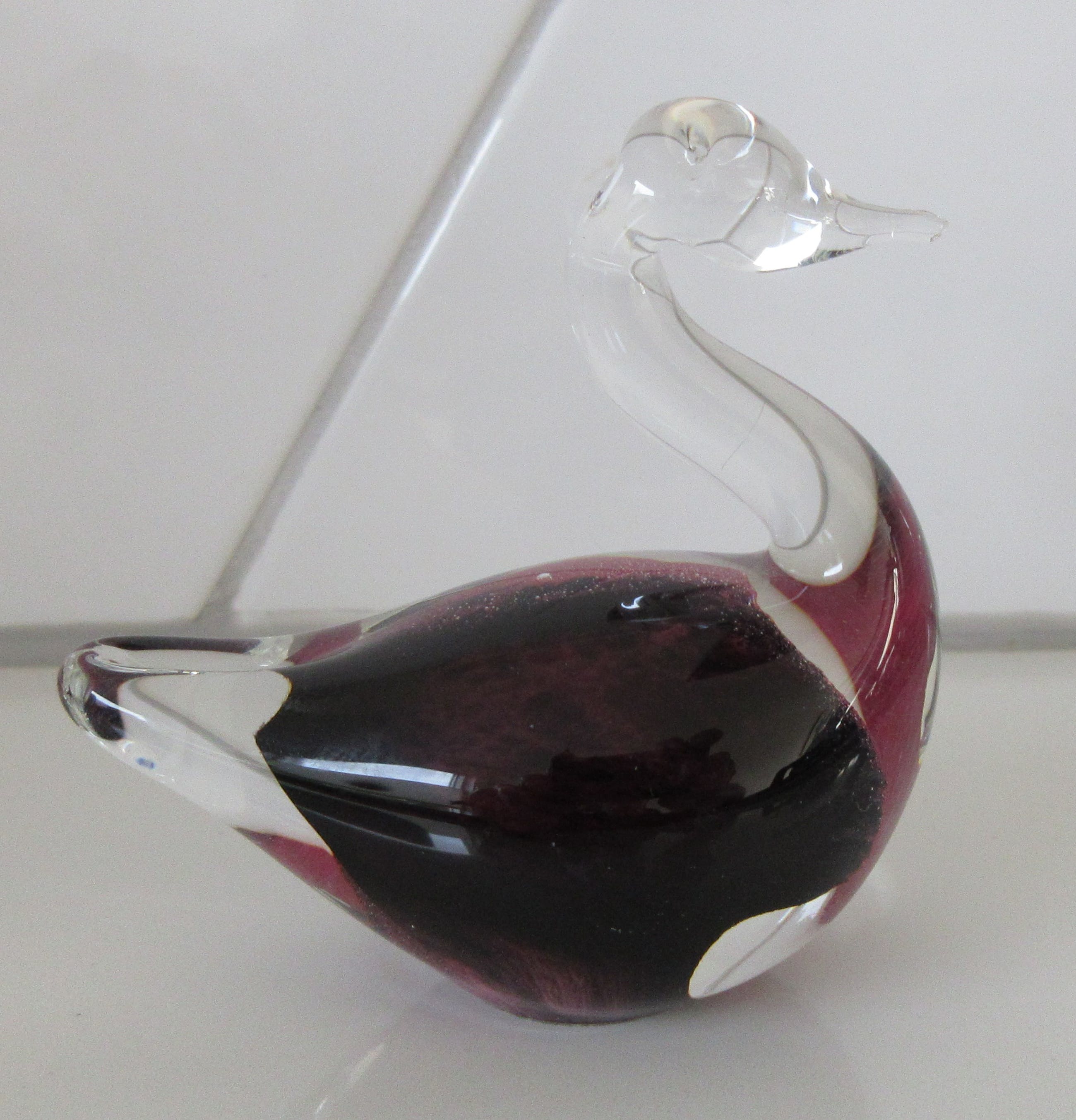 Kristallen figuurtje van een zwaan met paarse ingesloten glaspoeders, uitvoering Pfeiffer kristal. Gemerkt met een sticker op de onderzijde.
