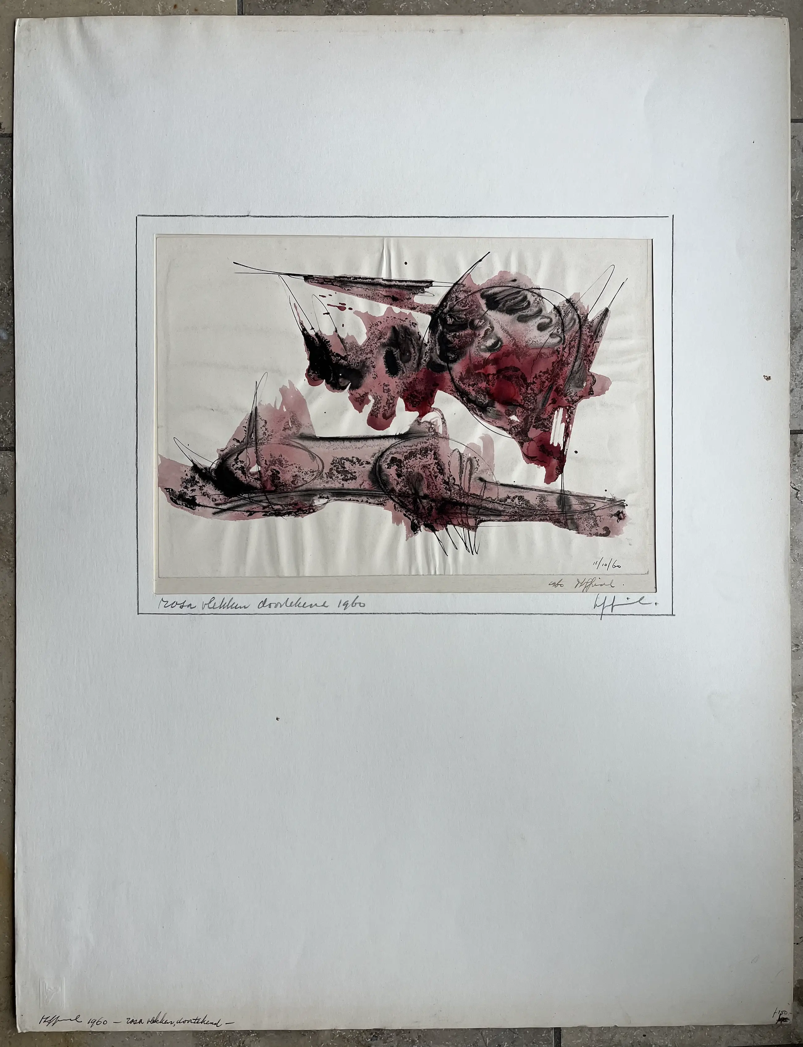 Mooi aquarel van de Nederlandse kunstenaar Phil Grisel. Dubbel gesigneerd. Titel: 'Rosa vlekken, doortekend" Bevestigd op papier. Met papieren passe partout.