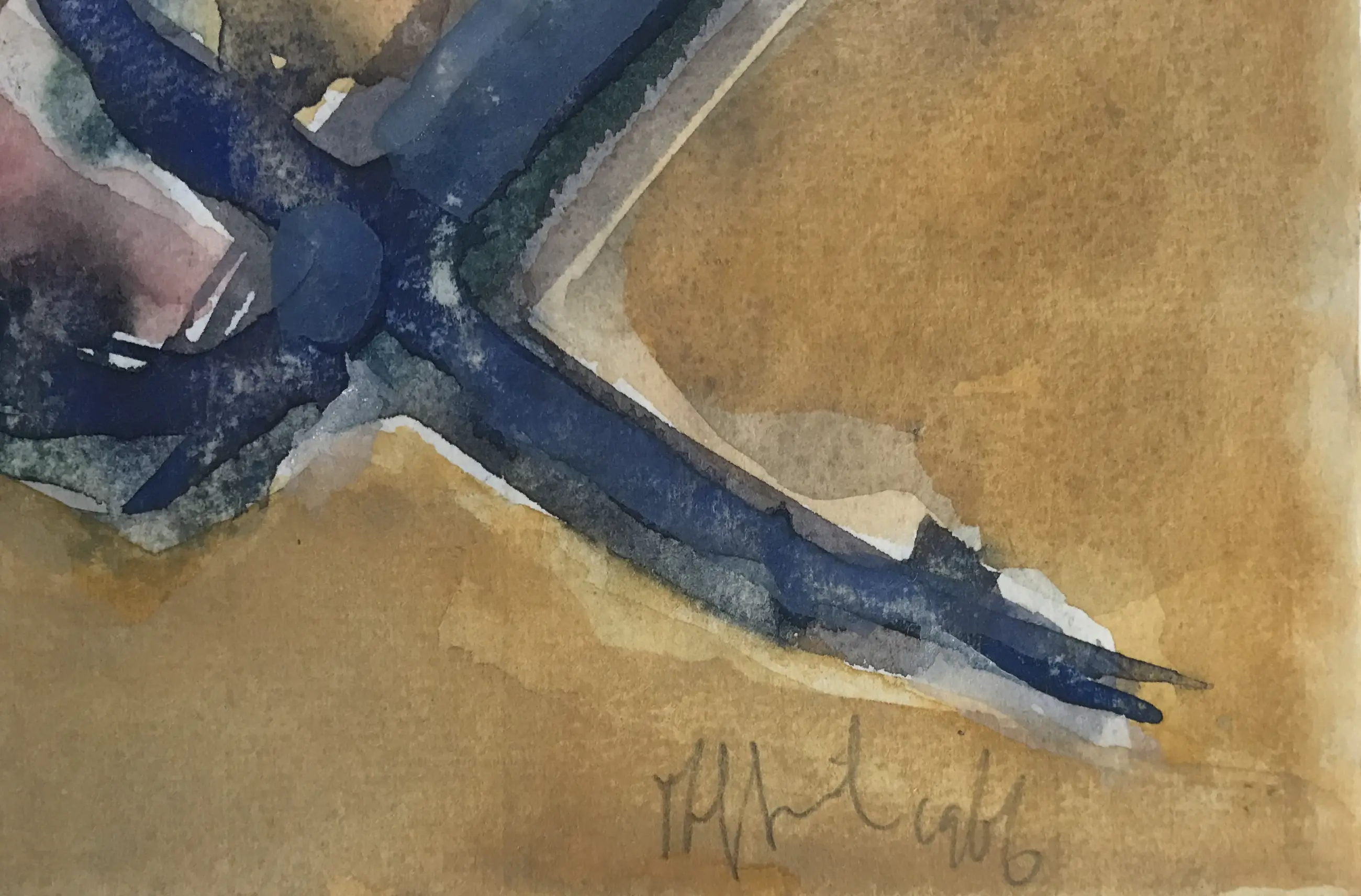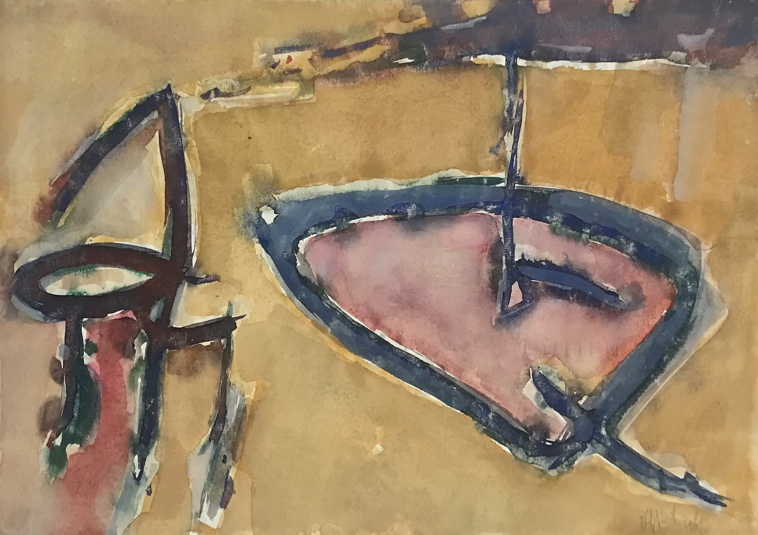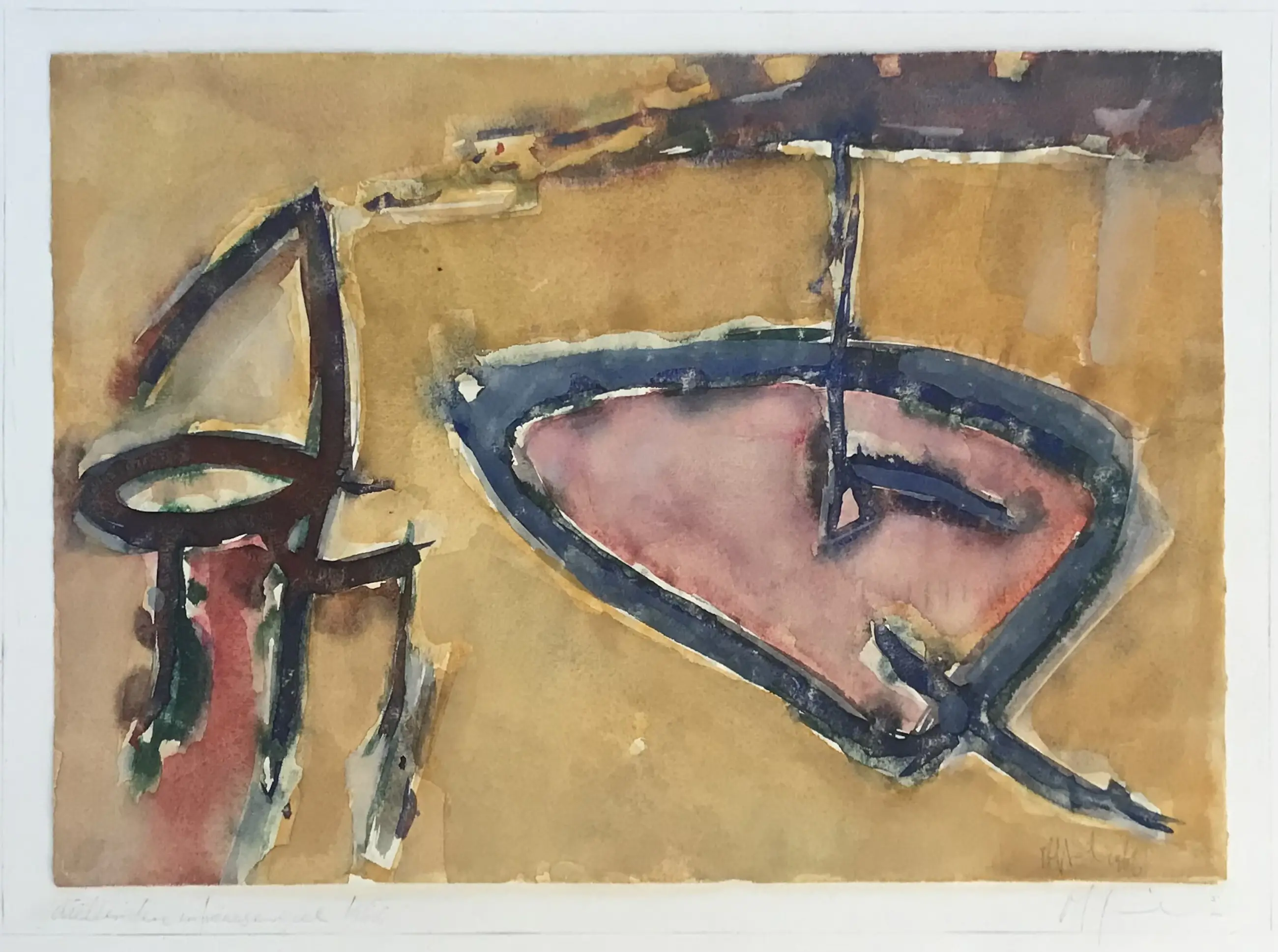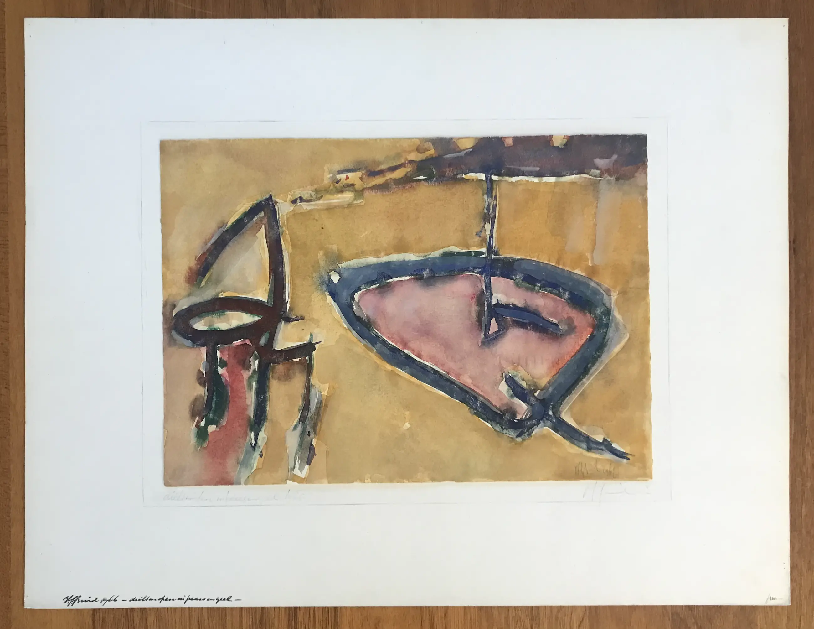 Mooi aquarel van de Nederlandse kunstenaar Phil Grisel. Kubistische interpretatie van "Dicht en open in paars en geel".