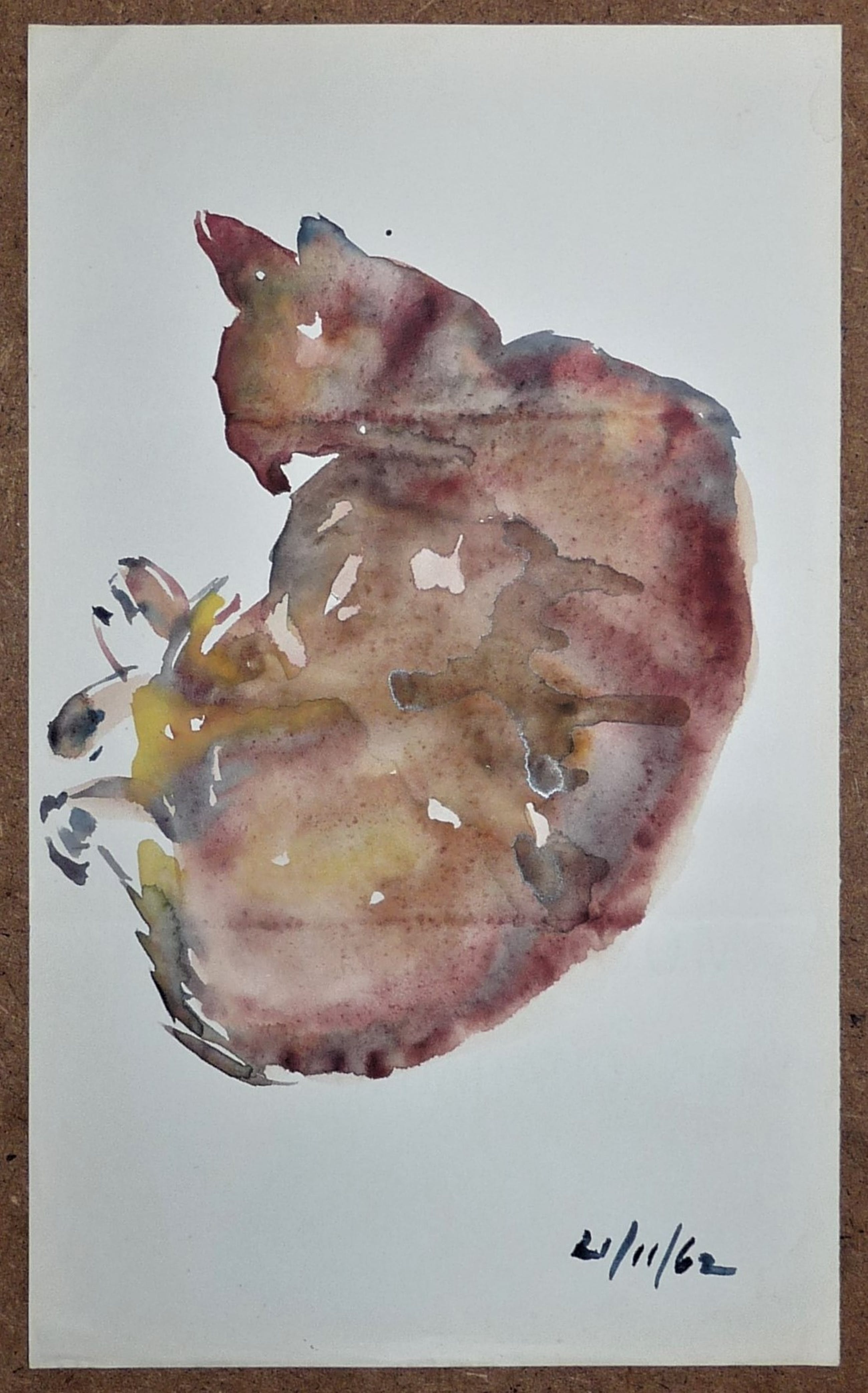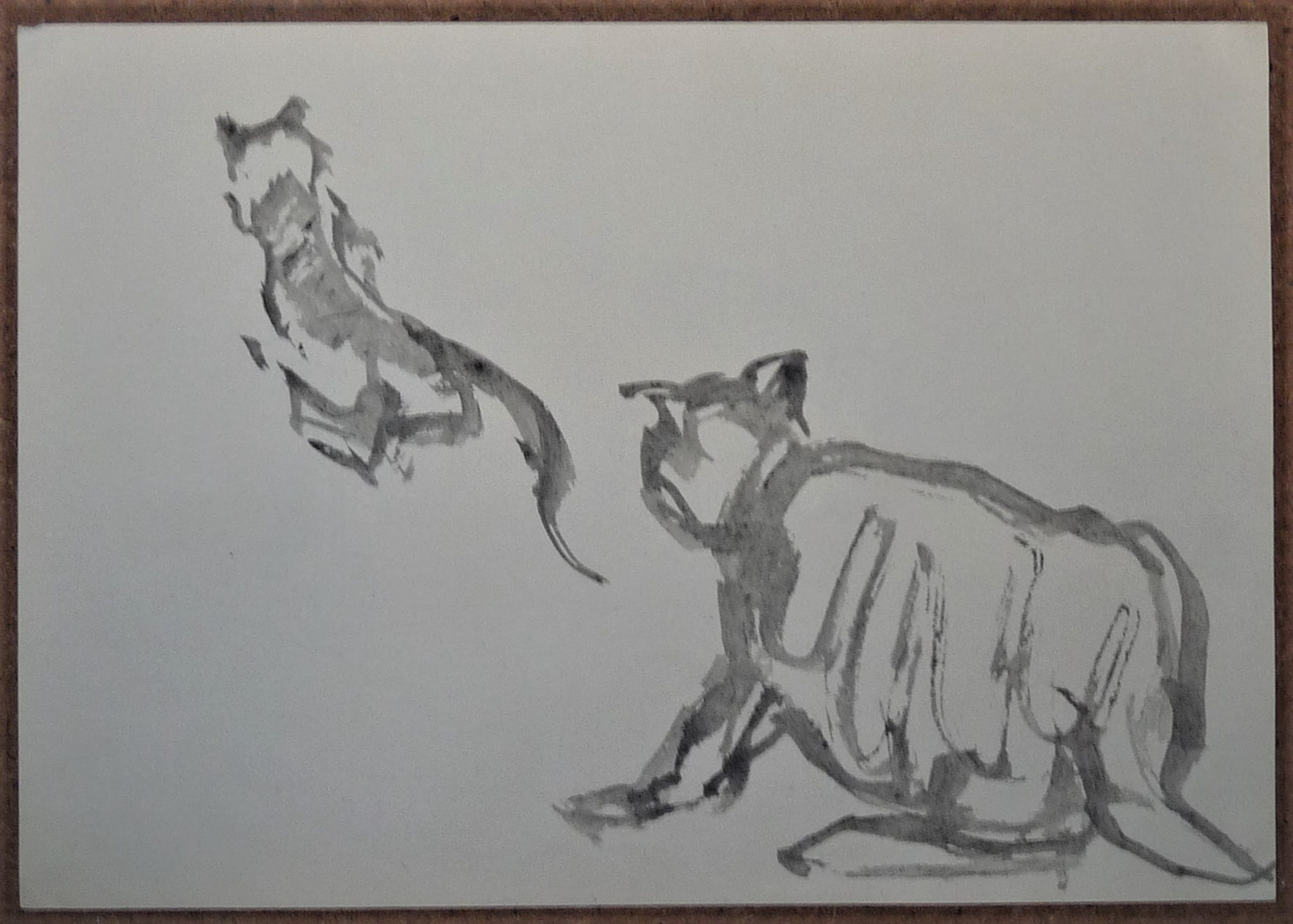 * Bijzondere aquarel van een kat + een gewassen oost-indische inkt tekening van de Nederlandse kunstenaar Phil Grisel. De kat van de aquarel heeft scherpe contouren, doch hier binnen vloeien de kleuren van de natte aquarelverf in elkaar, wat het tot een bijzonder werk maakt.