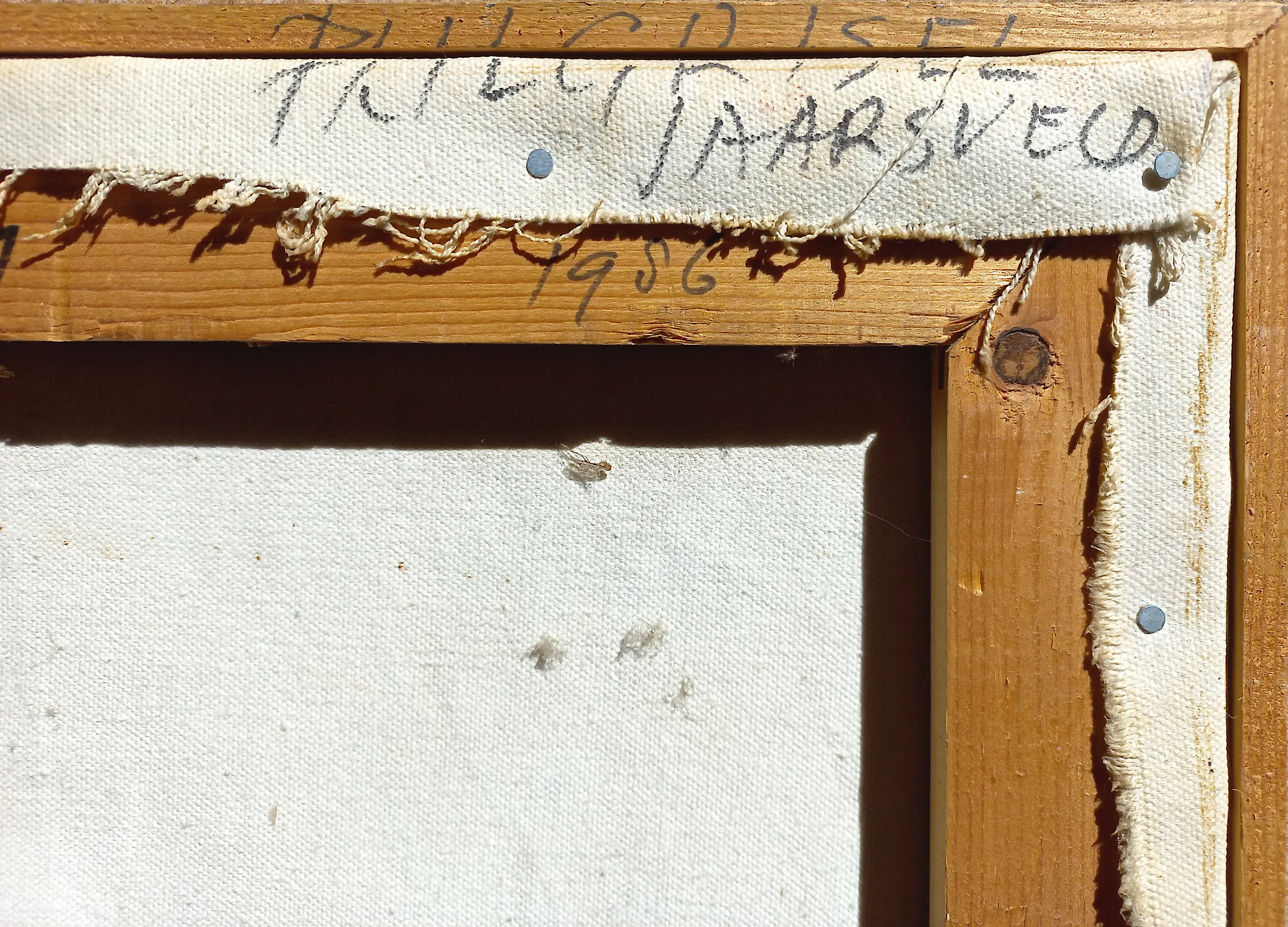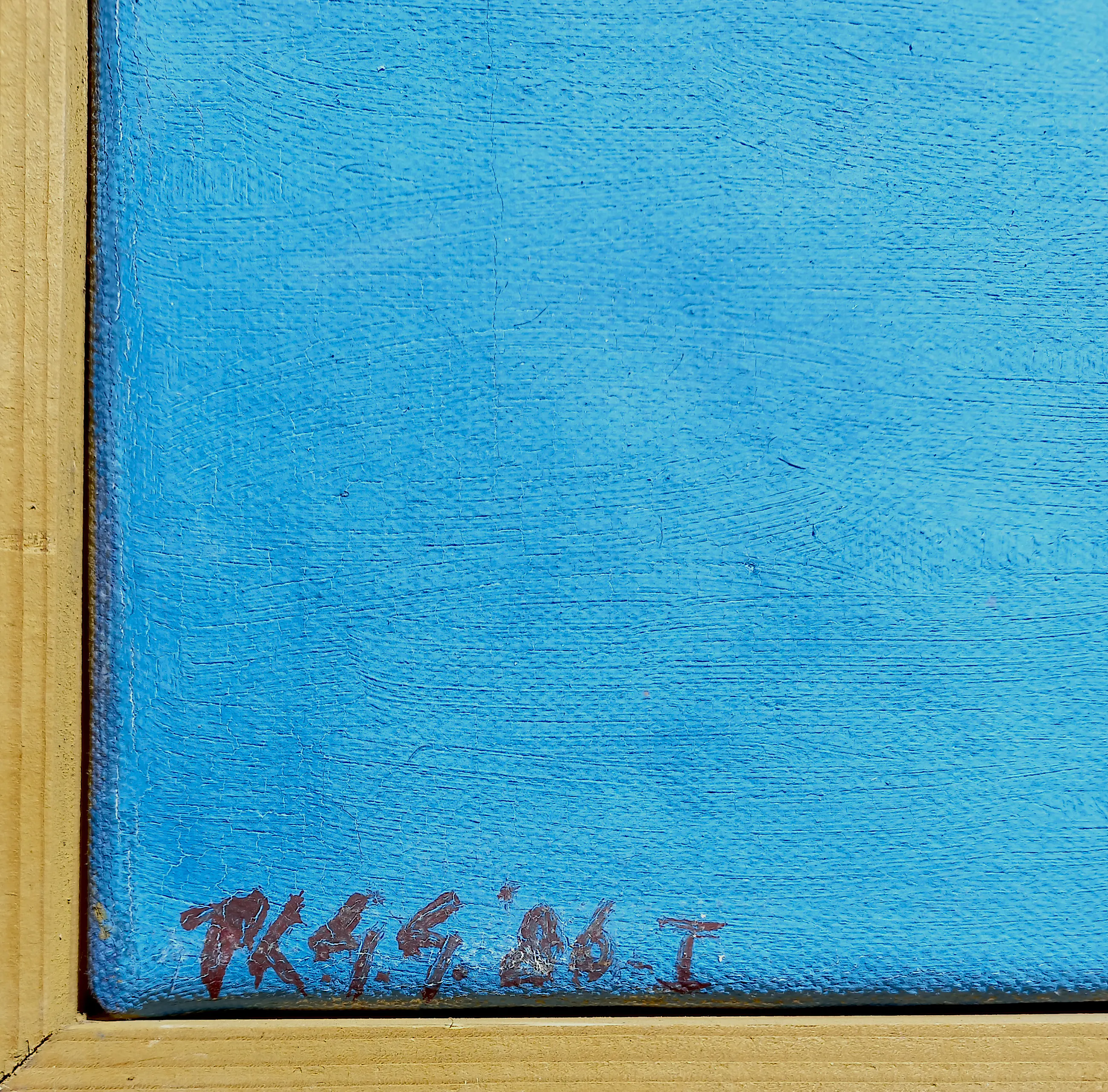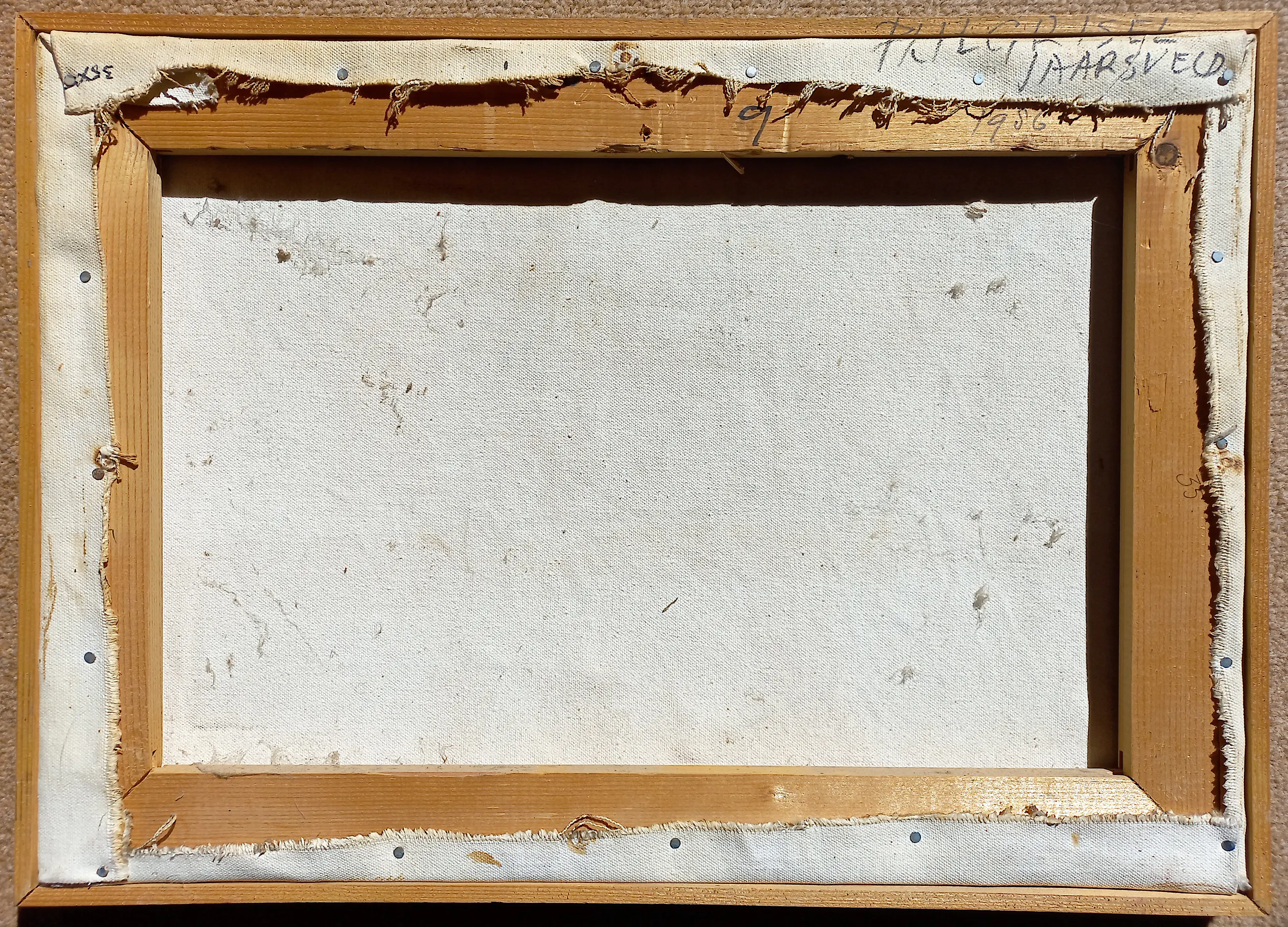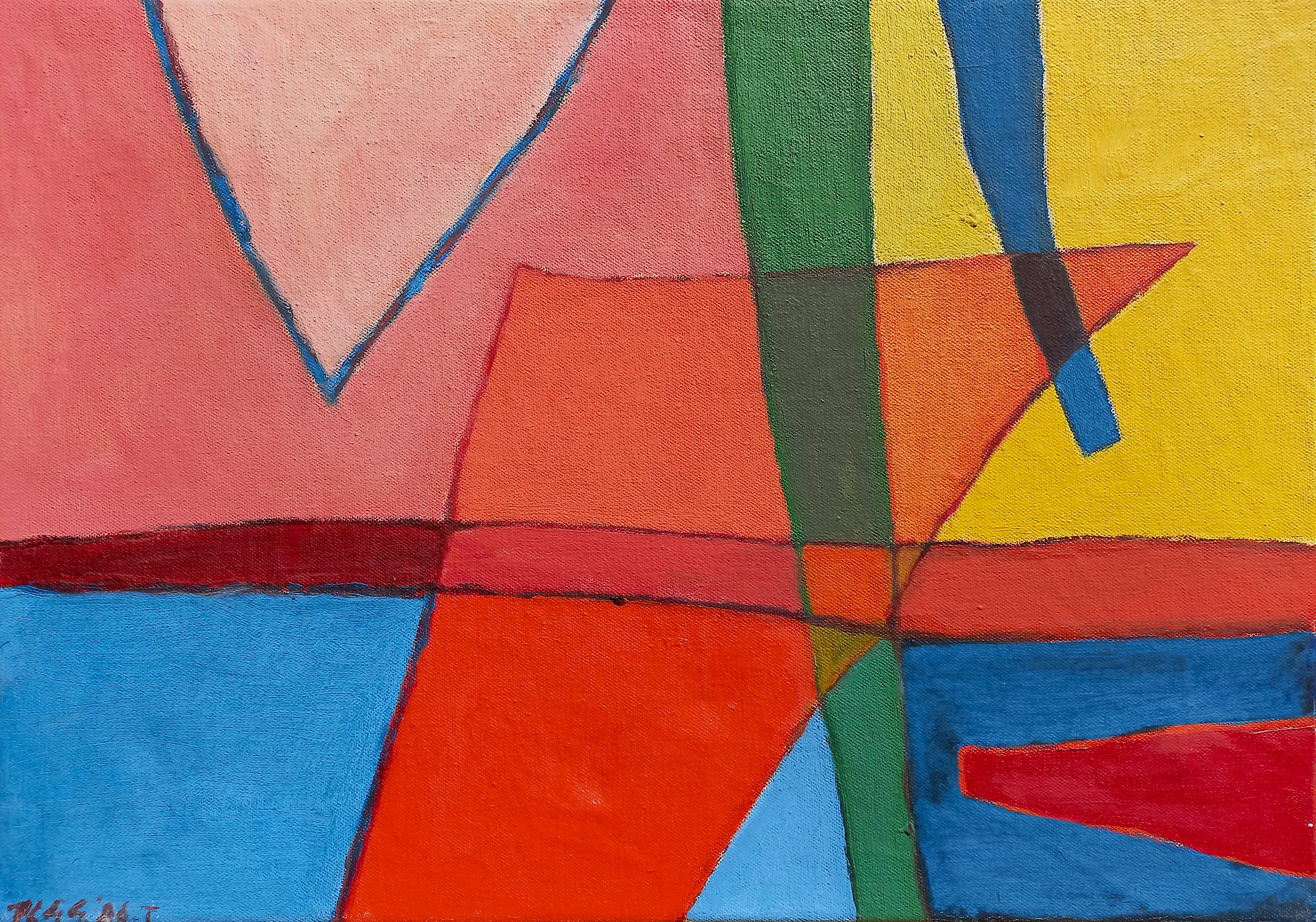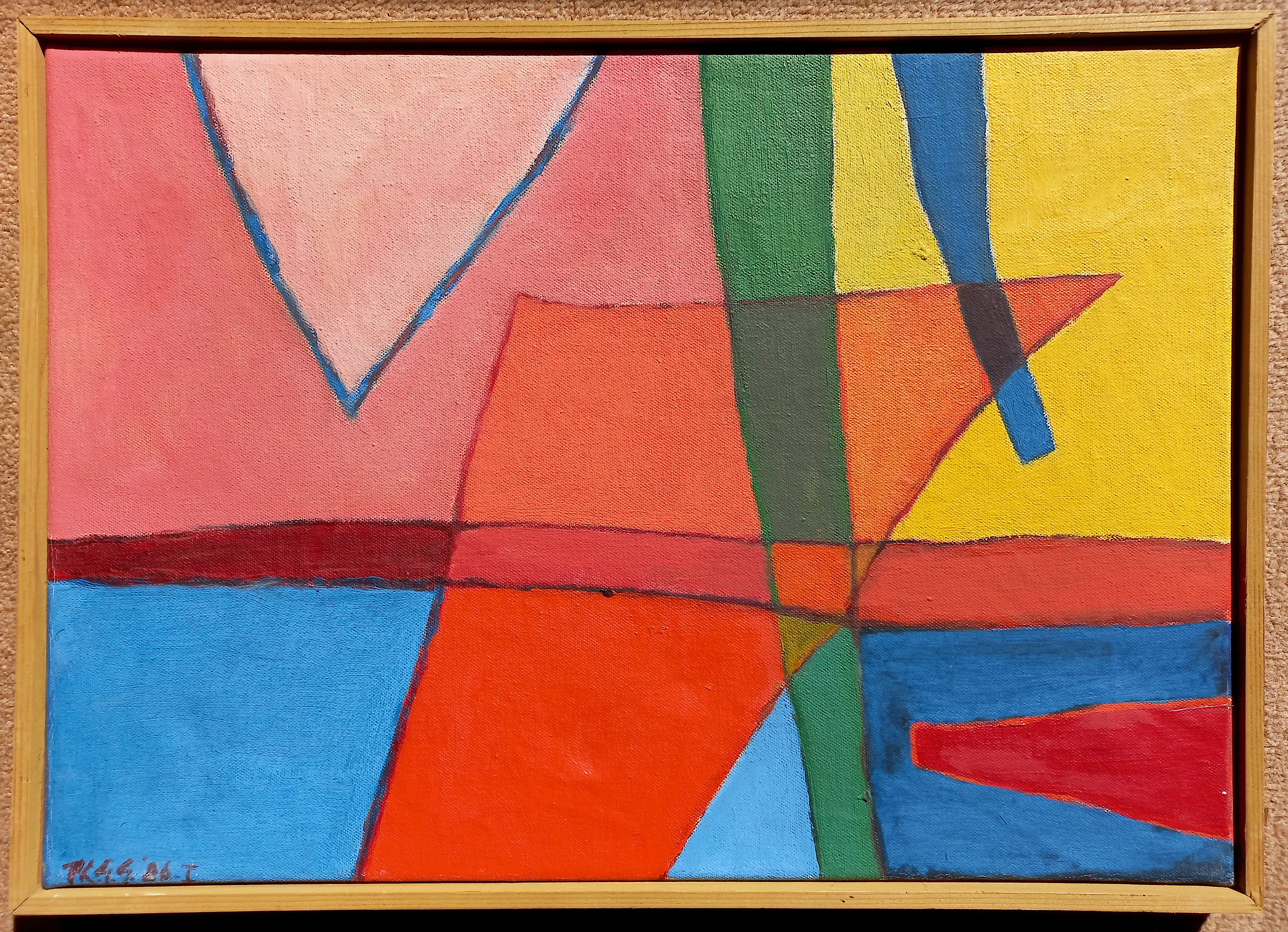 Kleurrijk, abstract werk van Phil Grisel. Olieverf op doek, gemonogrammeerd (Ph.G.G.) en getiteld/gedateerd linksonder. In simpele maar originele lijst, in verso gesitueerd (Jaarsveld) en nogmaals gesigneerd en gedateerd. In zeer goede conditie.