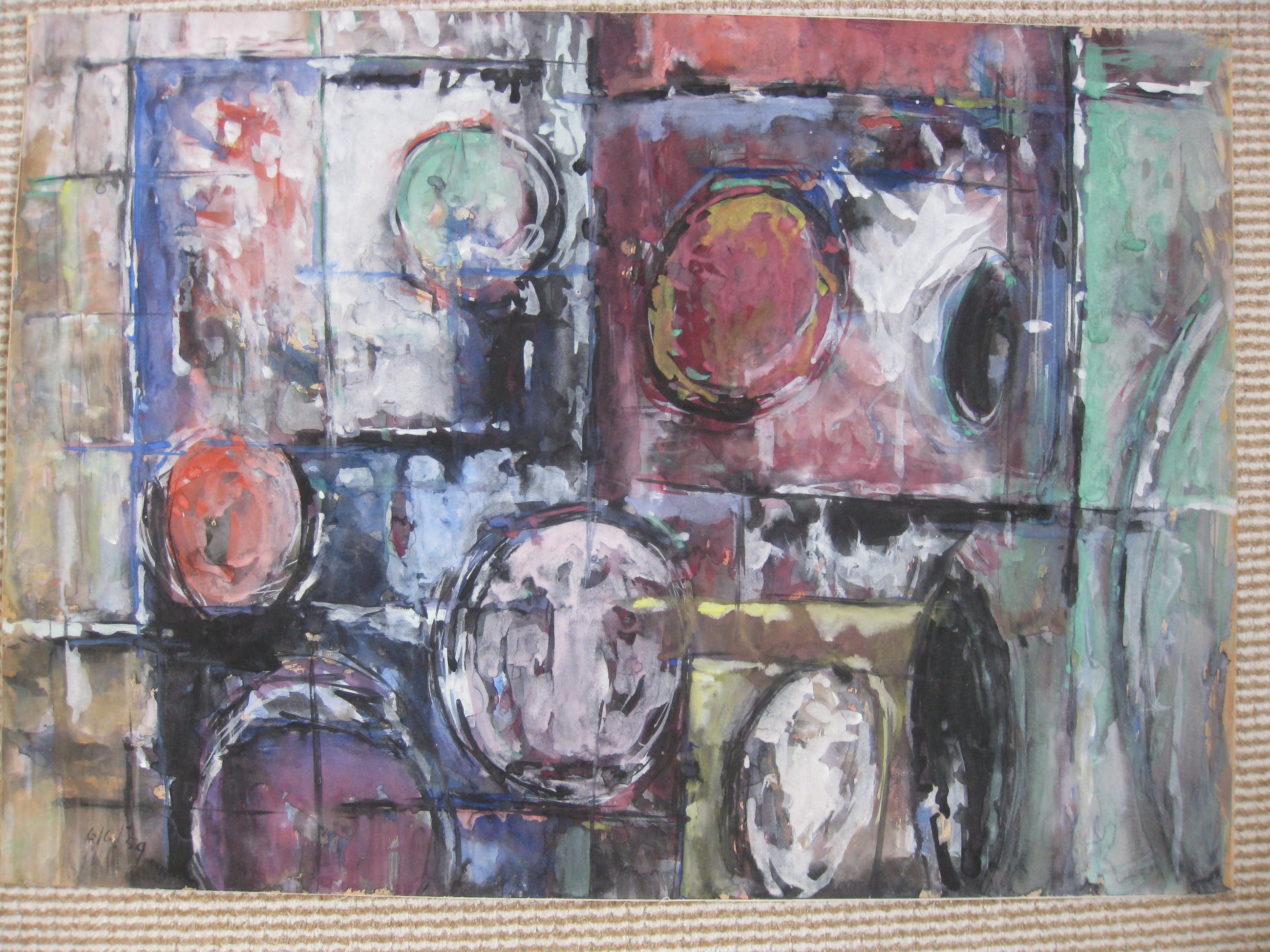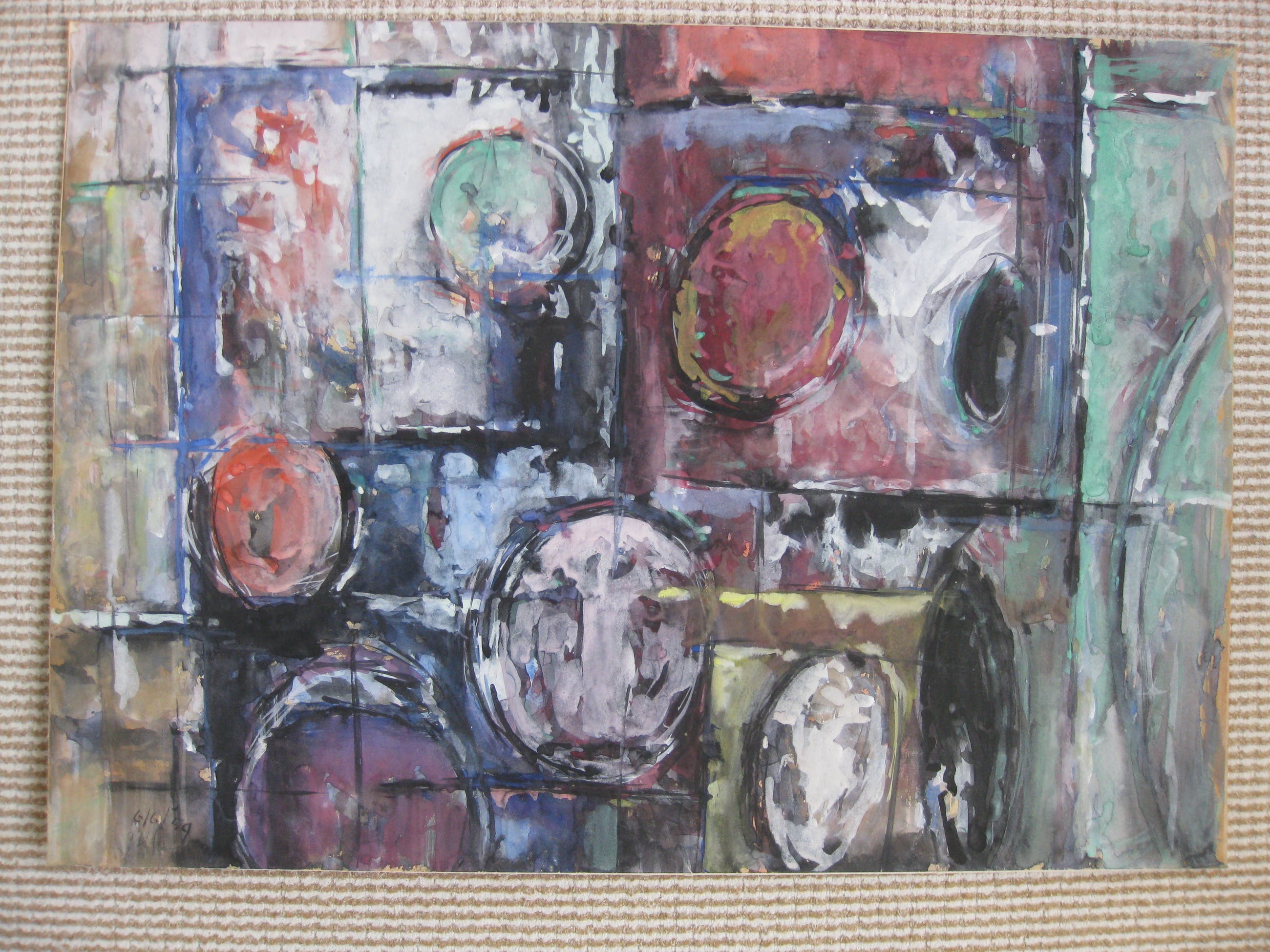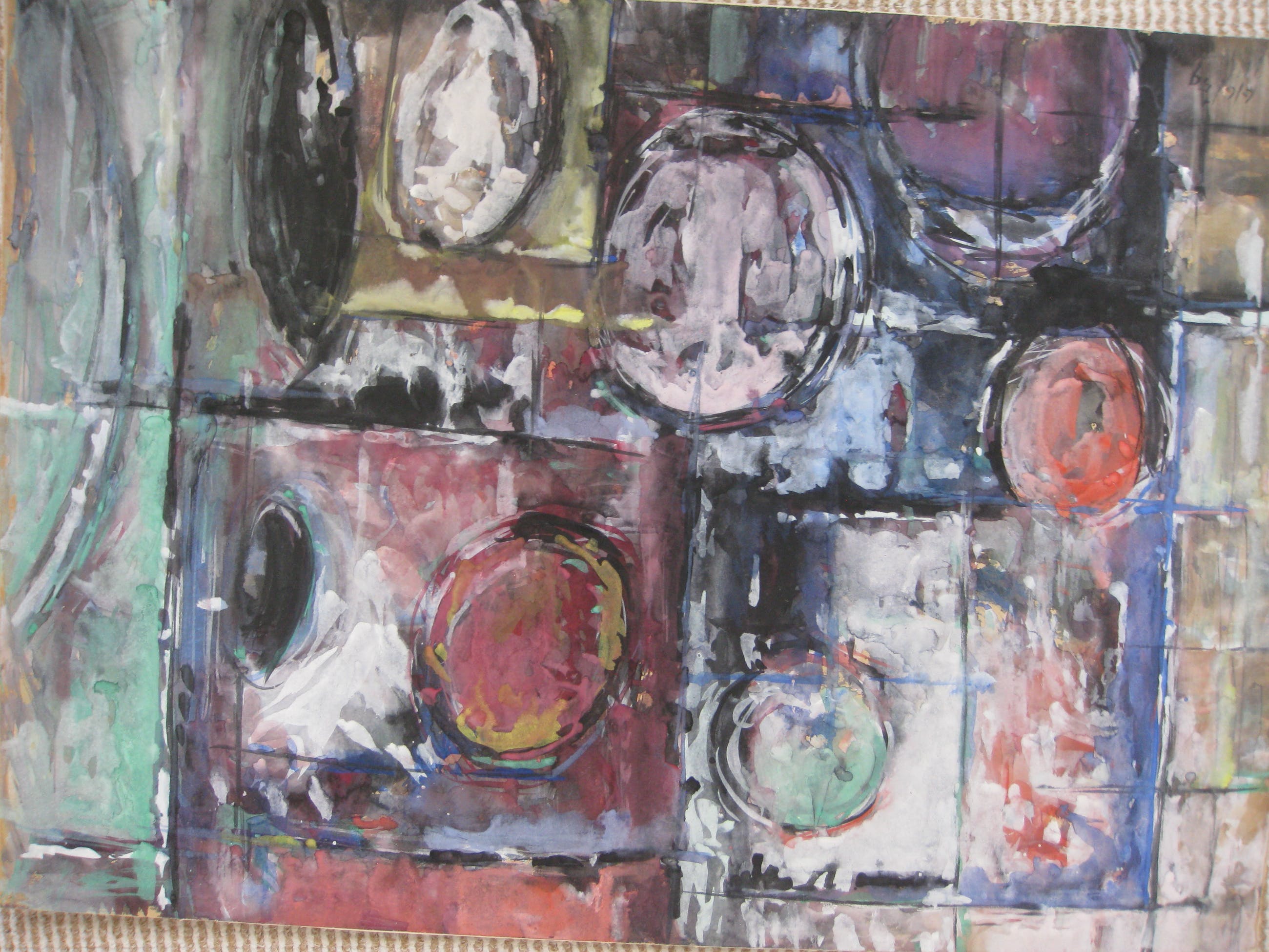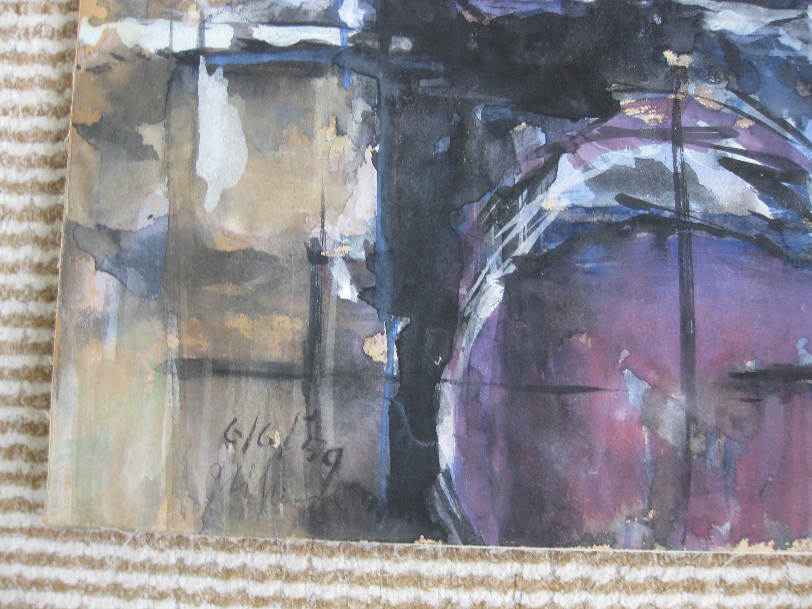 Lijkt olieverf met aquarel. Mooi kleurrijk werk. Op stevig karton. Voor en achterkant gesigneerd.