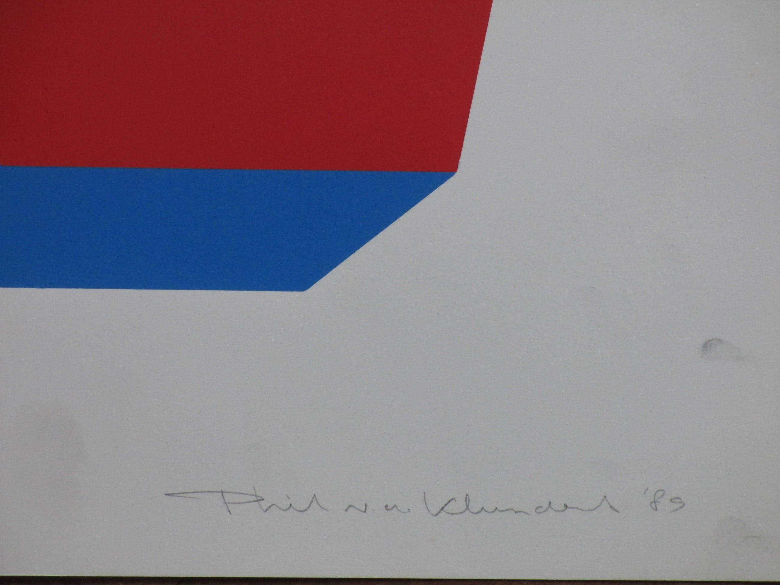 Zeefdruk door Phil van de Klundert. Voorstelling van een geometrisch object. Losbladig, beeldmaat 30x30, bladmaat 46x46 Gesigneerd en gedateerd in potlood r.o.: 'Phil v.d. Klundert '89' Genummerd in potlood l.o.: '114/300'