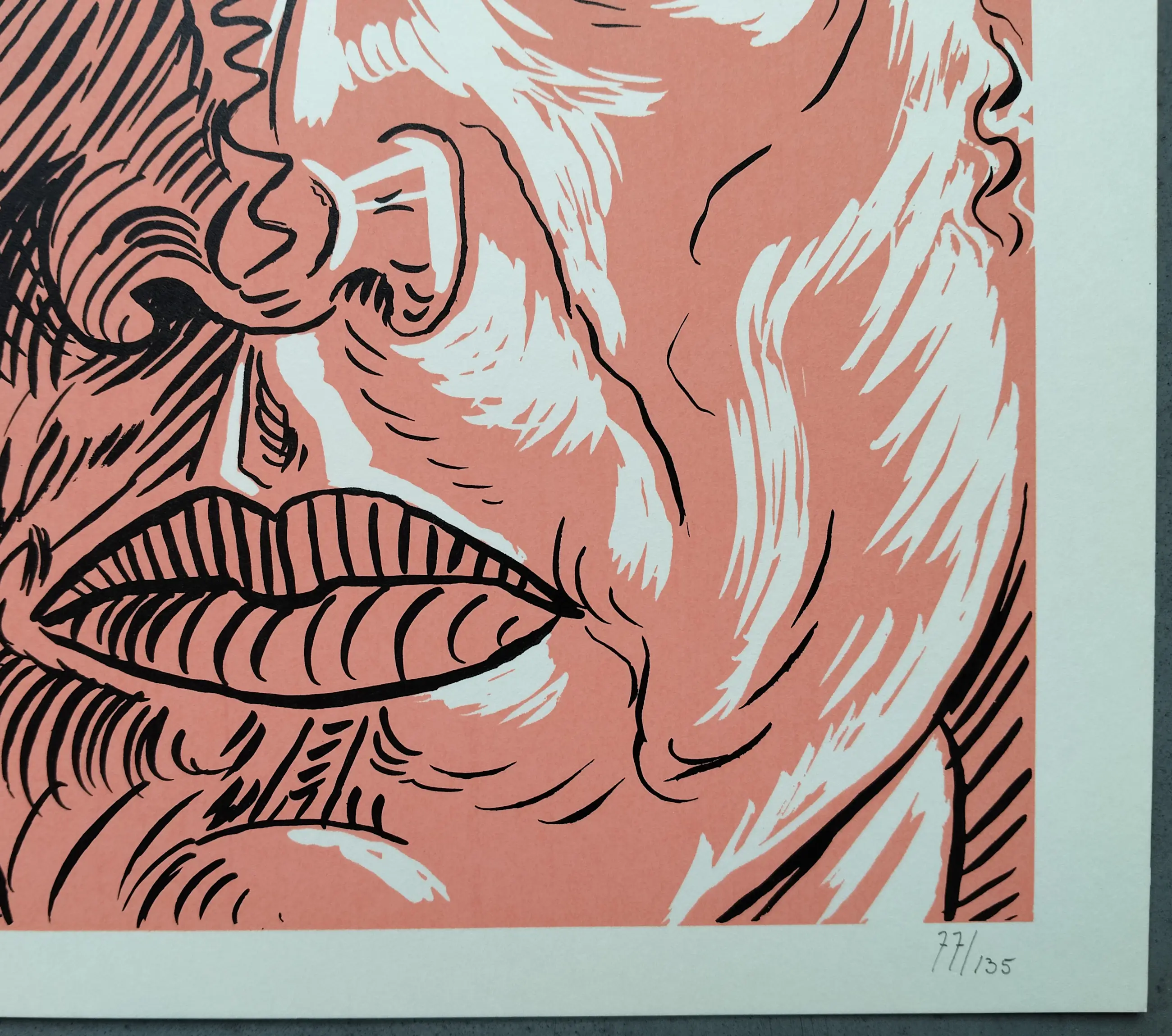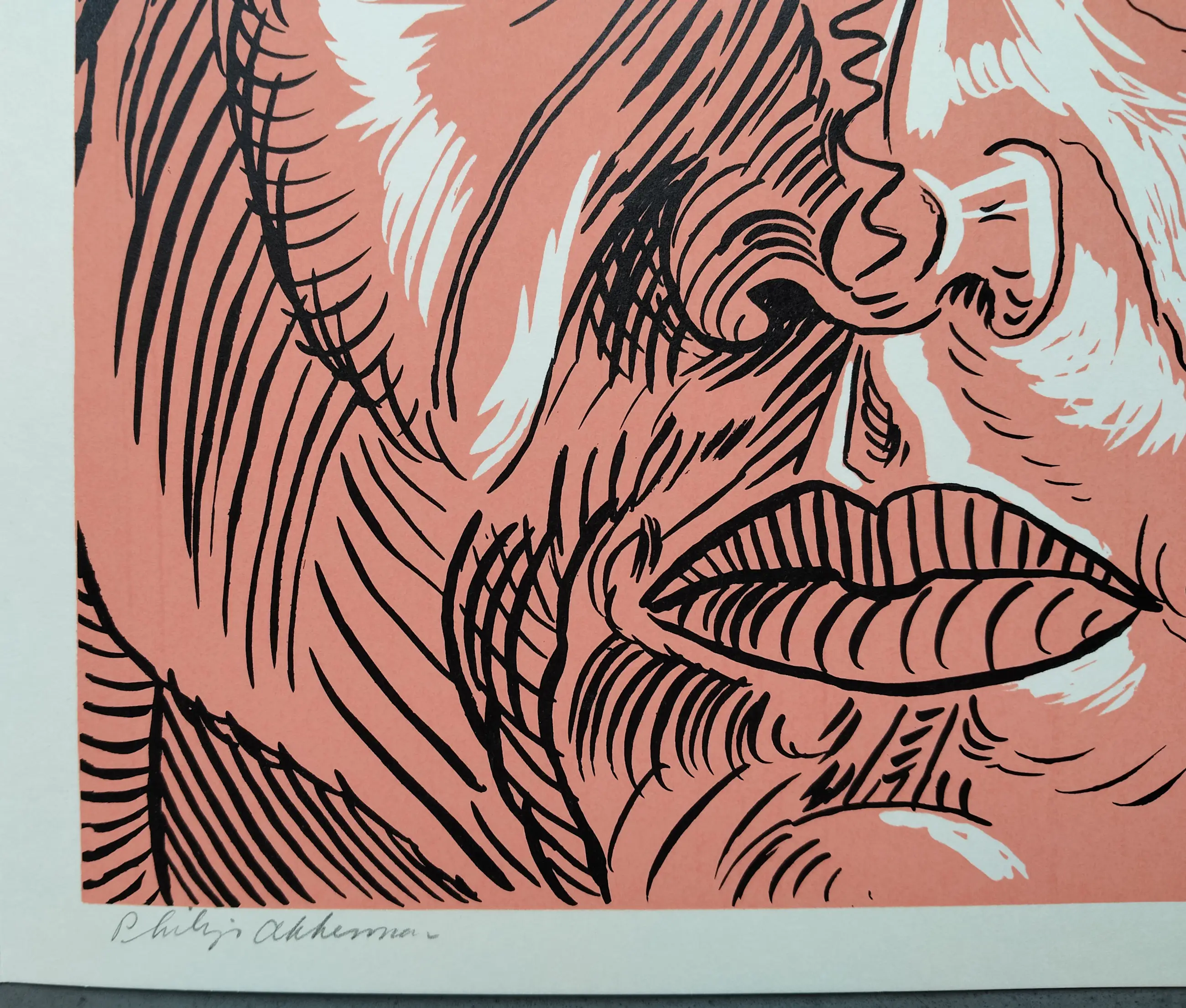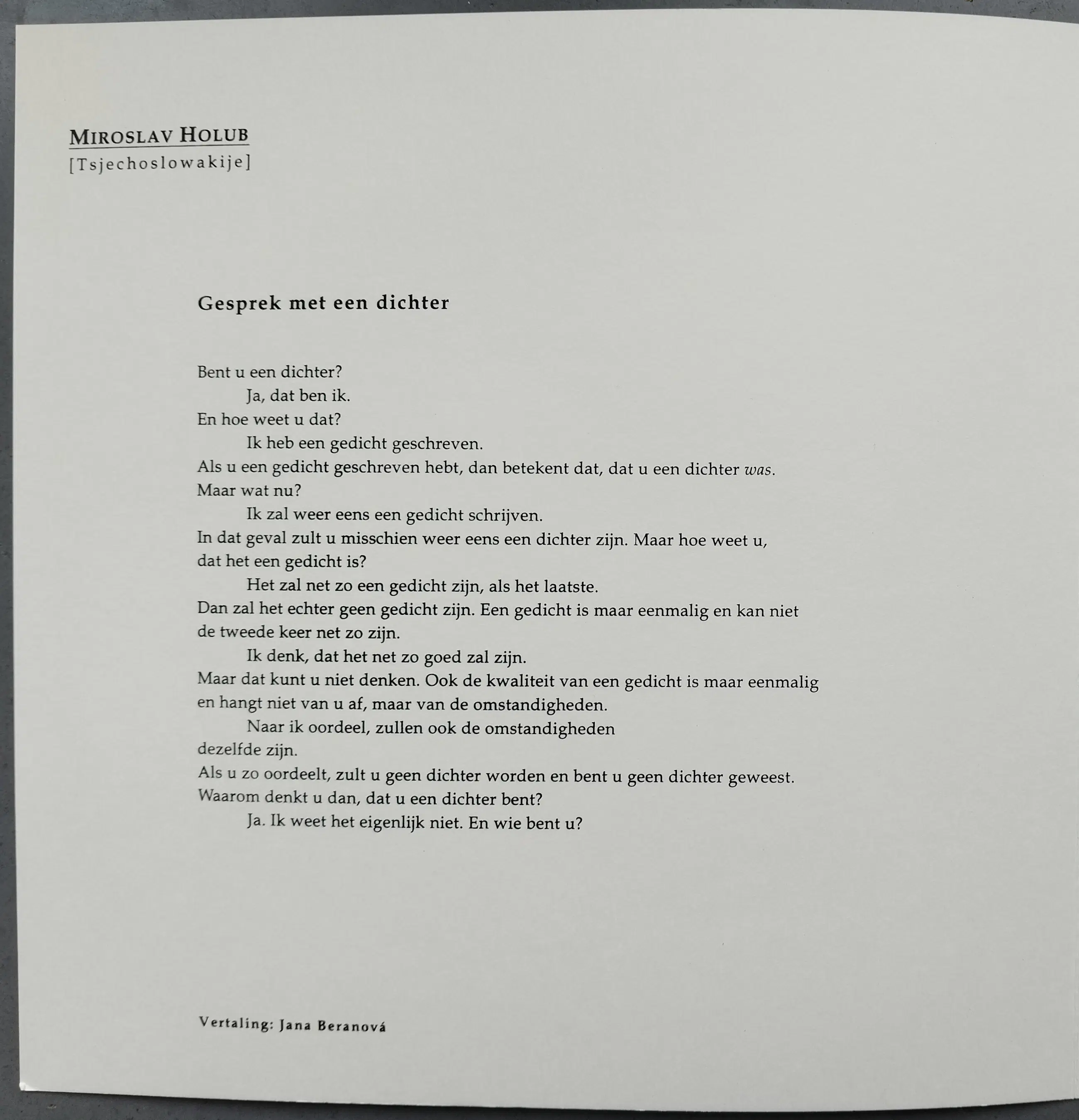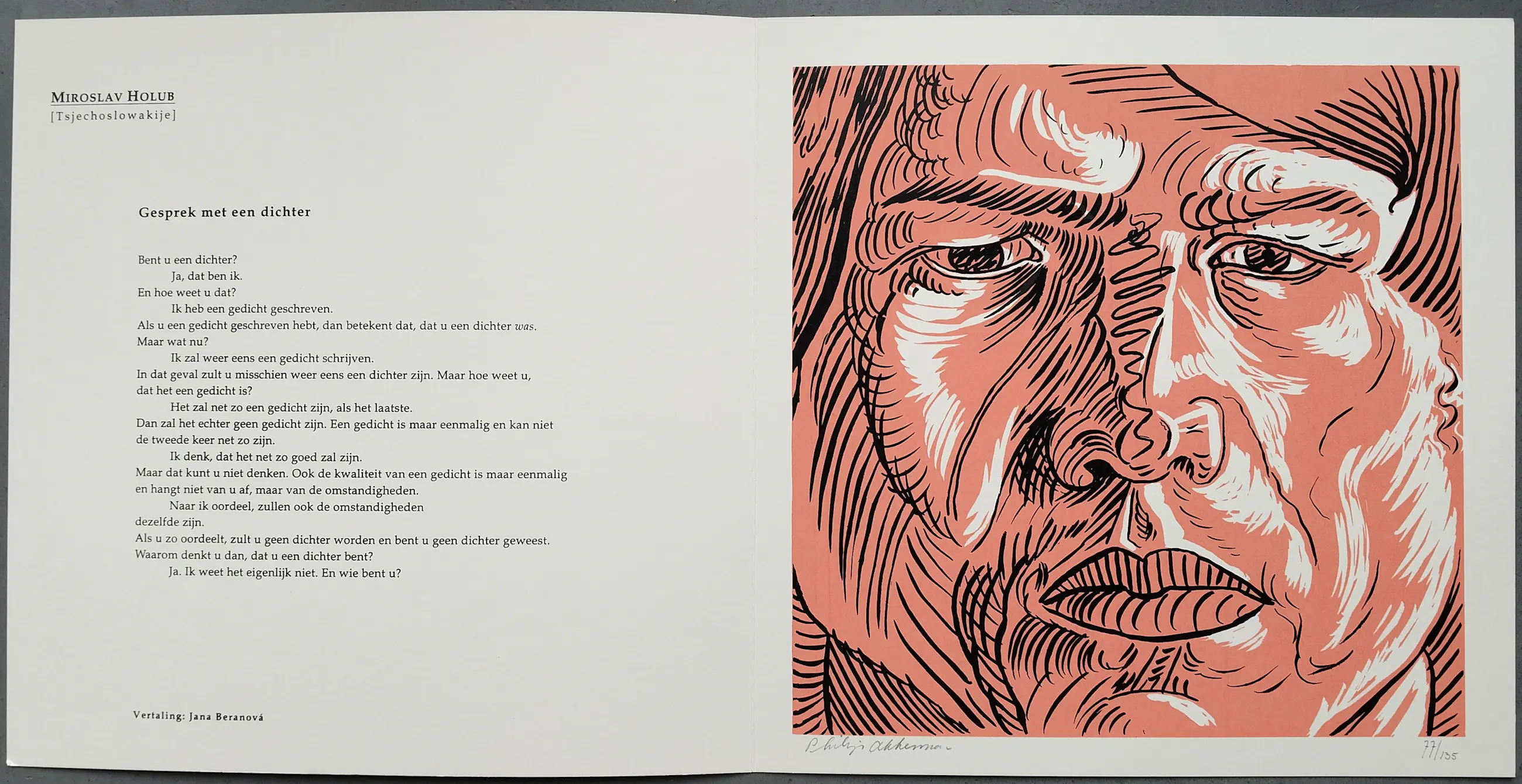 Gesigneerde zeefdruk van de kunstenaar Philip Akkerman (1957) uit 1990 met een gedicht van Miroslav Holub, gedrukt in een oplage van 135 stuks. Links onder is het werk gesigneerd in potlood en rechts onder genummerd 77/135. Afmeting totaal 32 x 64 cm. (hxb). In het midden zit een vouwlijn, dit is origineel. De zeefdruk is in prima staat en is nooit ingelijst geweest.