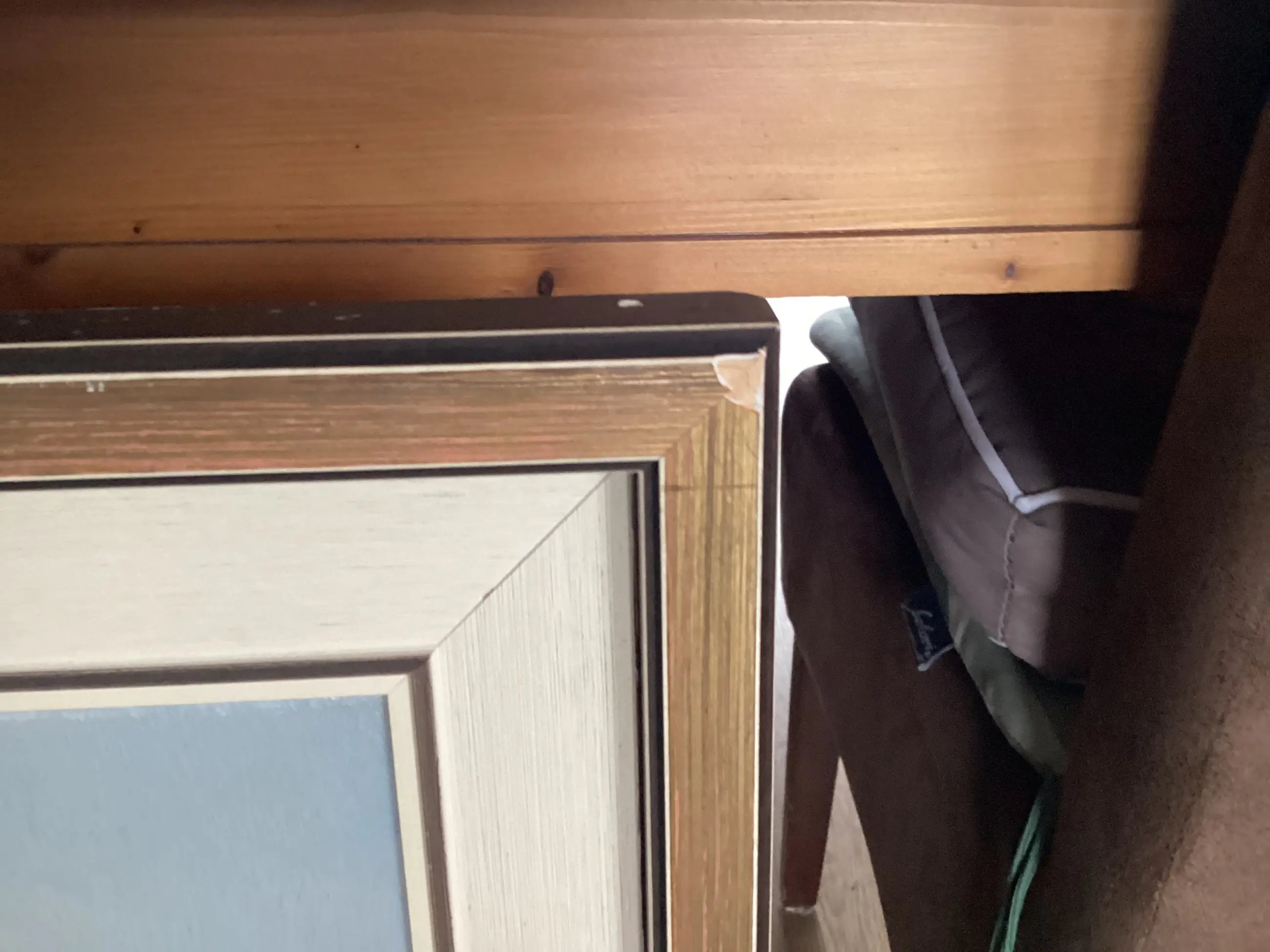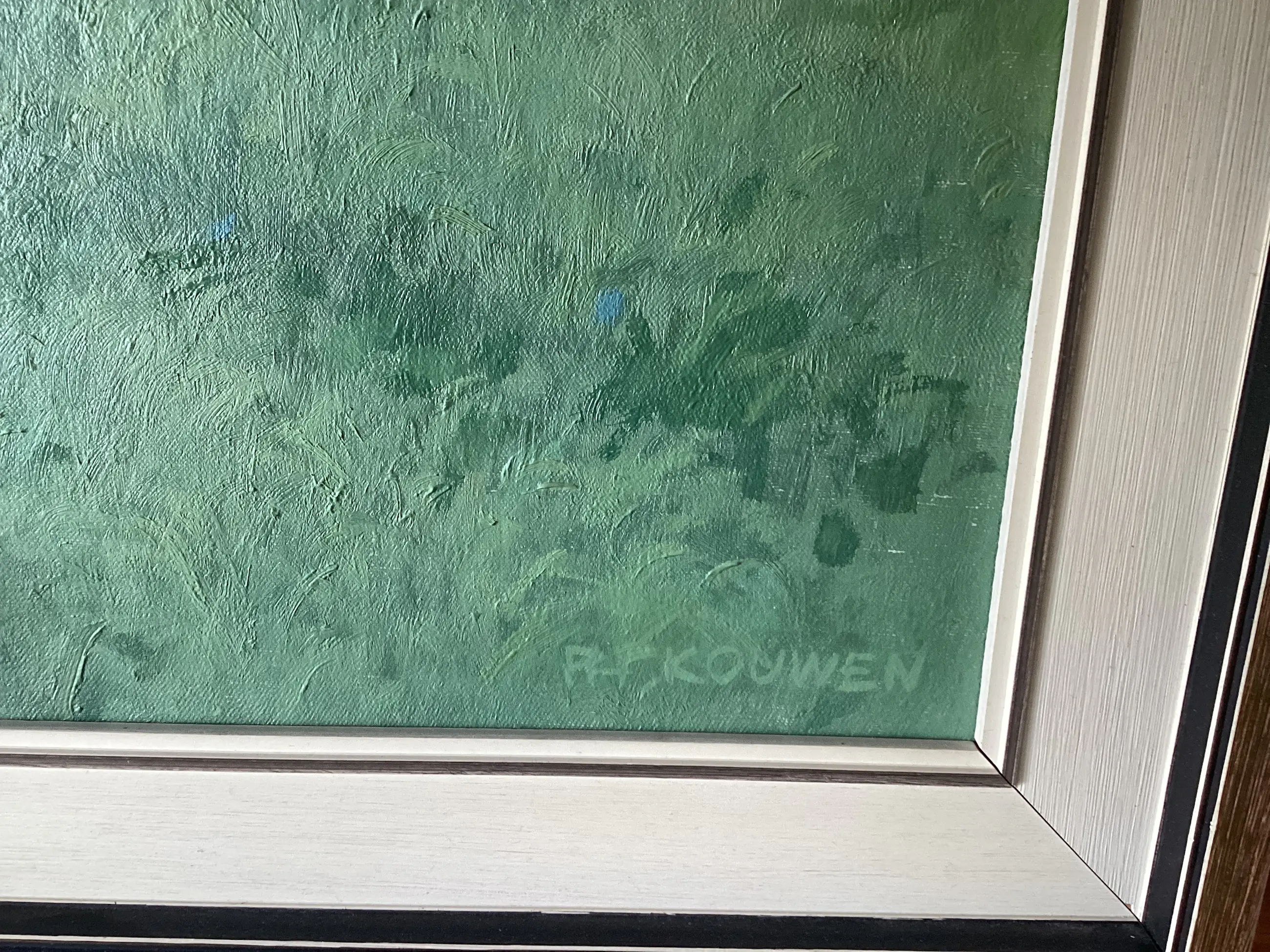 Het doek bevindt zich in goede staat: geen beschadigingen e.d. De lijst heeft wat onderhoud nodig. De rechterbovenhoek van de lijst heeft een kleine herstelbare schade van ca. 0,5 x 0,5 cm. Zie daarvoor de foto.