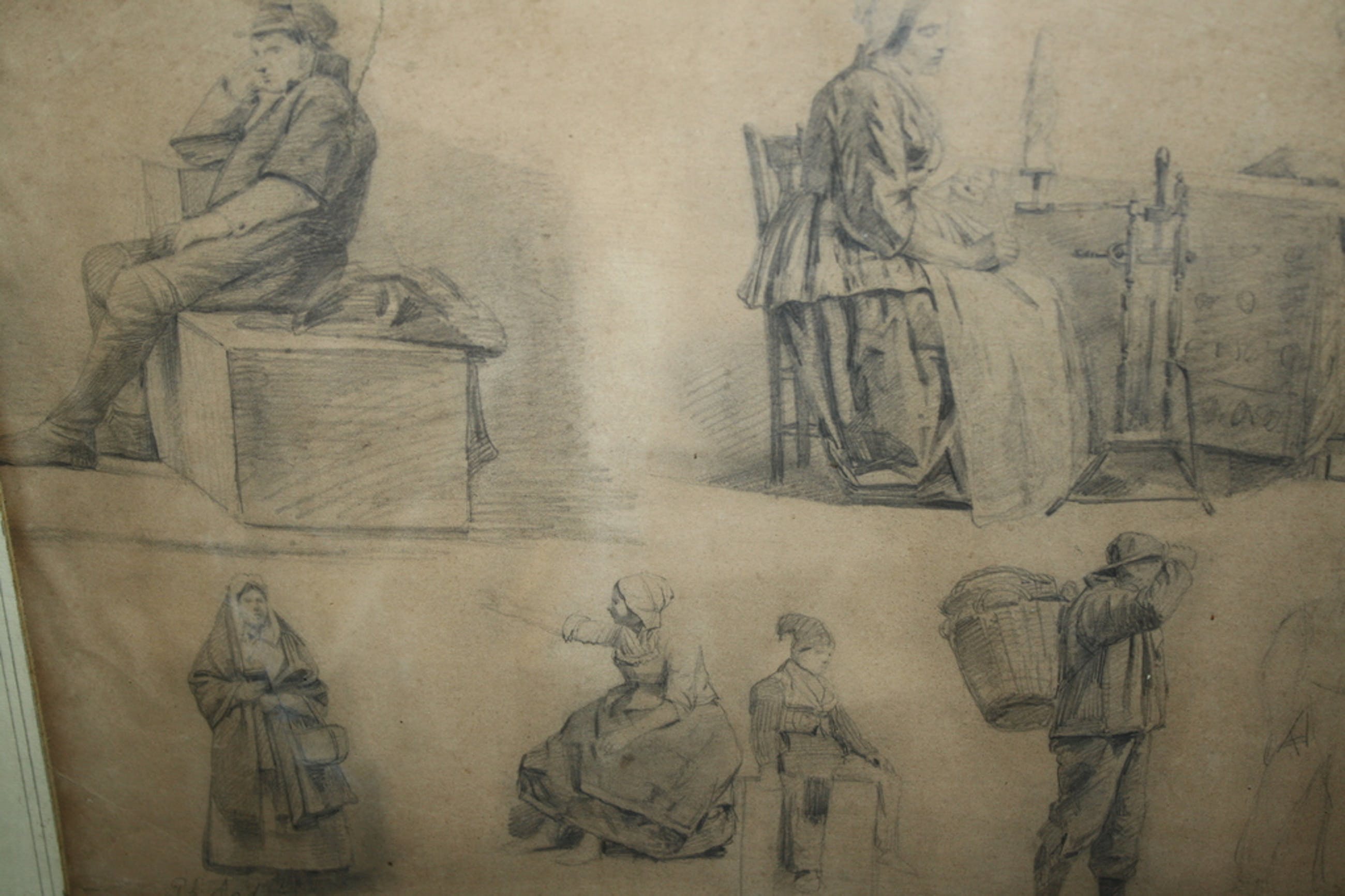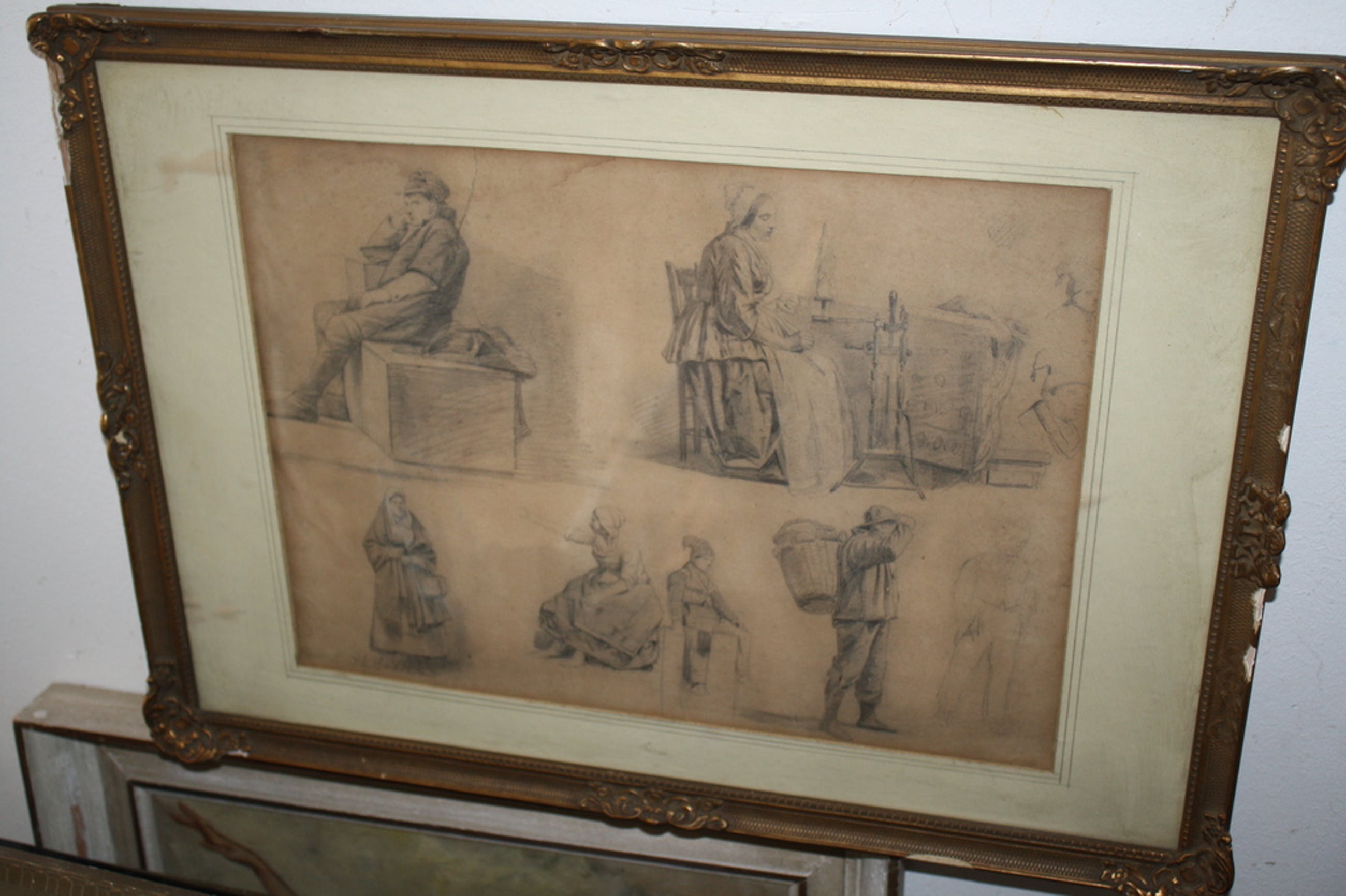 In een antieke lijst met glas , lijst heeft randschade, Tekeningen in redelijke staat