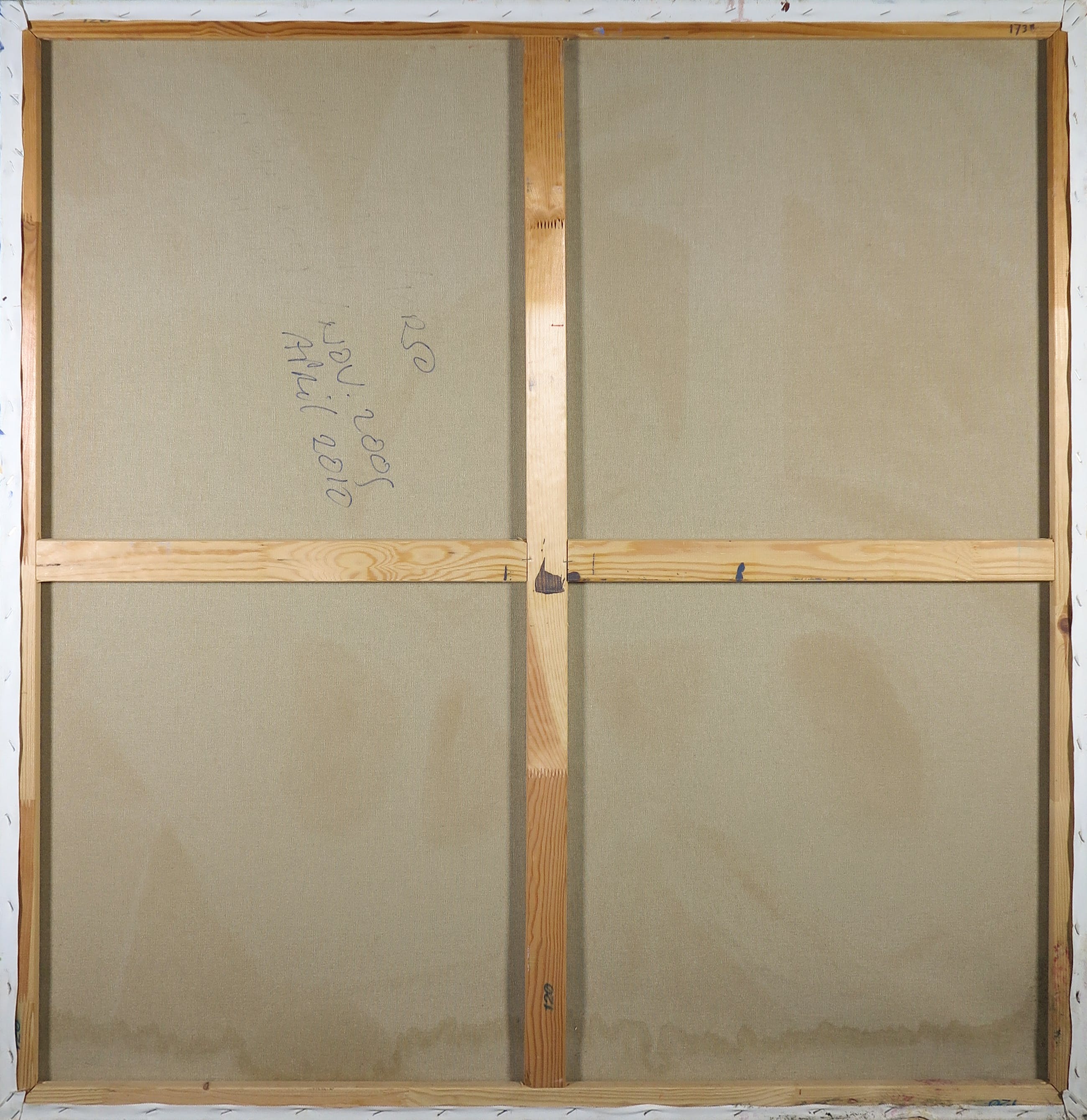 | Paar lichte deukjes in het doek langs de onderste rand. | |