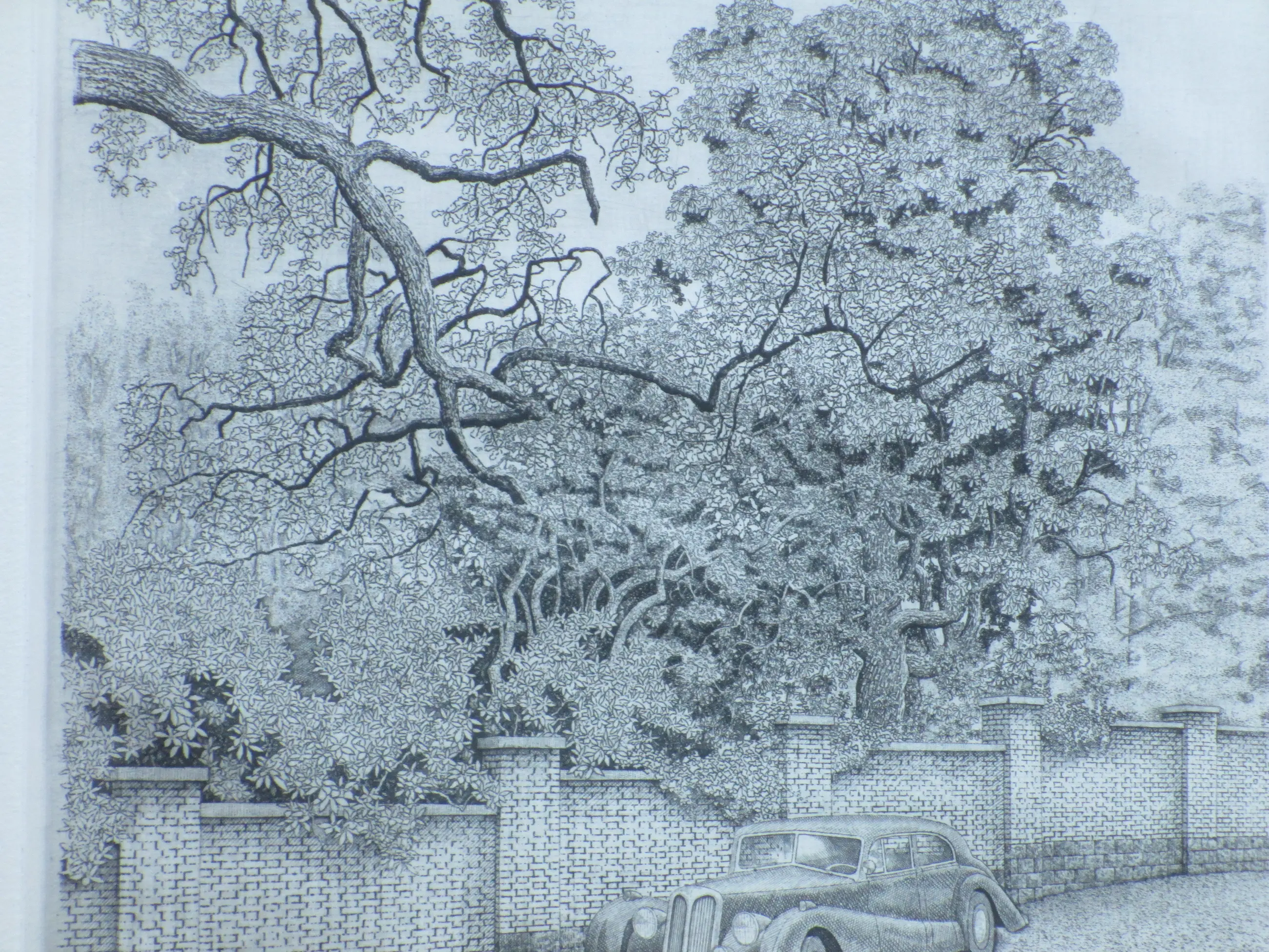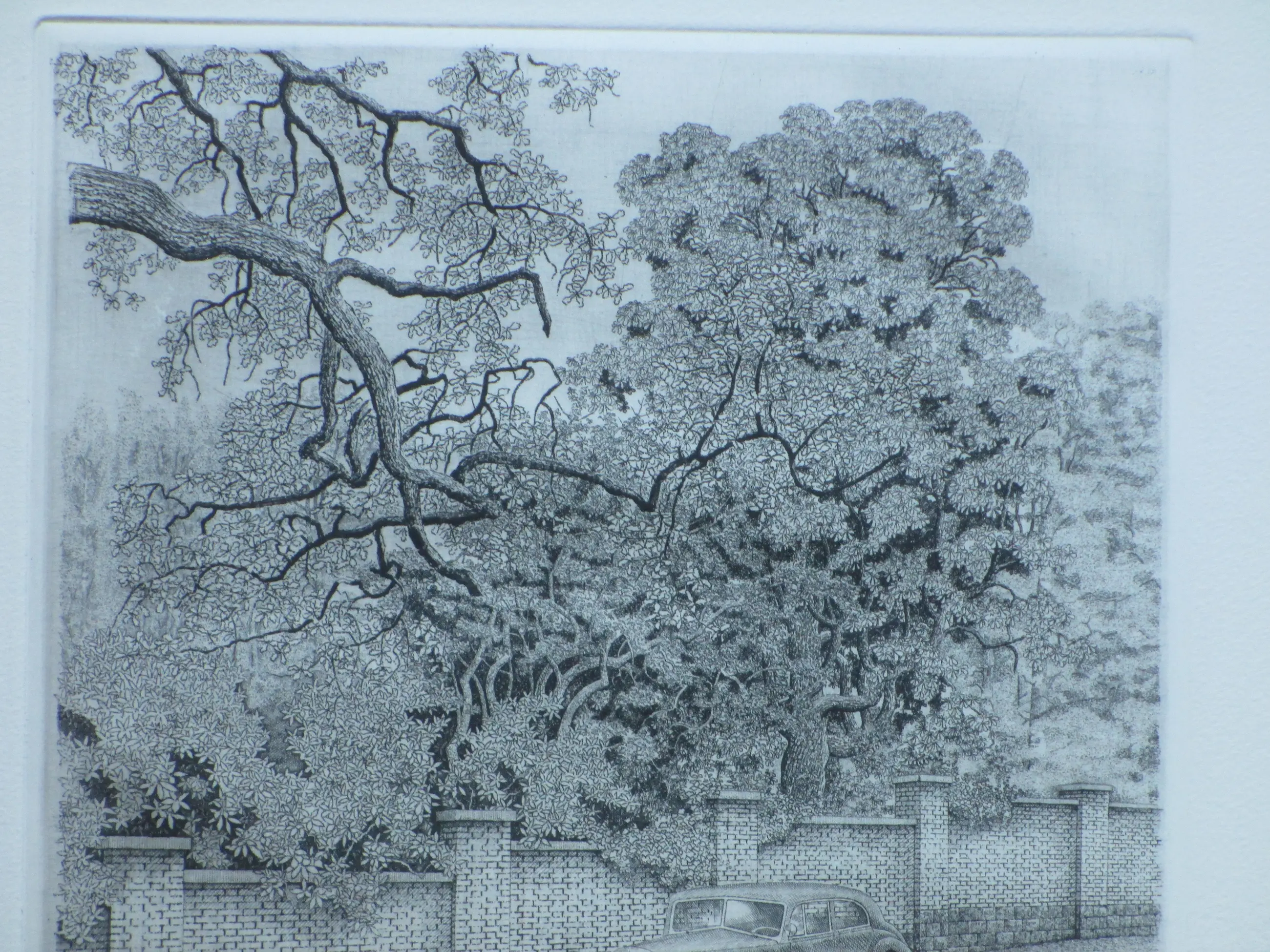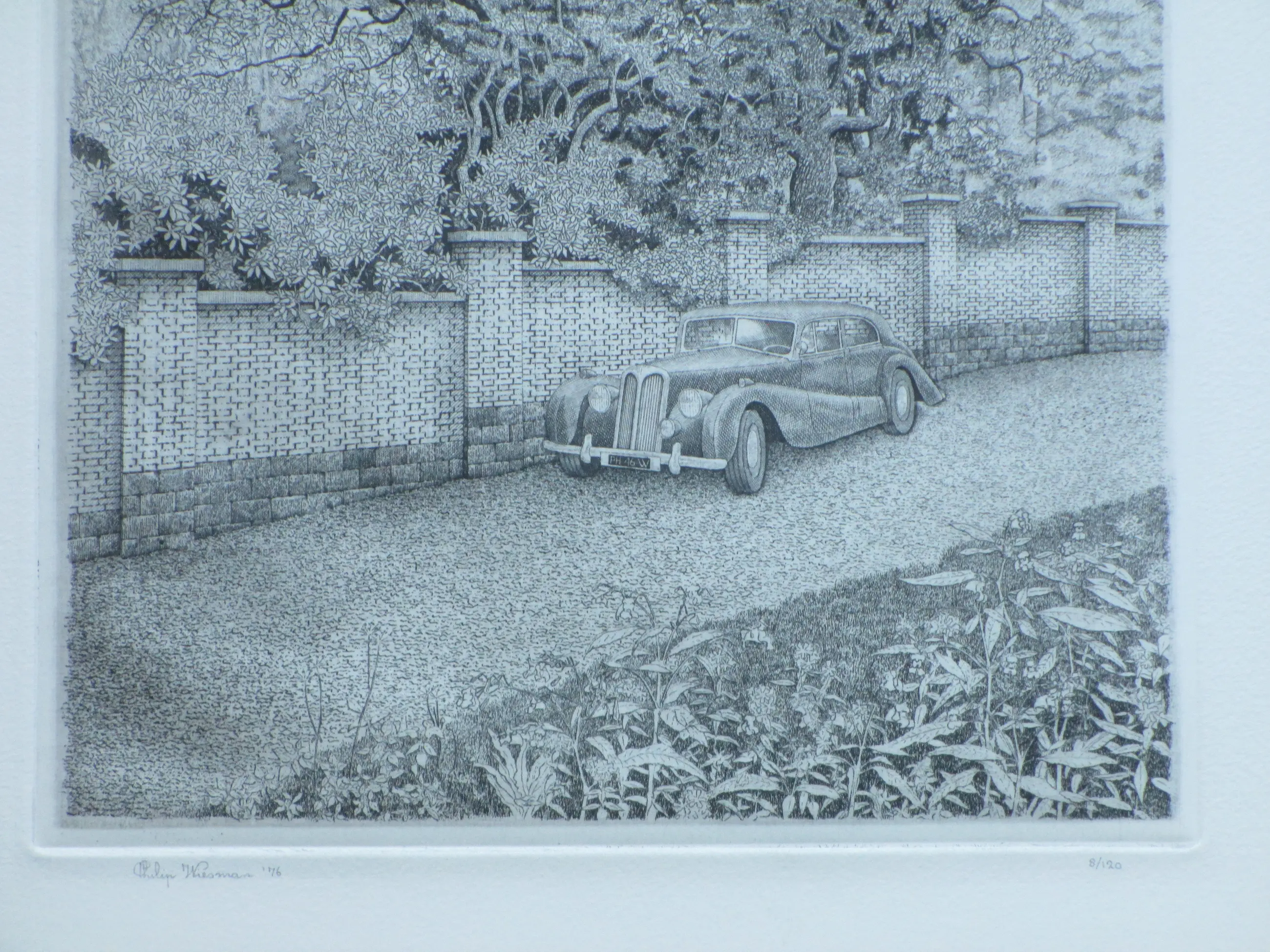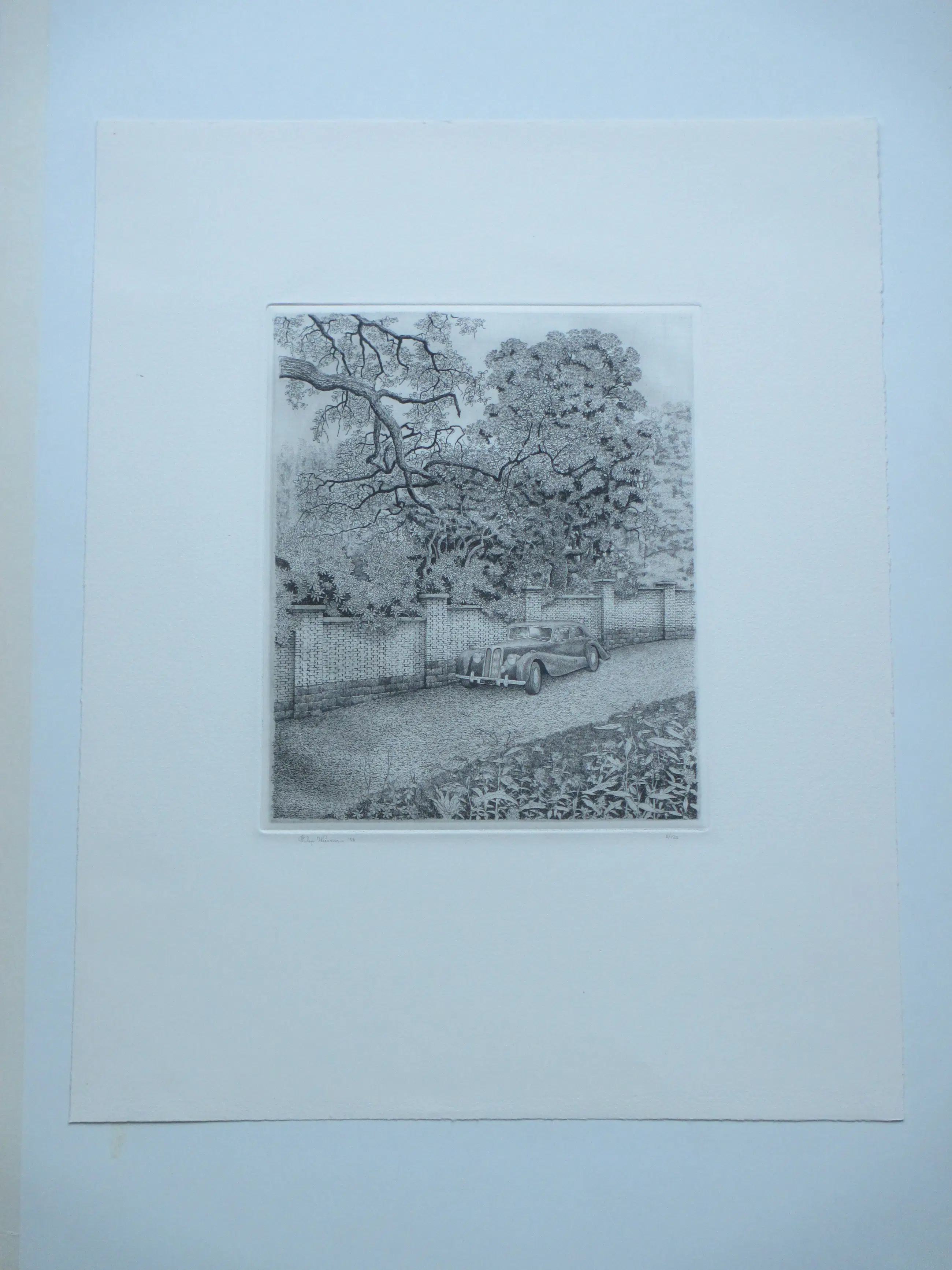 Ets door Philip Wiesman Voorstelling van een lommerrijke omgeving met een automobiel Losbladig, beeldmaat 24x20, bladmaat 46x37 Gesigneerd en gedateerd in potlood l.o.: 'Philip Wiesman '76' Genummerd in potlood r.o.: '8/120' Herkomst: Kunstmarkt Utrecht 1977 (omslagdetail aanwezig)