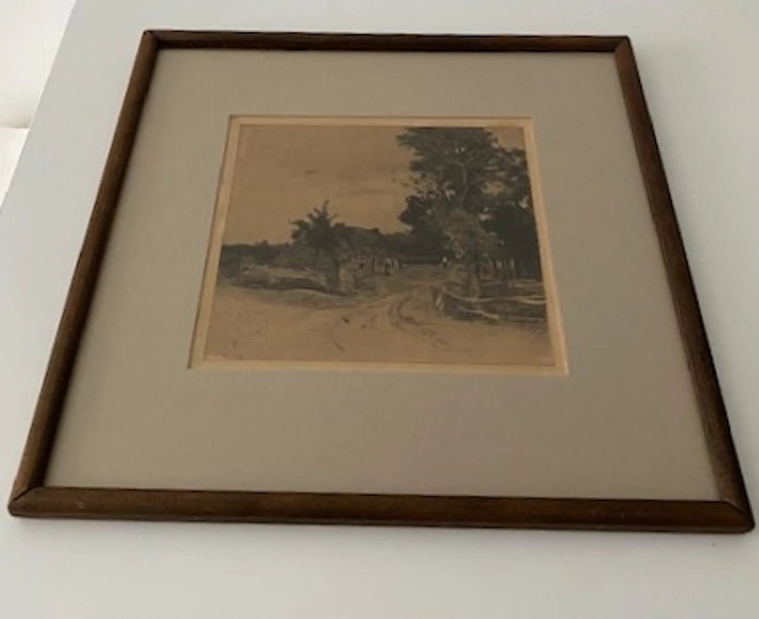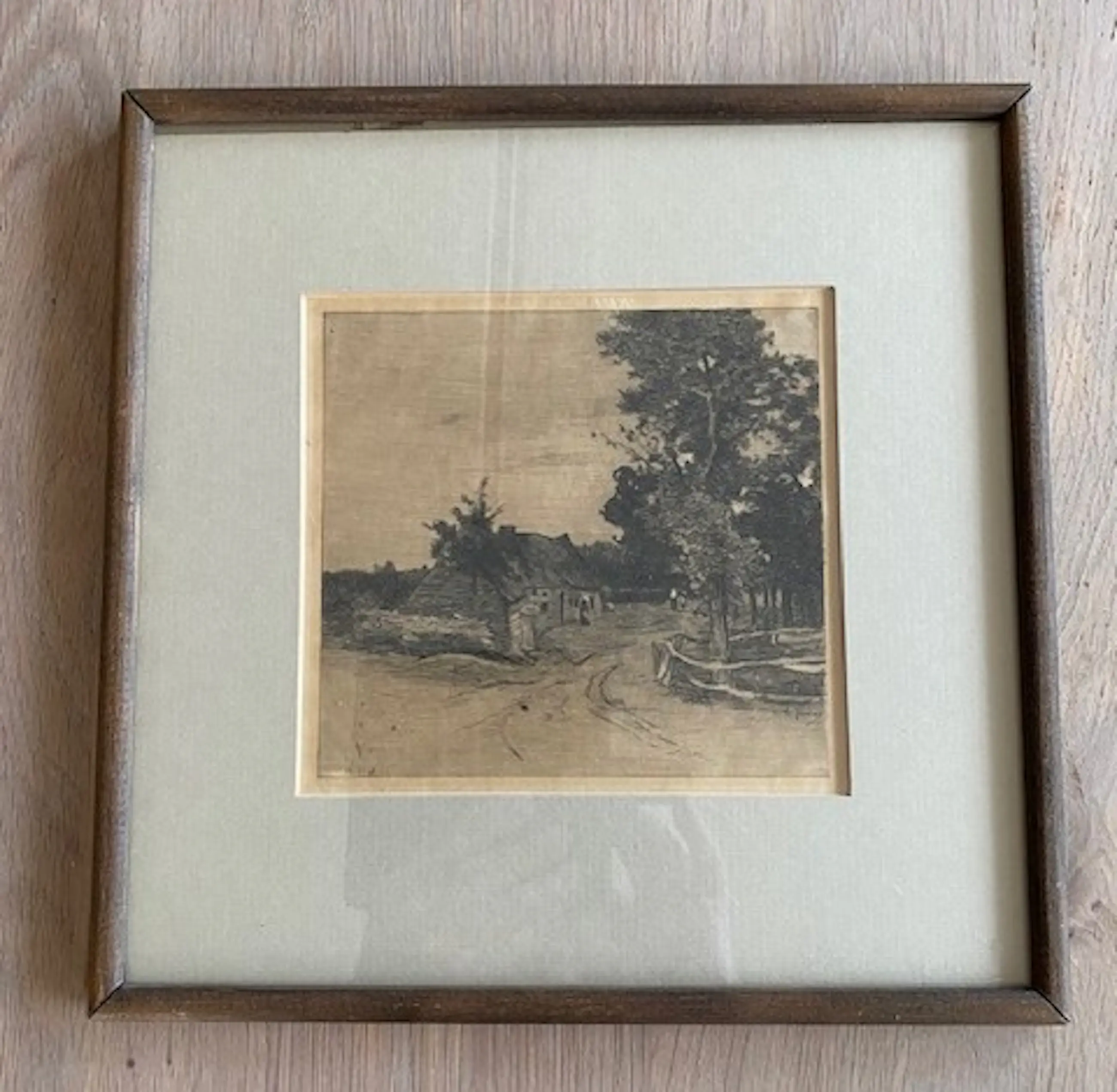 Fraaie ets "Boerderij in het landschap. Naar een werk van A. Mauve.