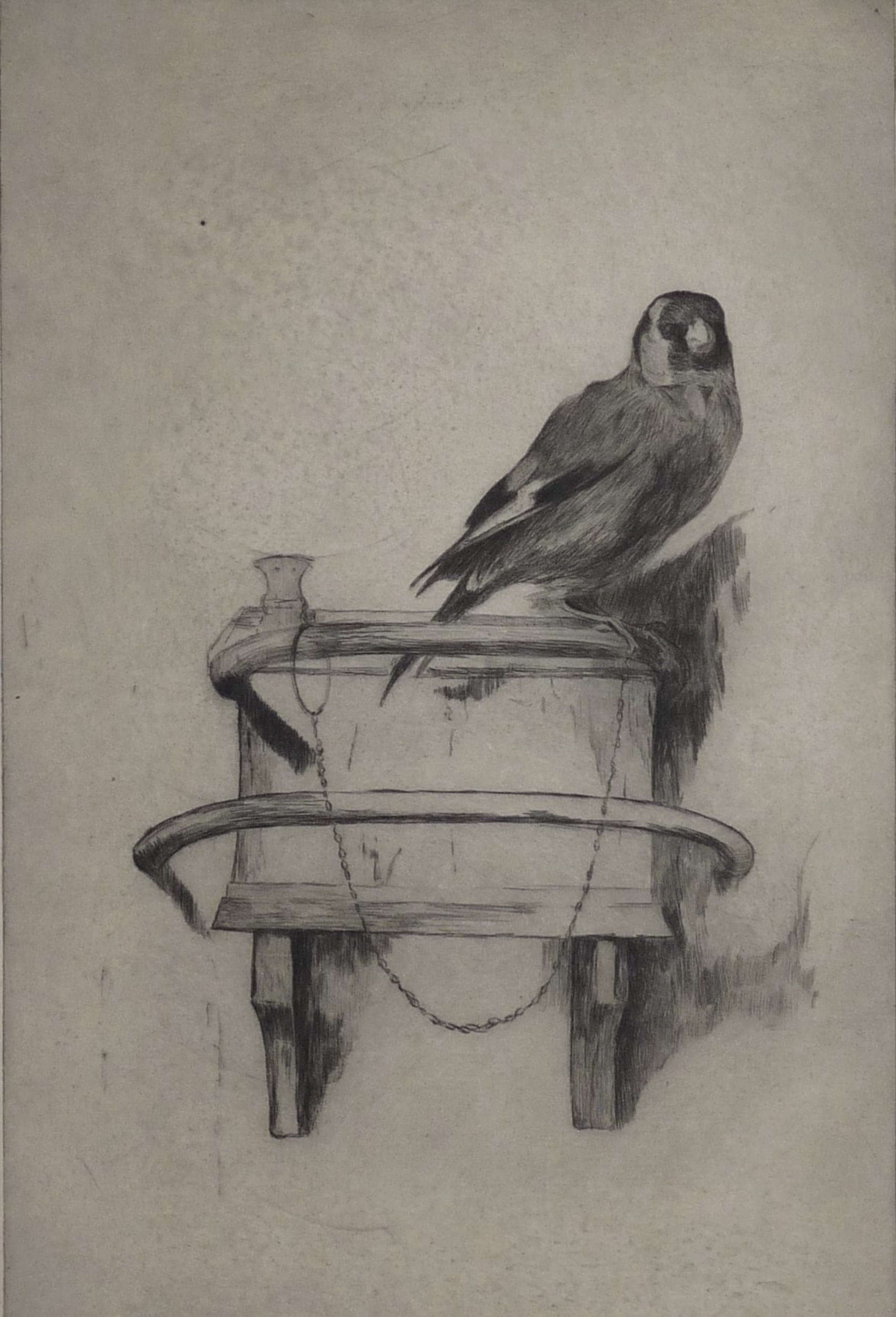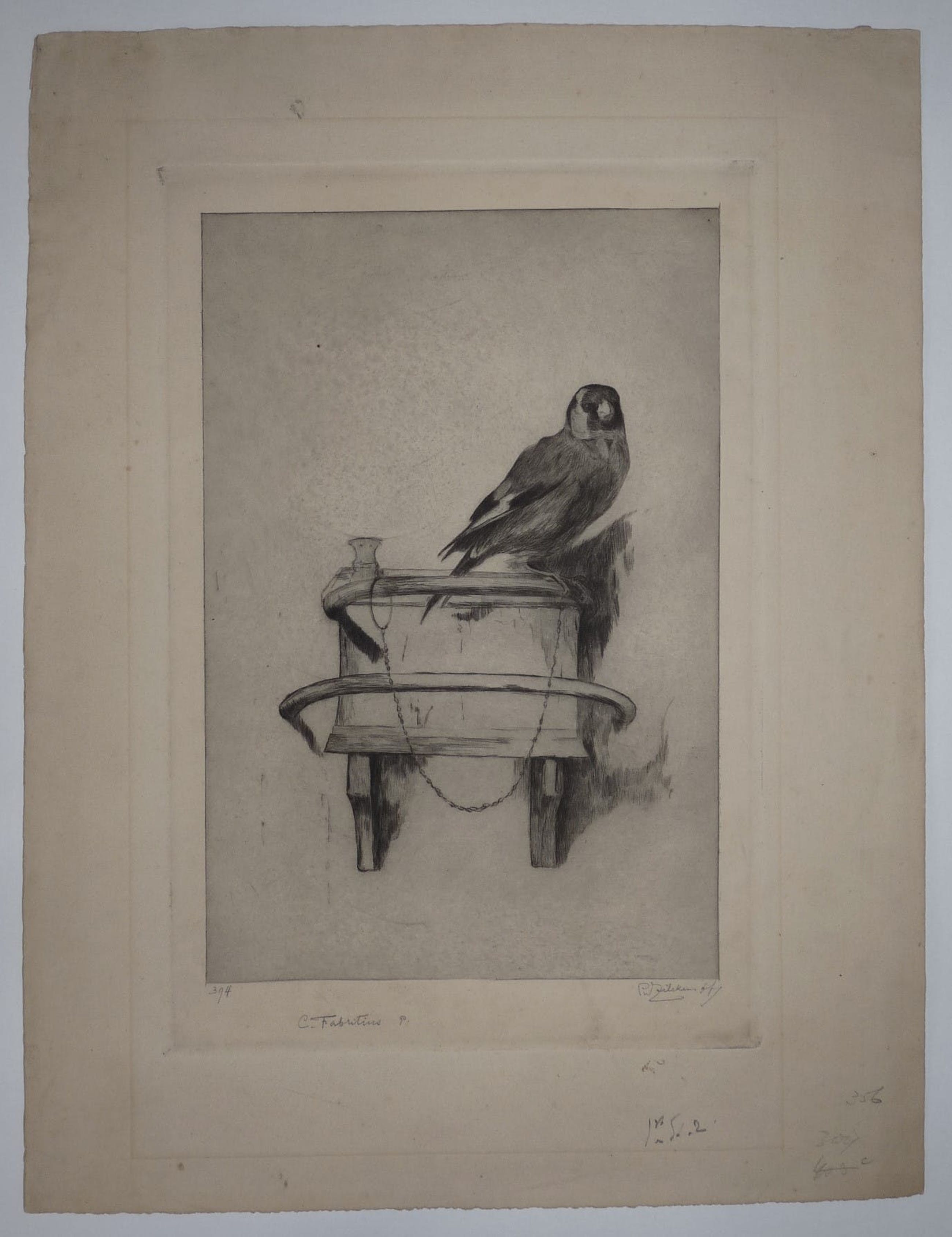 * Droge naald ets naar het bekende schilderij Het Puttertje van Carel Fabritius * Papiermaat 49 x 38 cm. Beeldmaat afdruk ets 32 x 21,5 cm. R.o. gesigneerd in potlood. * Philip Zilcken maakte veel reproductieetsen in uitstekende kwaliteit van bekende schilderijen. Deze ets van Het Puttertje is waarschijnlijk in niet al te grote oplage gemaakt, want andere exemplaren hiervan heb ik op internet niet kunnen vinden. * Het betreft de 1e staat (zeldzaam?) van deze ets, waarbij verschillende delen in de afbeelding nog niet zo ver zijn uitgewerkt als in de uiteindelijke definitieve staat.