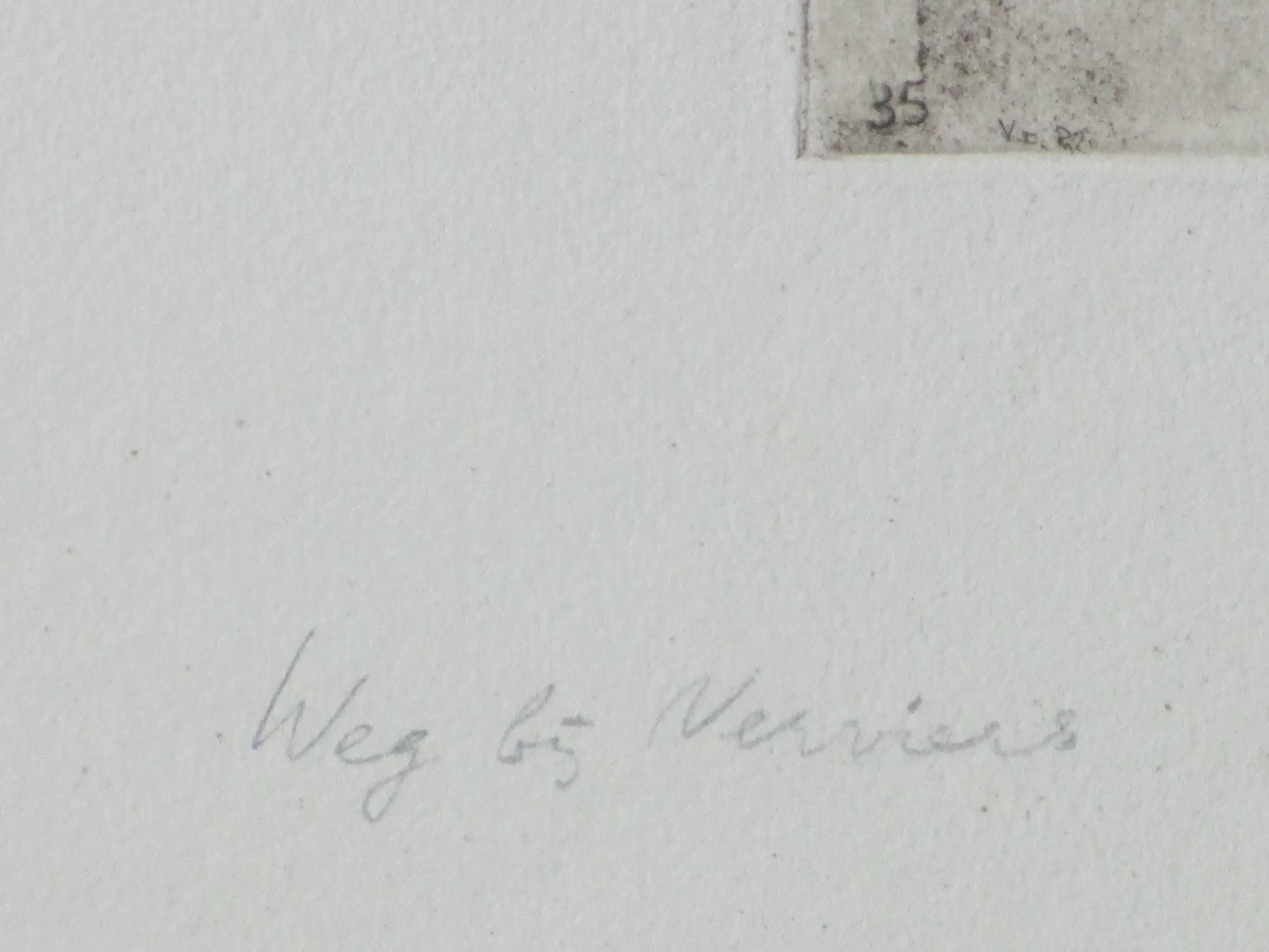 Ets door Philip Zilcken Voorstelling van een weg bij industriestad Verviers Losbladig, beeldmaat 14x20, bladmaat 36x49 Gesigneerd op blad r.o.: 'Zilcken' Tevens gemonogrammeerd l.o. in de druk: 'P.Z.' Getiteld in potlood l.m.: 'Weg bij Verviers' Annotatie r.o. in potlood: 'RWP 327' (Catalogusvermelding) Authenticiteit volledig gegarandeerd