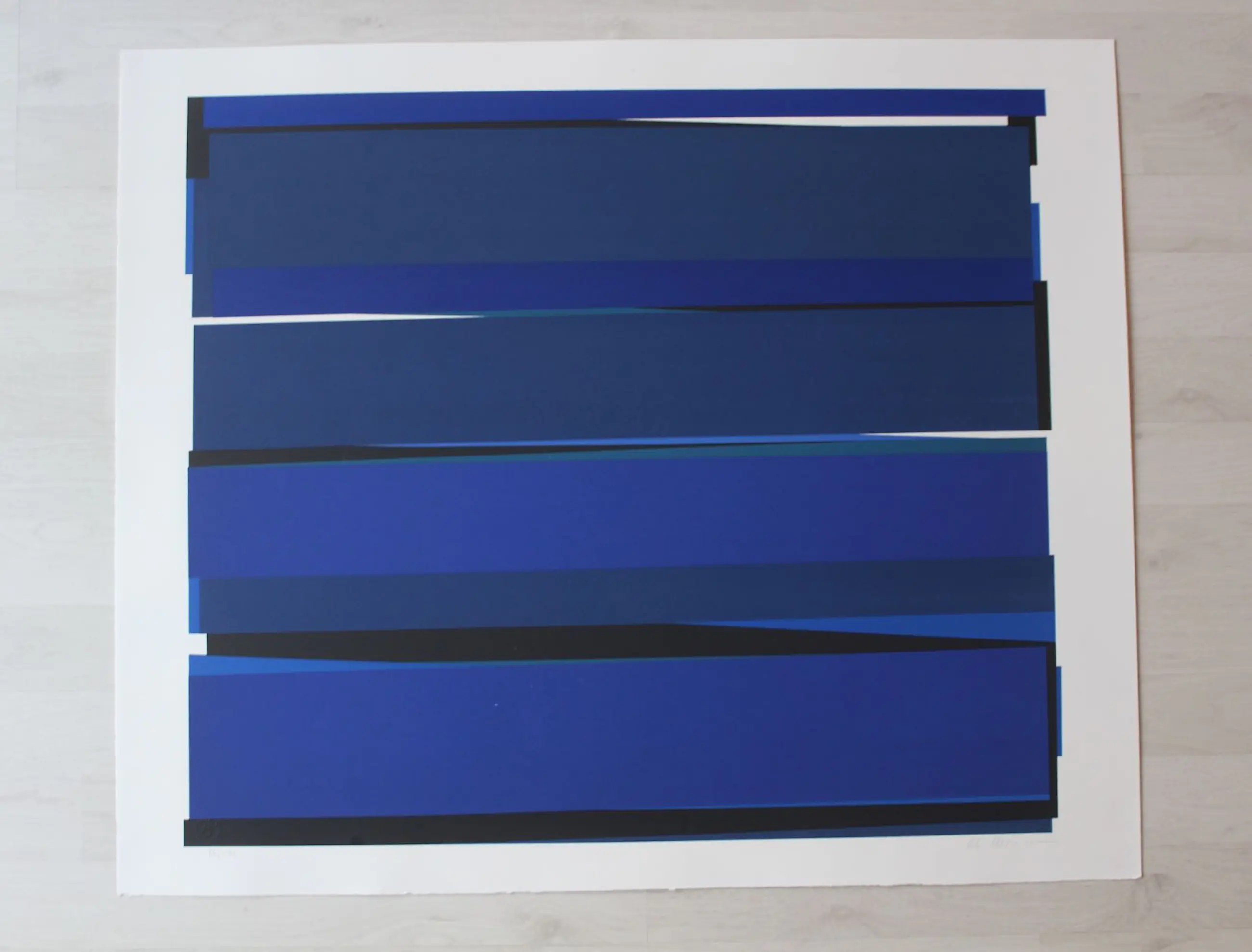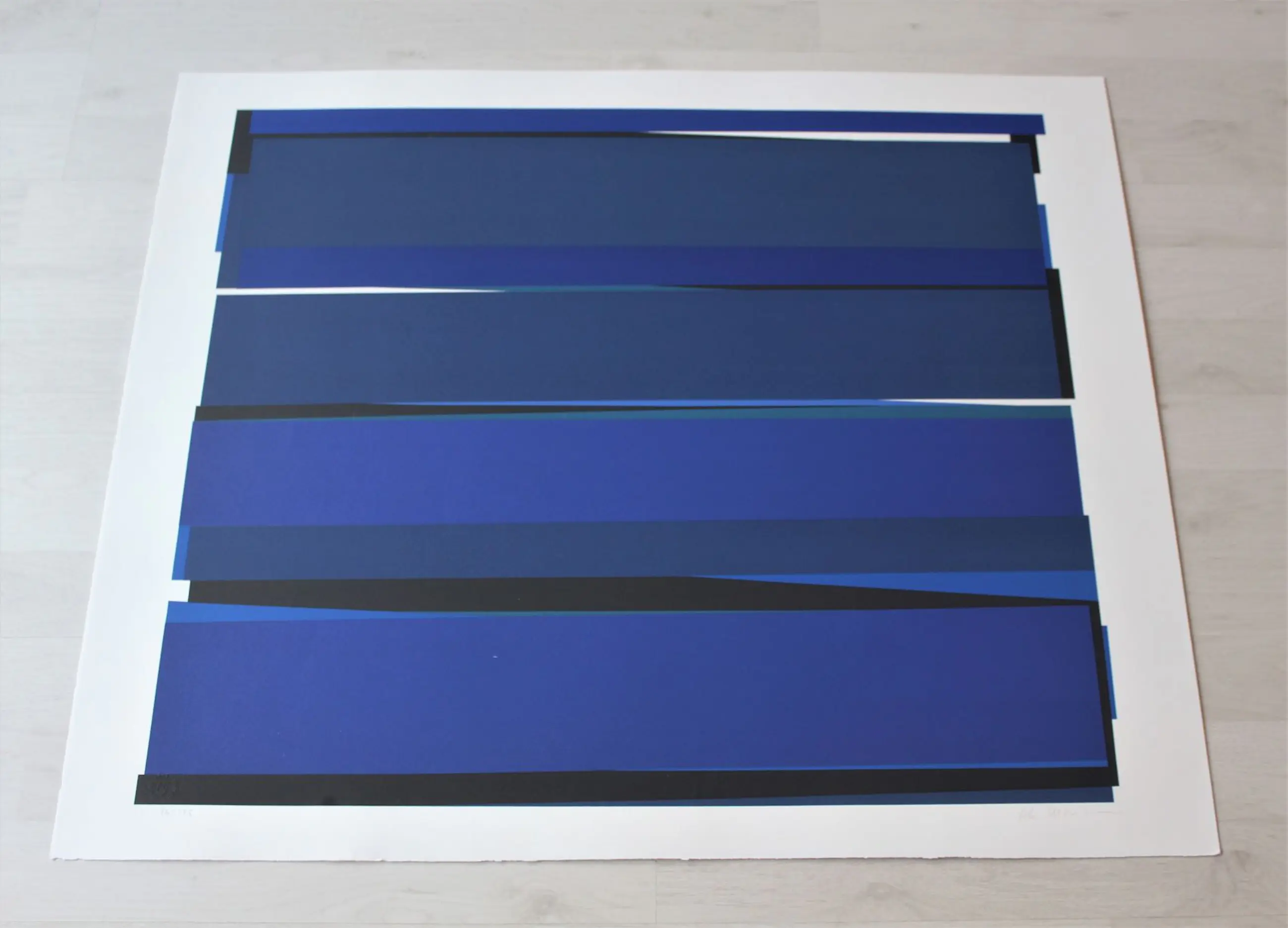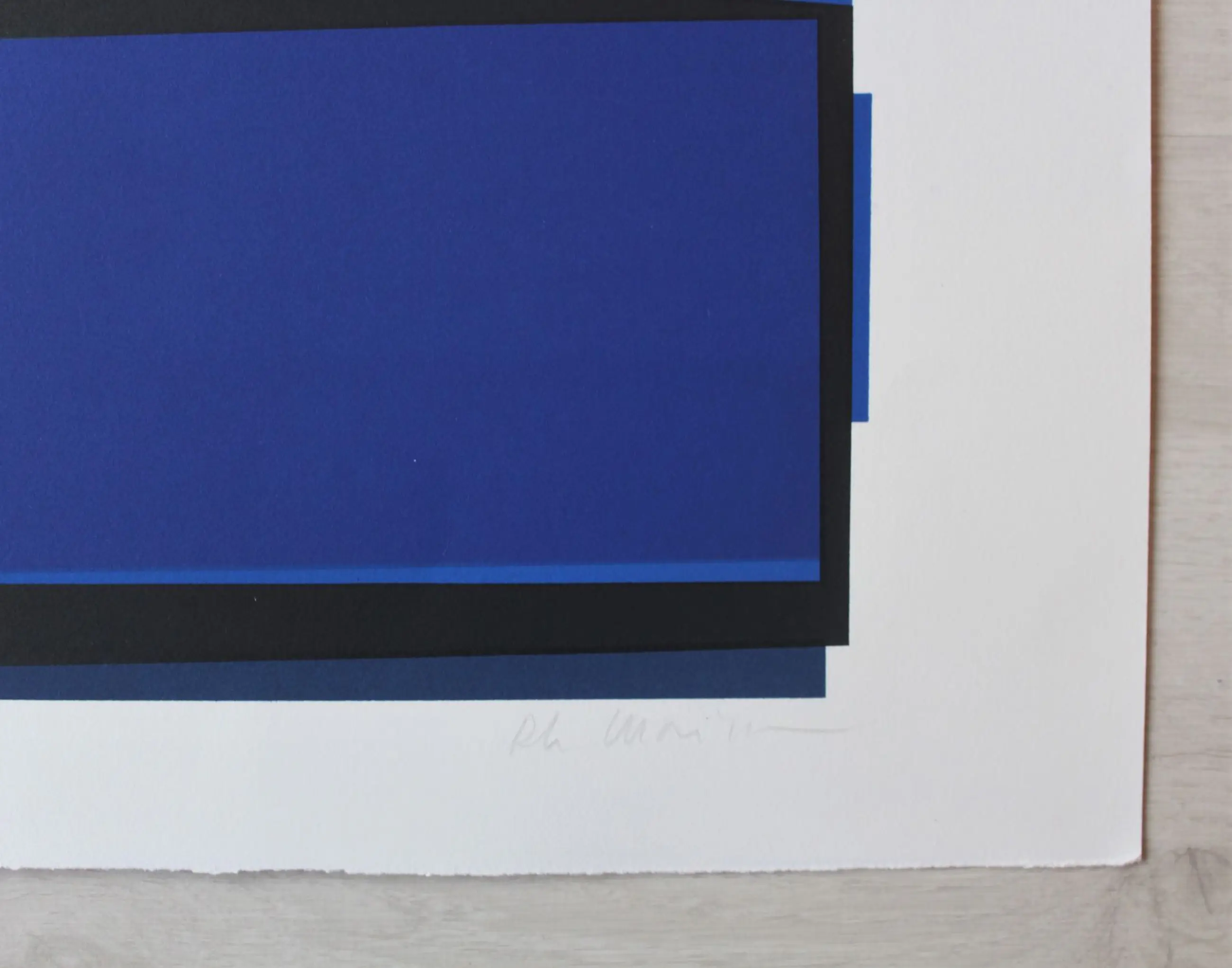 Originele afbeelding van Philippe Morrison (1924-1994). Uit de portfolio "Afstanden" 1971-1972. Techniek: Kleurserigrafie op handgemaakt papier. Beperkte oplage van 175 exemplaren. Handtekening en nummering aanwezig. Parijs: edities Denise René, 1971.