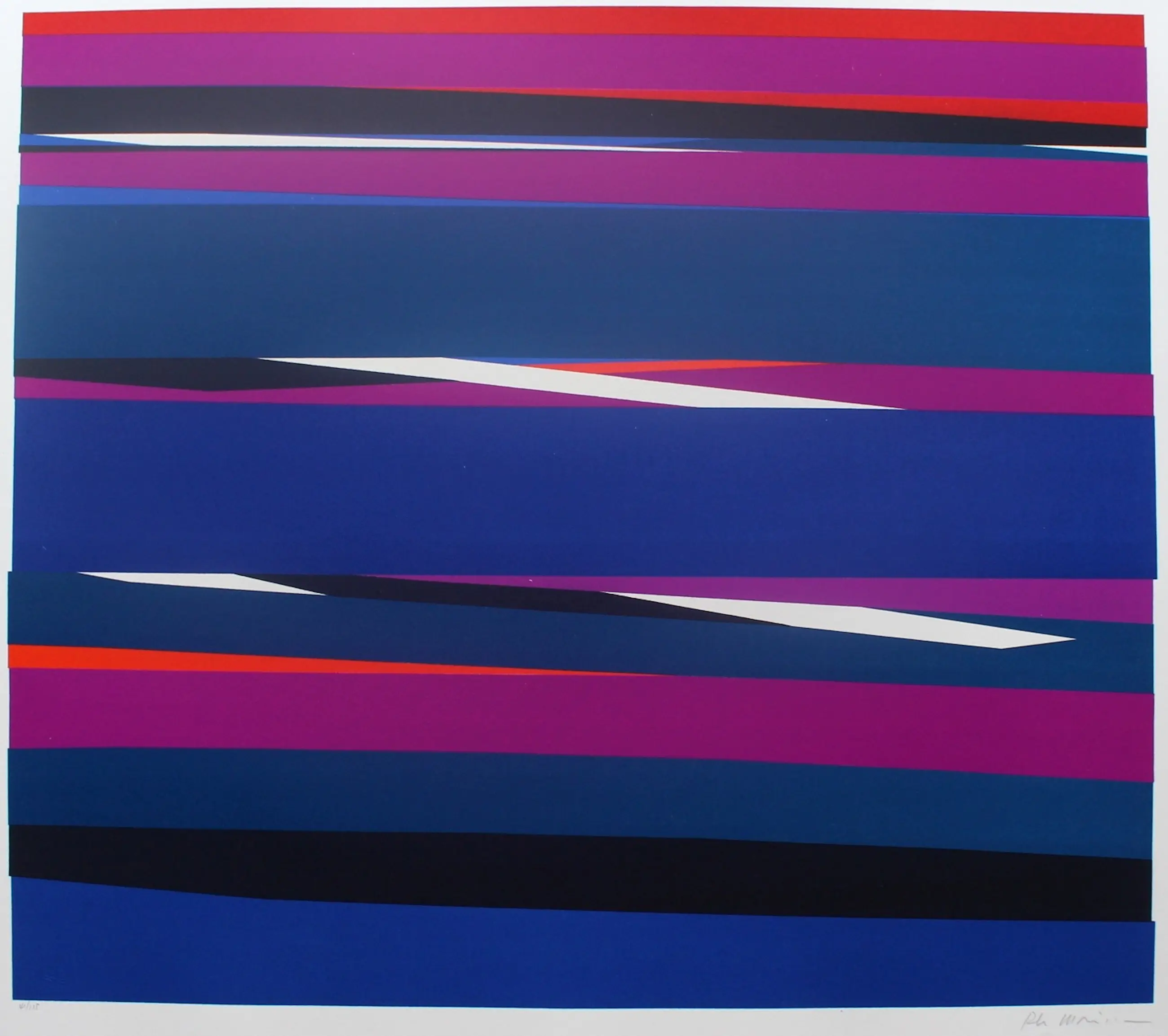 Originele afbeelding van Philippe Morrison (1924-1994). Uit de portfolio "Afstanden" 1971-1972. Techniek: Kleurserigrafie op handgemaakt papier. Beperkte oplage van 175 exemplaren. Handtekening en nummering aanwezig. Parijs: edities Denise René, 1971.