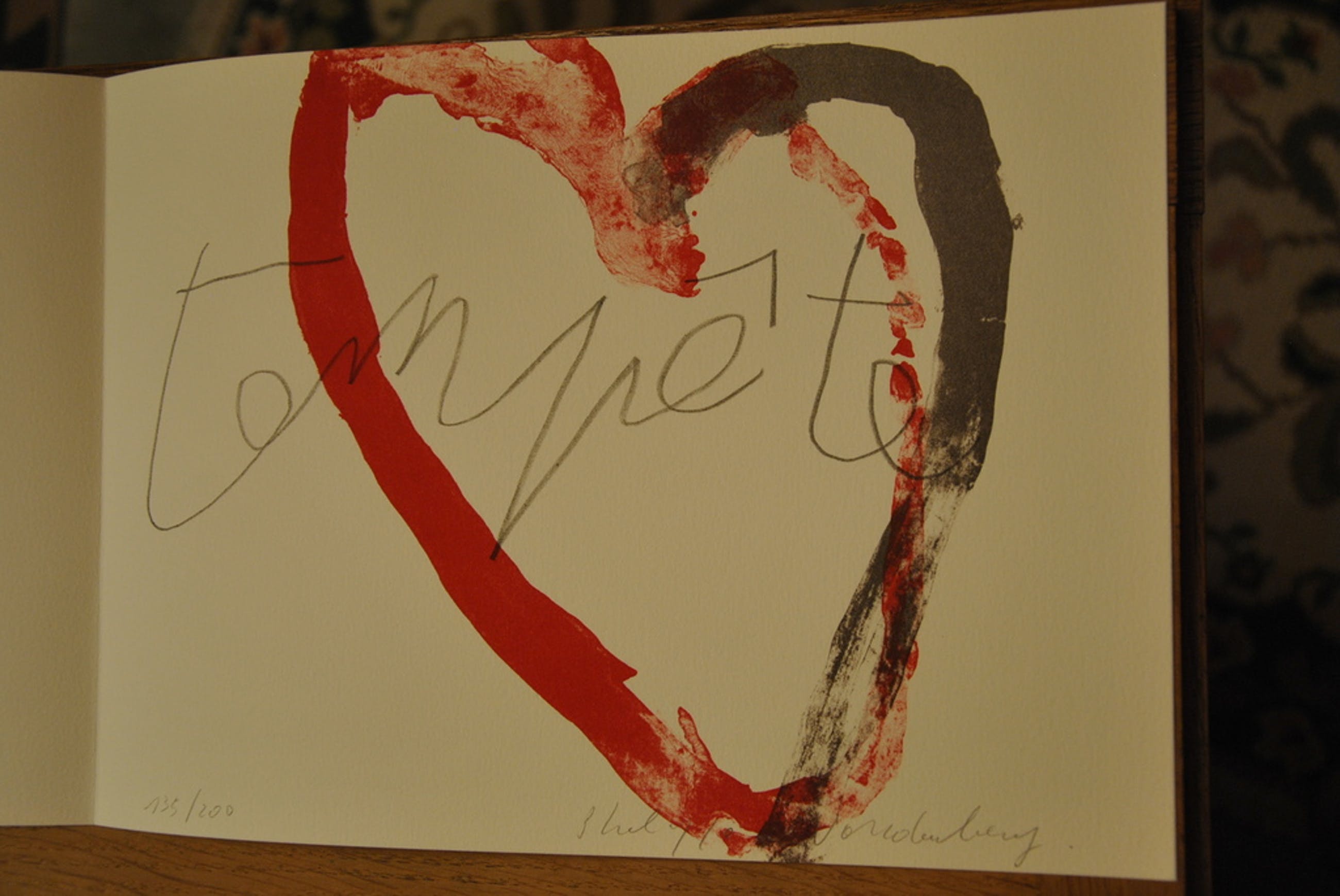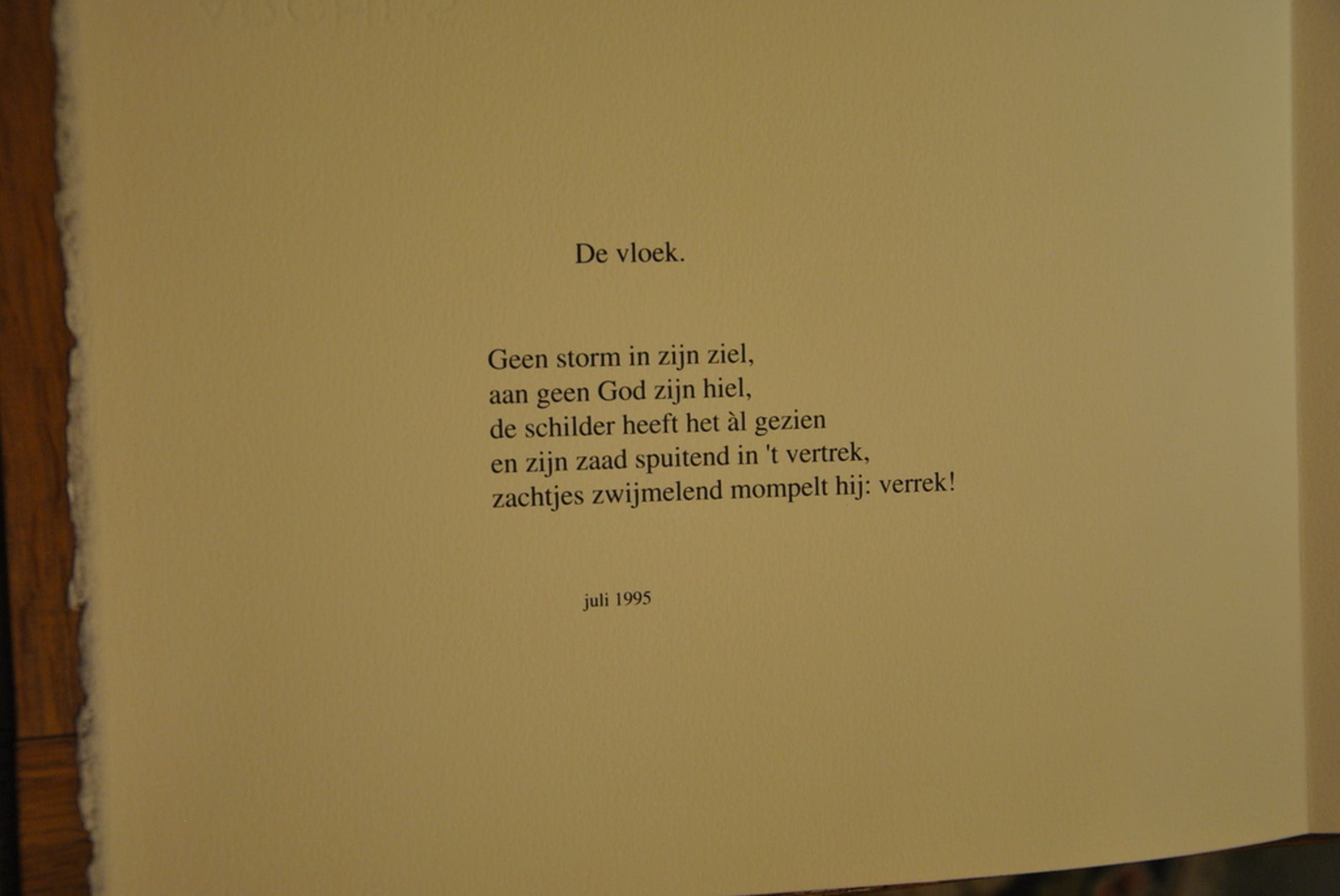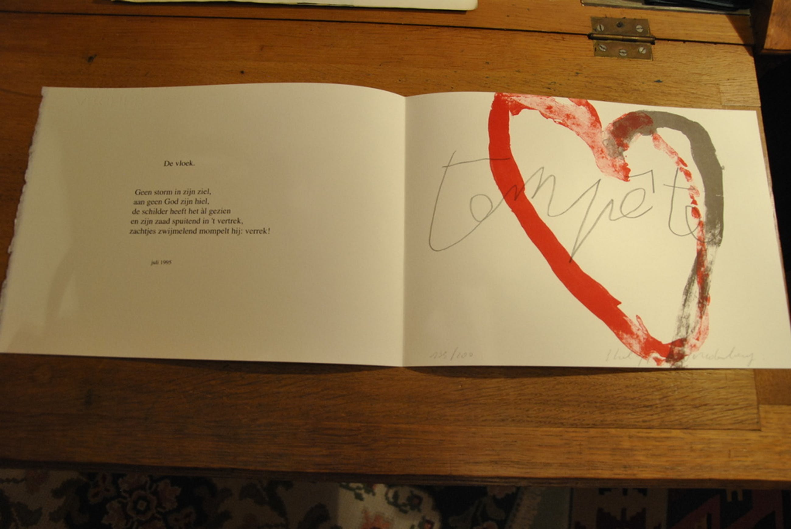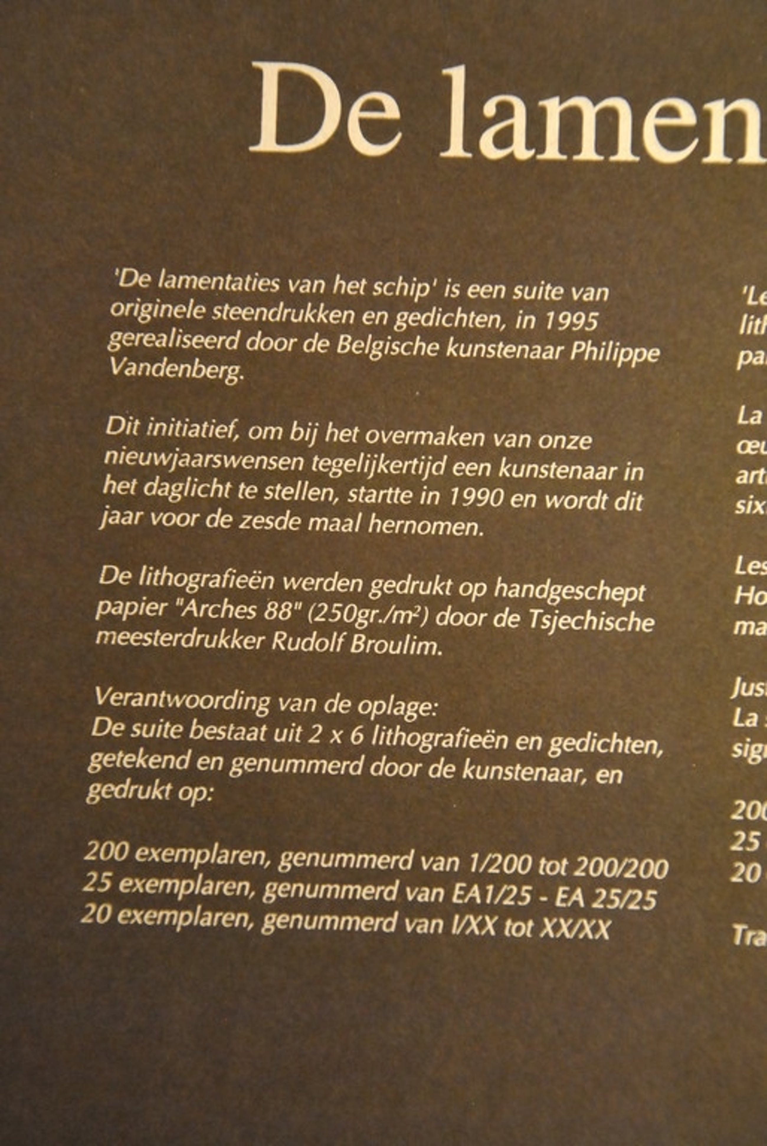 Het betreft de originele afdruk van een lithografie met gedicht op A4-formaat, gerealiseerd door de Belgische kunstenaar Philippe Vandenberg in 1995. Het is een exemplaar uit een suite van 2 x 6 lithografieën en gedichten, getiteld “De lamentaties van het schip”. De lithografie is getekend en genummerd door de kunstenaar. Het draagt nr. 136/200. Niet ingelijst.