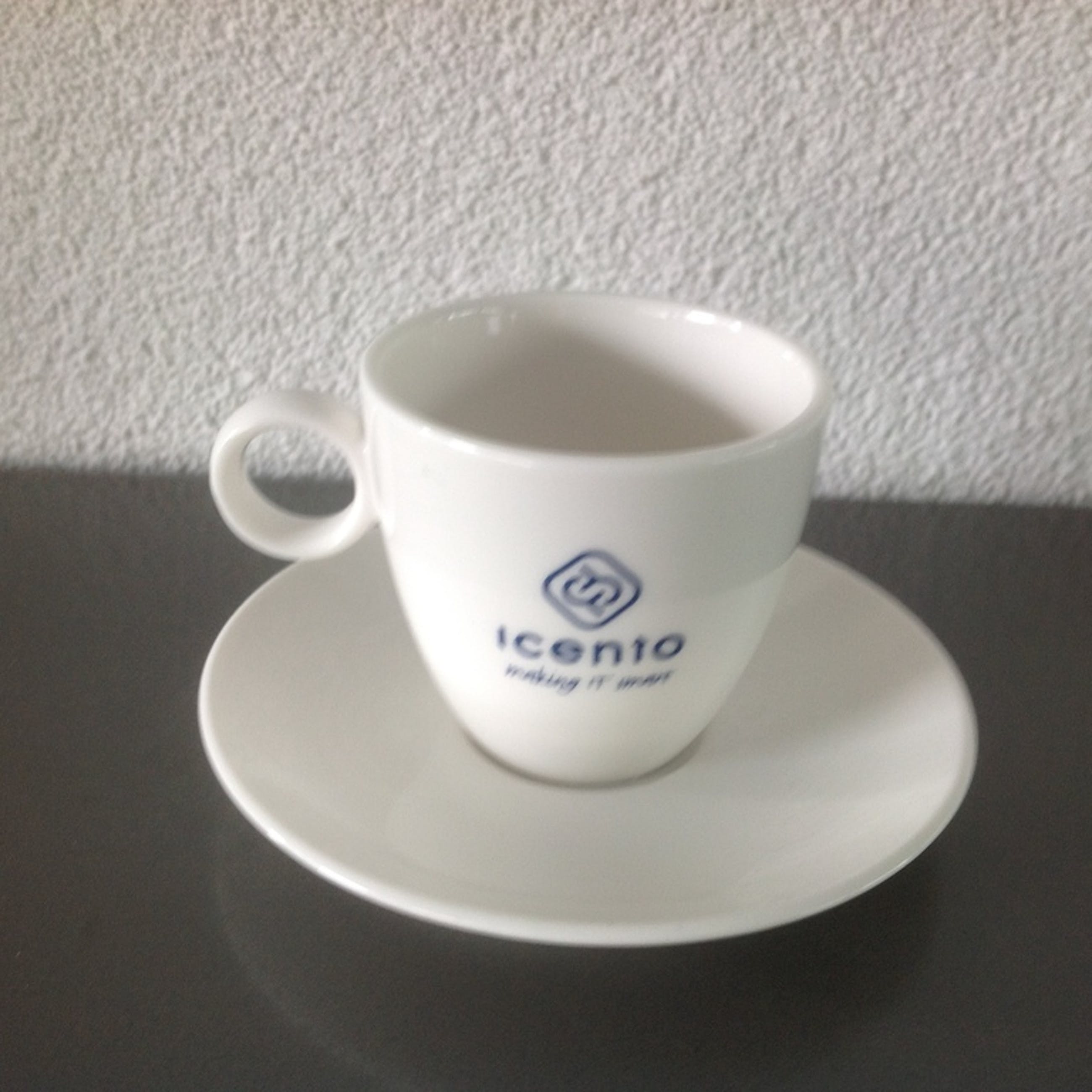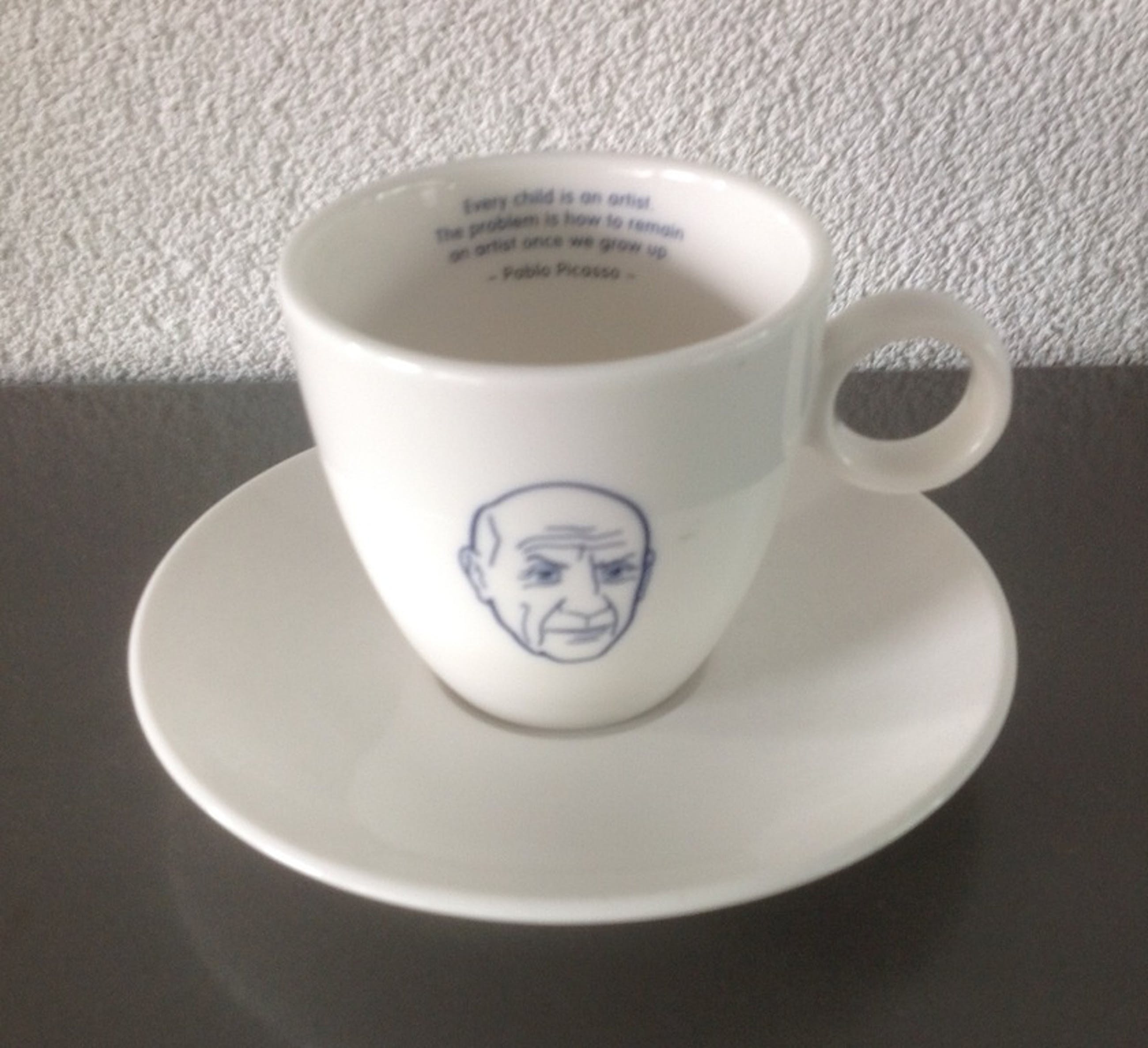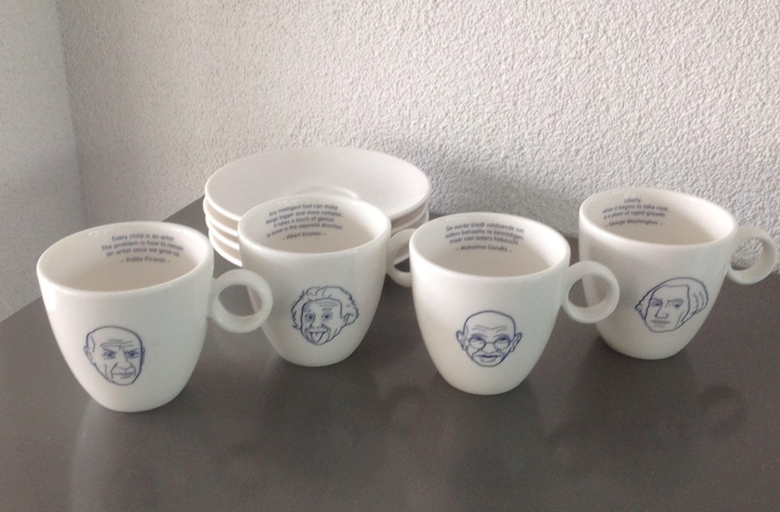 Vier kop en schotels met afbeeldingen en uitspraken van Picasso, Einstein, Gandhi en Washington.