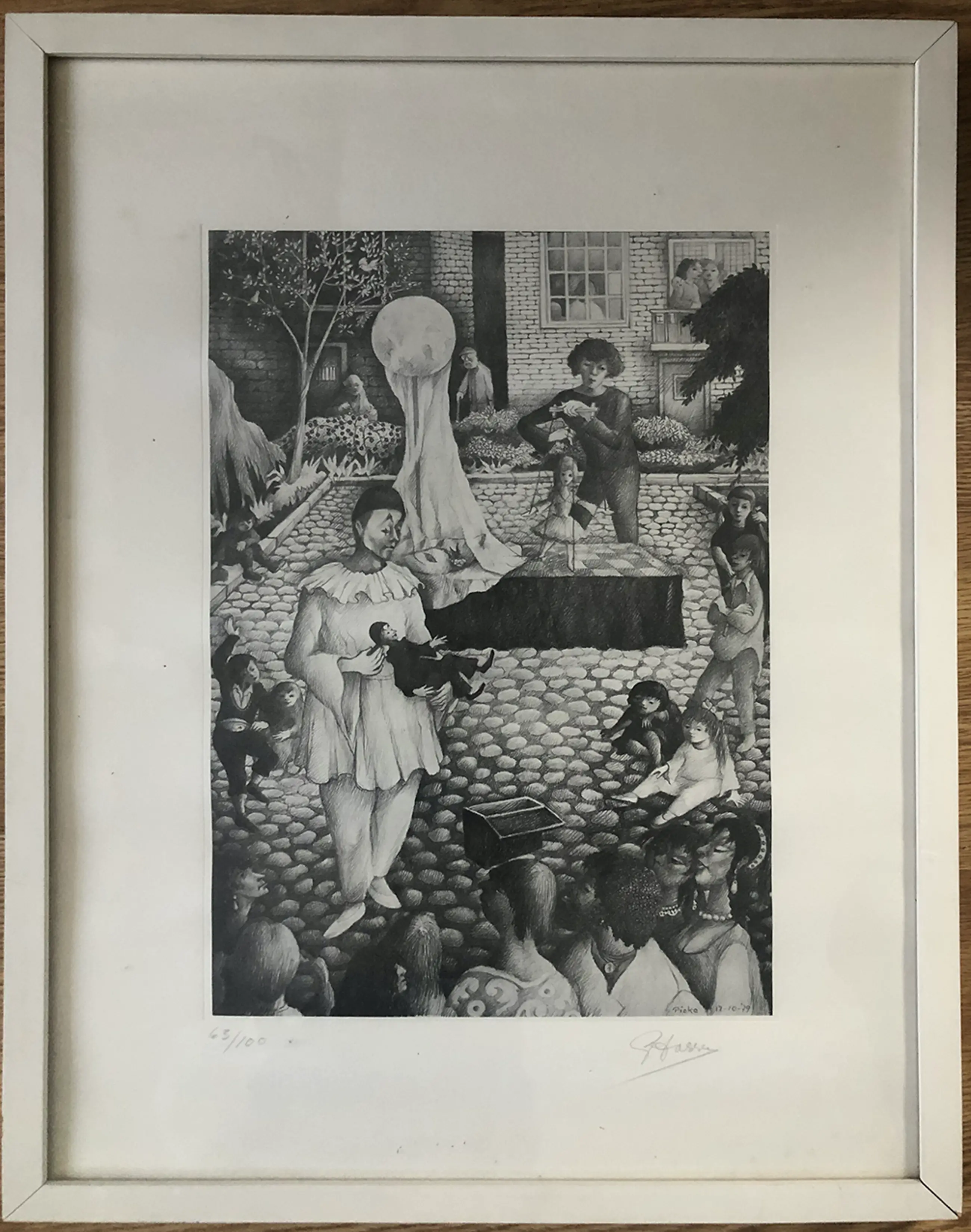 Mooie grote litho van Pieke Dassen. Voorstelling is licht surrealistisch met een theater optreden op straat en zijn kenmerkende poppen.