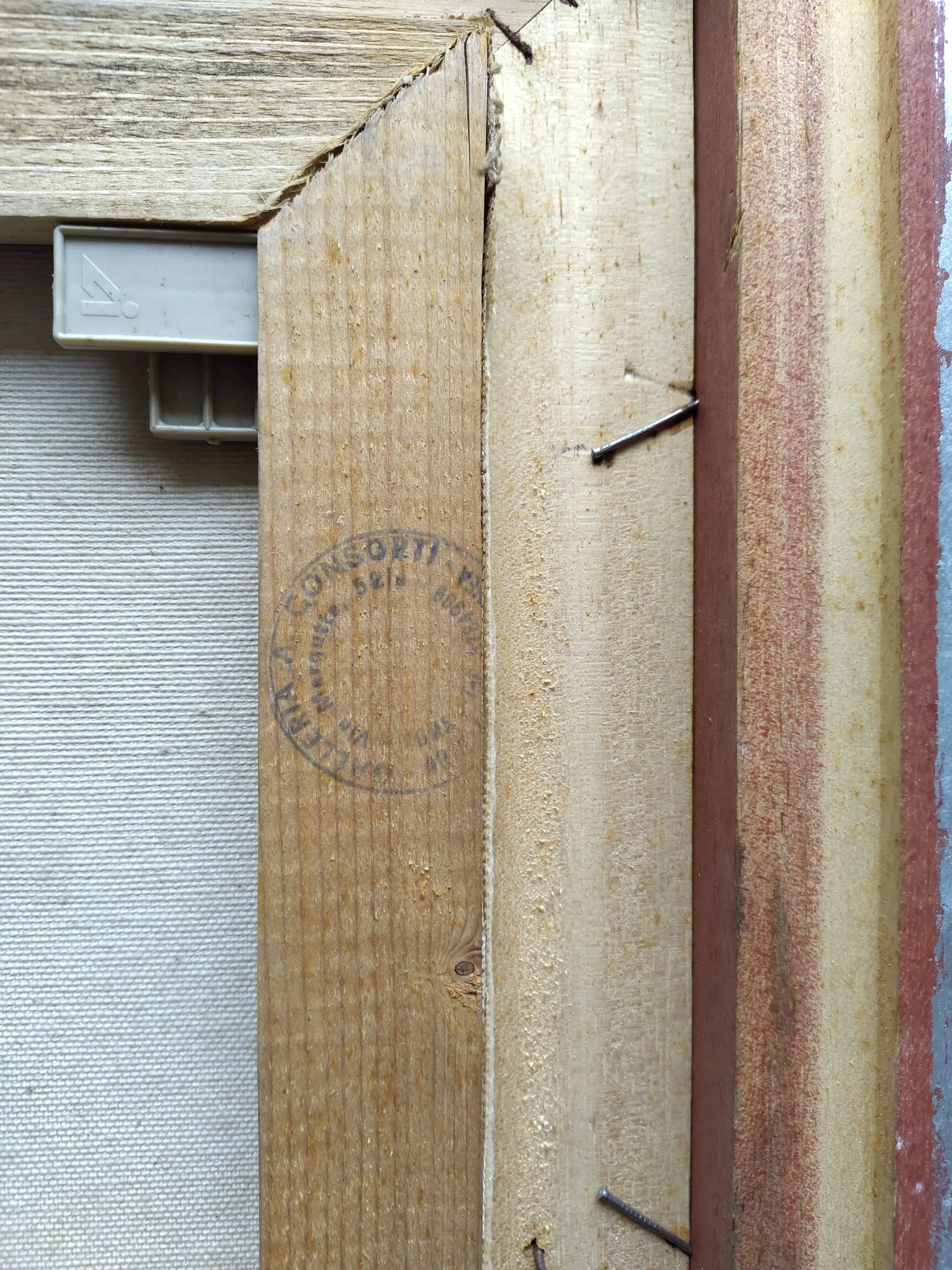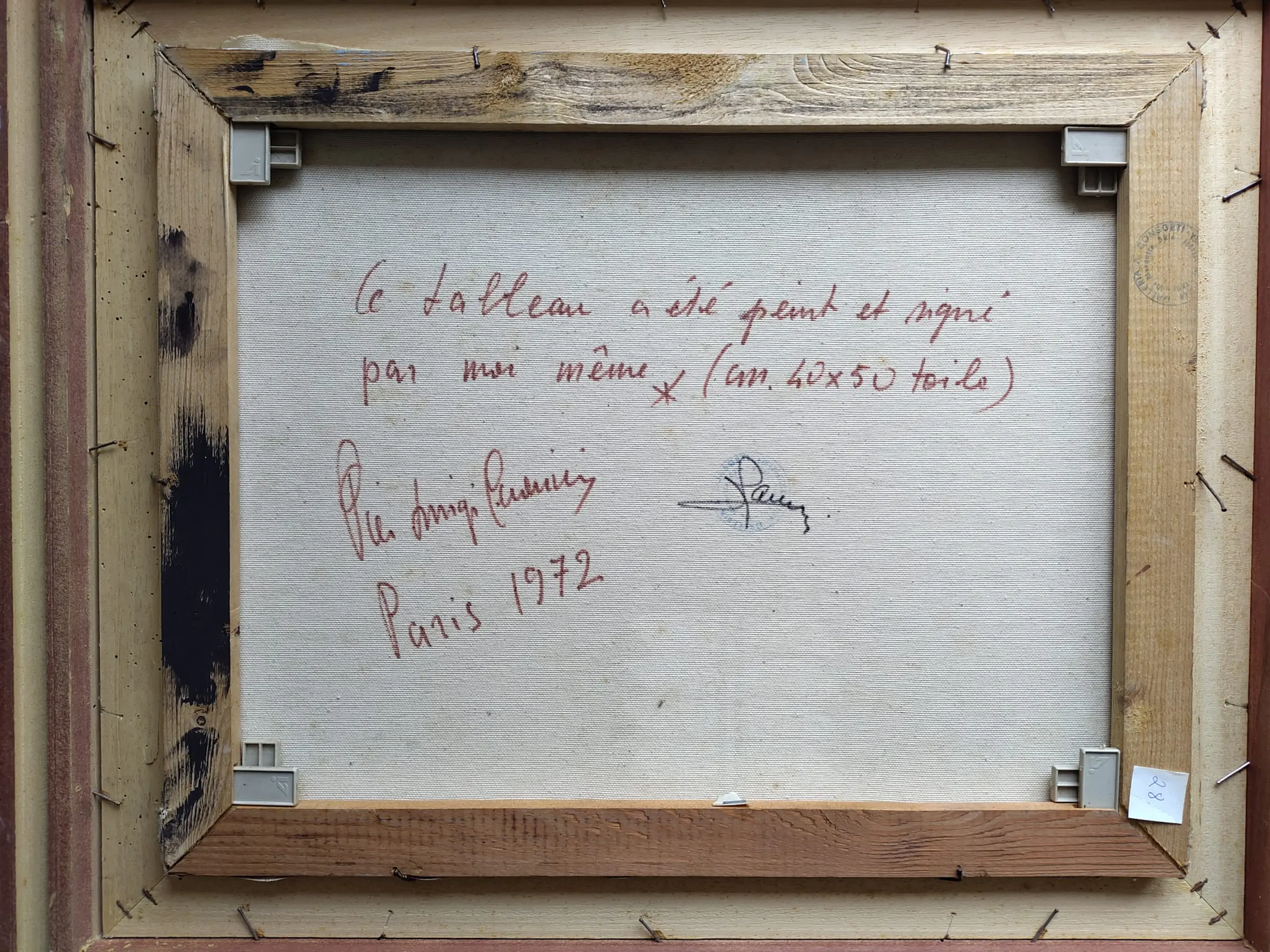 Op de achterkant van het doek bevindt zich een handgeschreven inscriptie van de kunstenaar, waarin staat dat het schilderij door hemzelf is geschilderd en gesigneerd, in Parijs in 1972, in het formaat 40 × 50 cm.