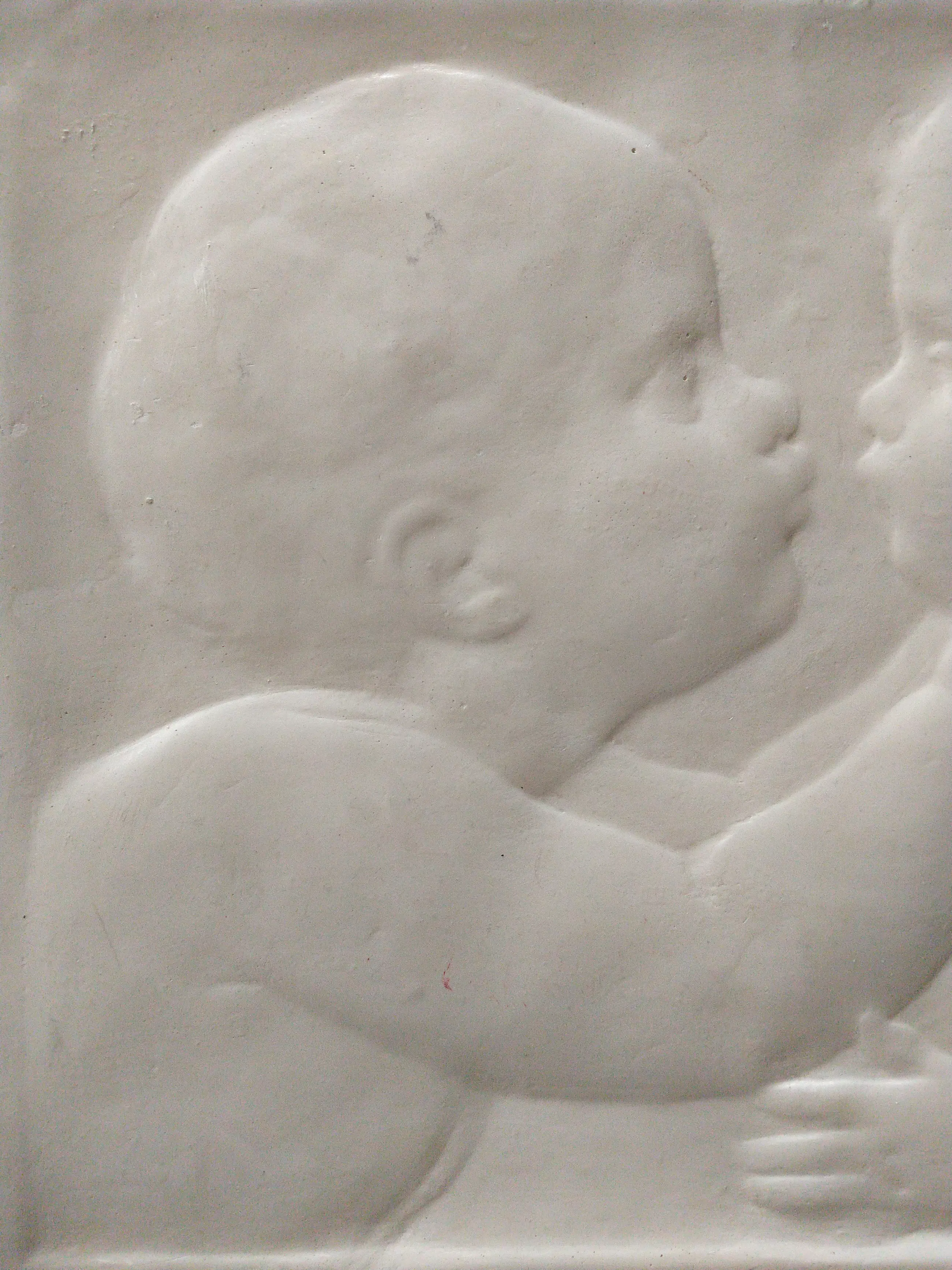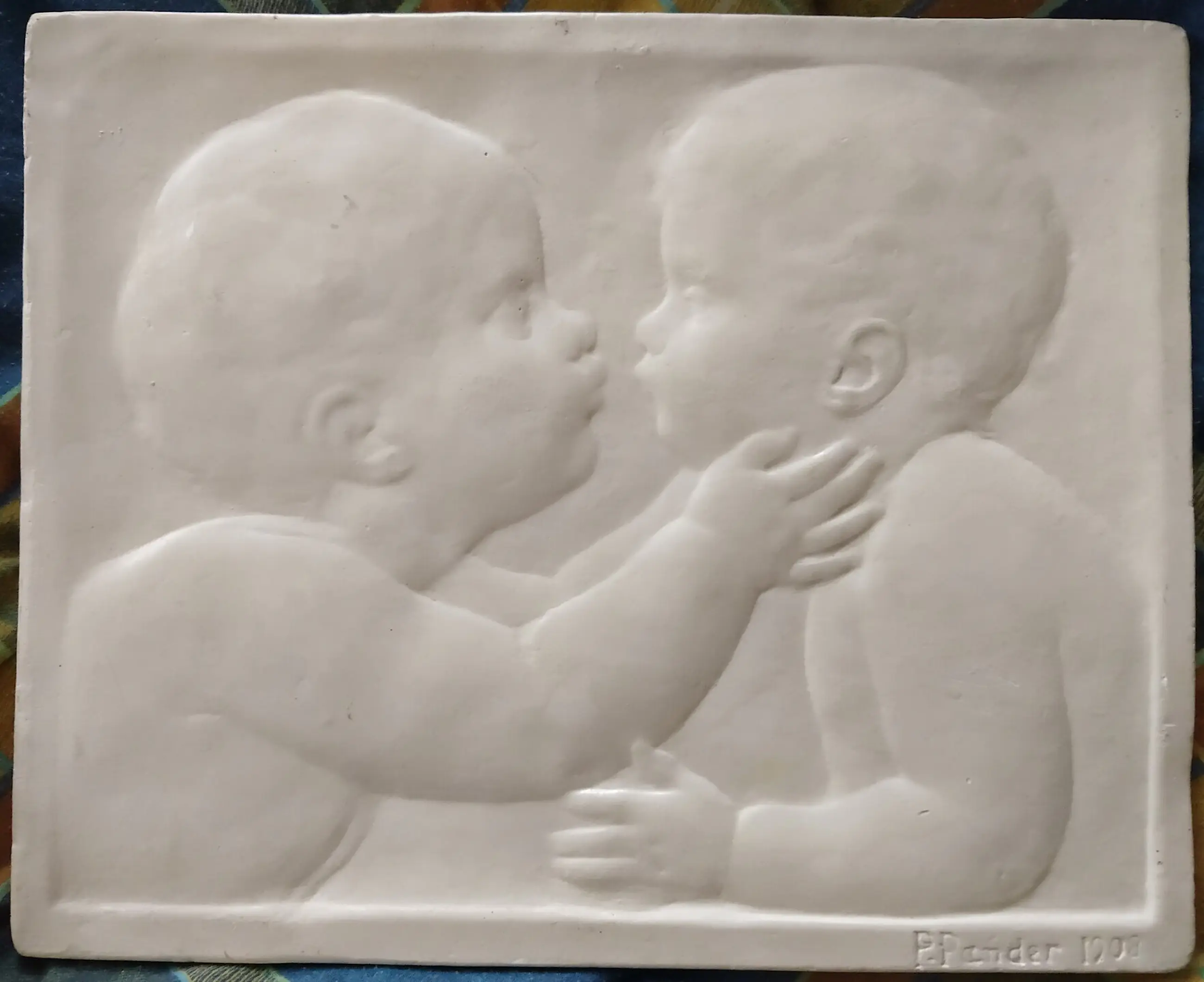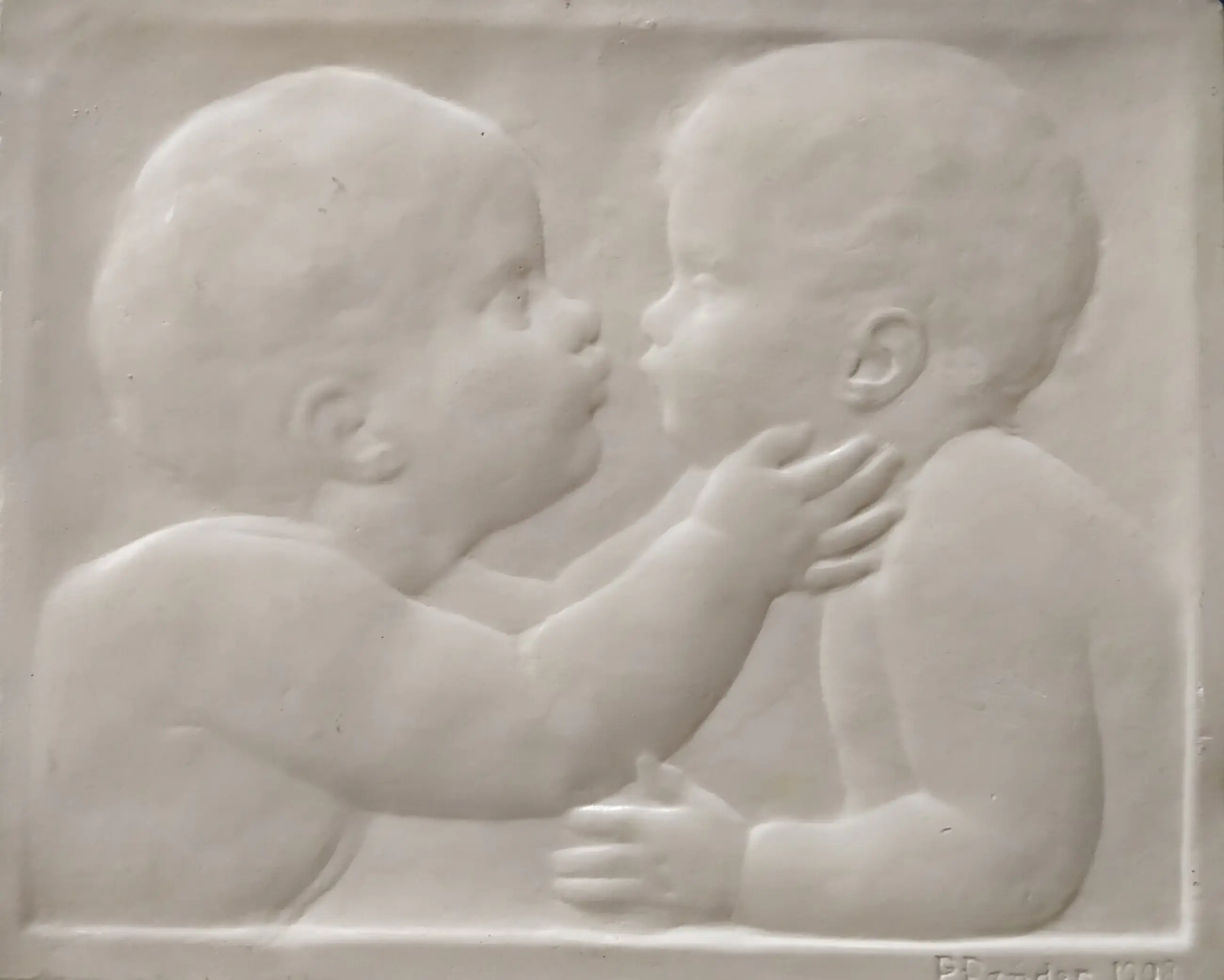 Twee broertjes. Gipsen plaquette uit 1908 van de bekende beeldhouwer Pier Pander. Het object is in goede staat. Afmeting 28x34 cm.
