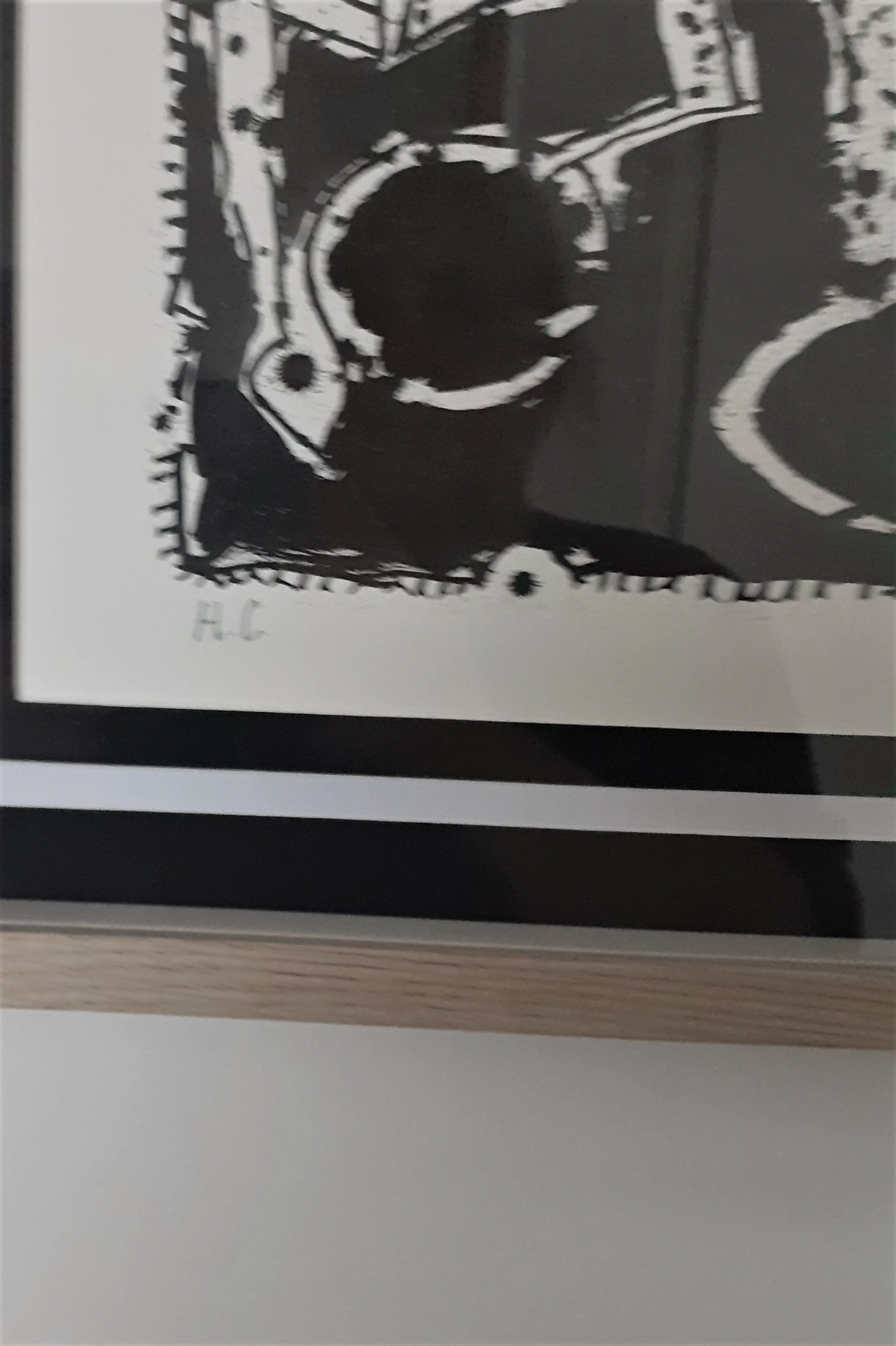 Subliem gelijst in lichtgekleurde houten lijst met dubbele passepartout voorzien van zuurvrij blad.