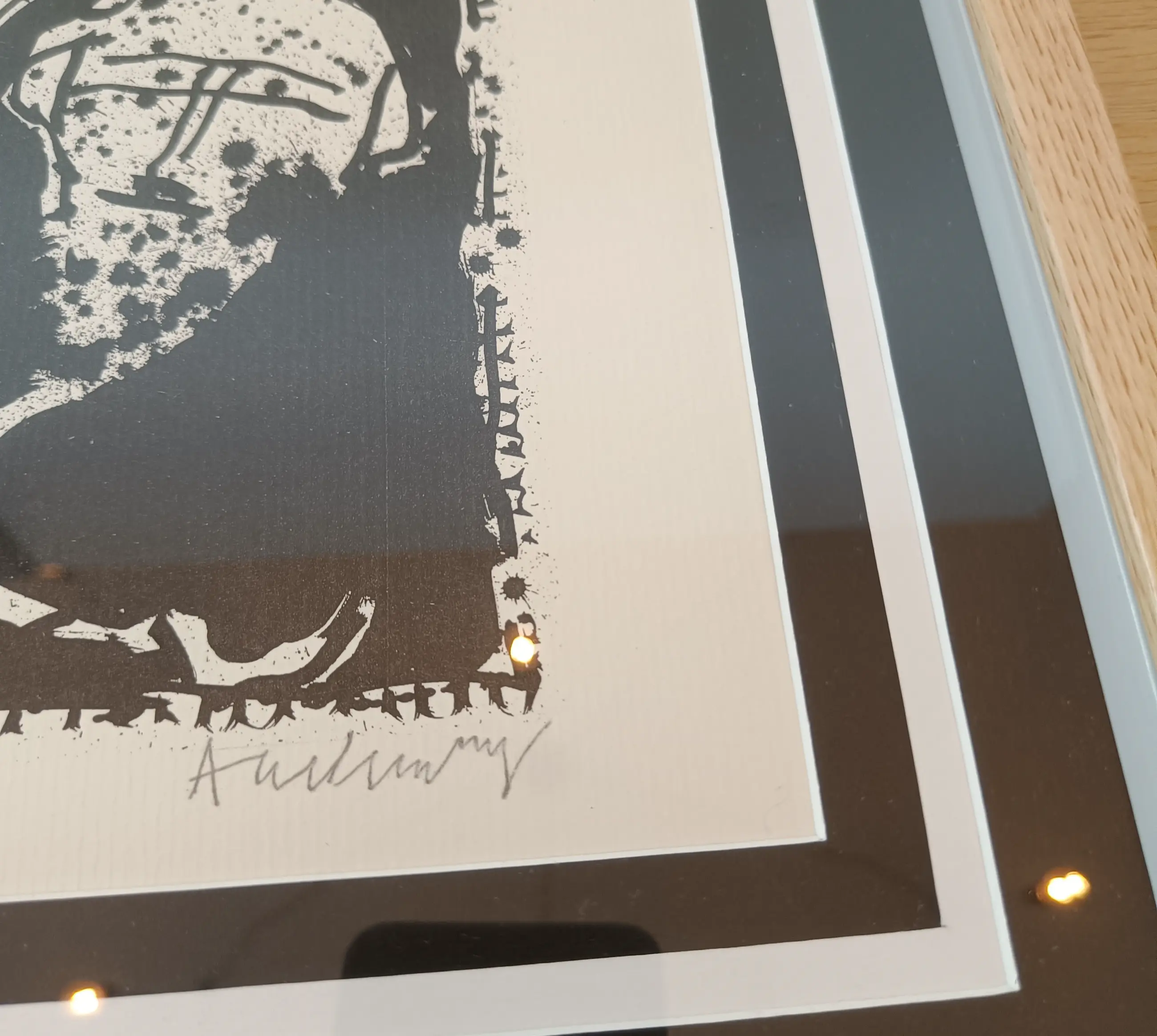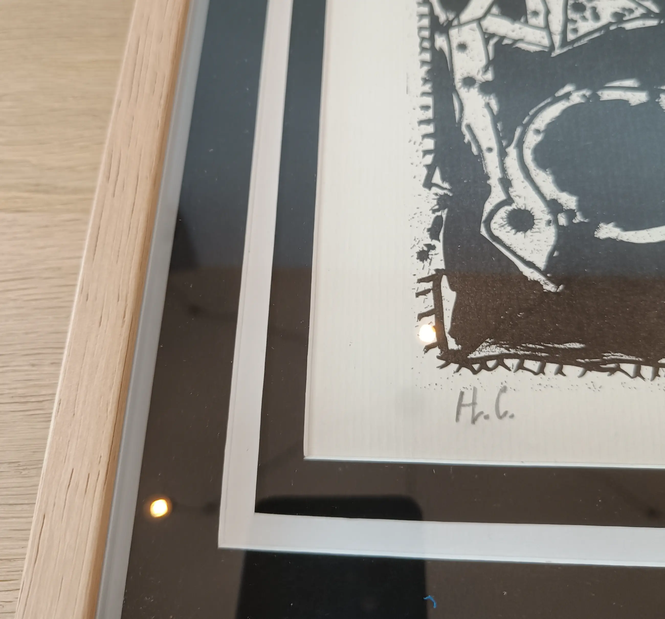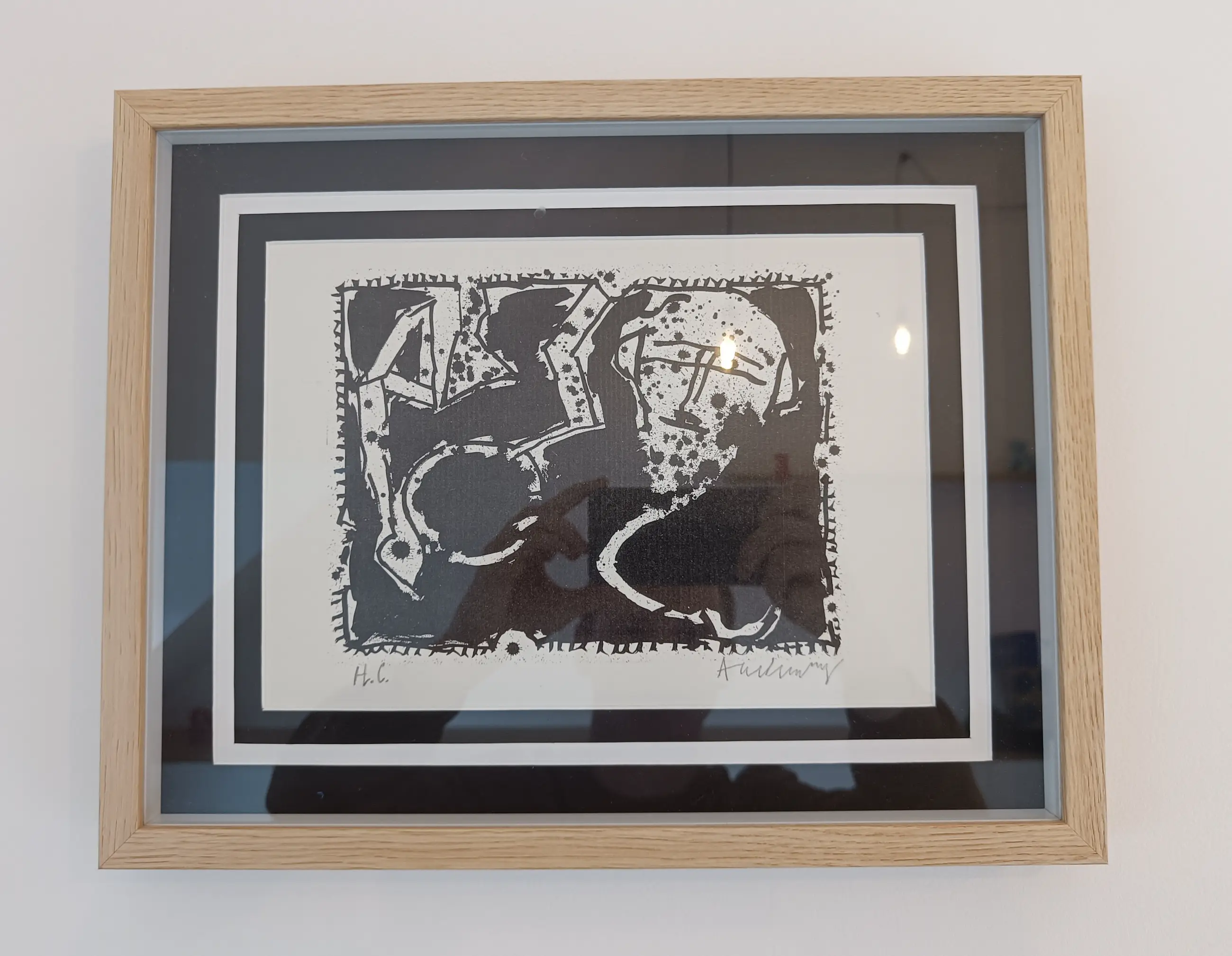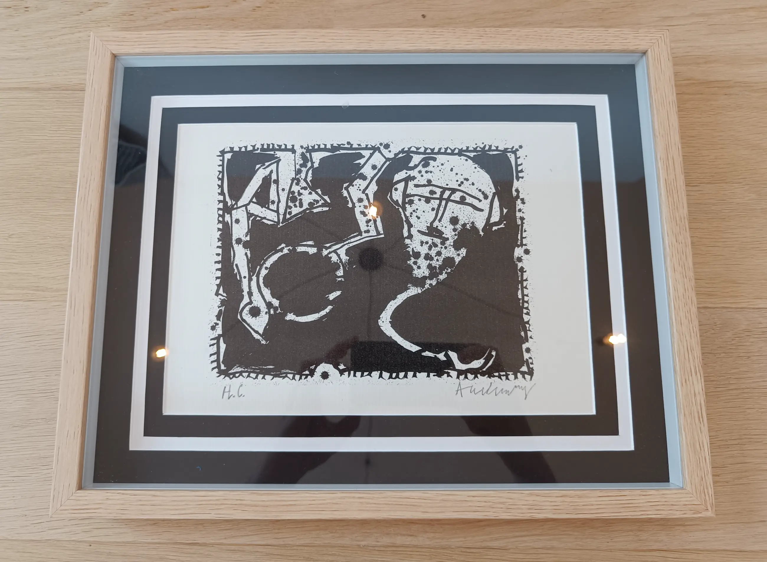 Ingelijst in lichtgekleurde houten lijst met dubbele passepartout voorzien van zuurvrij blad.