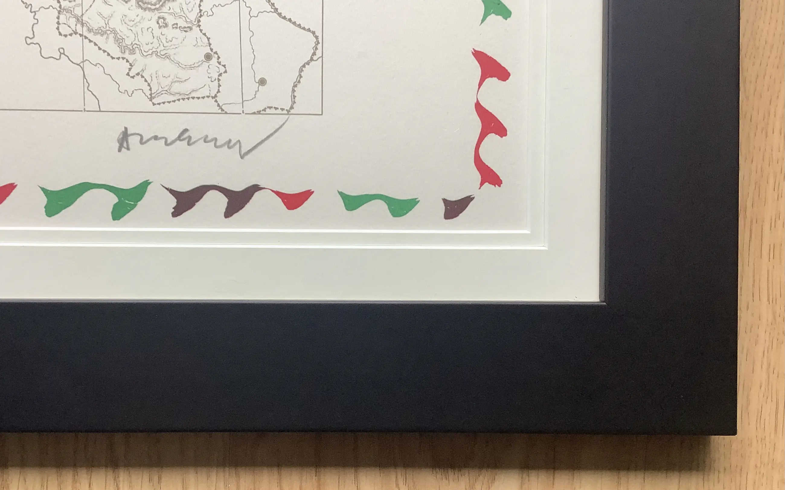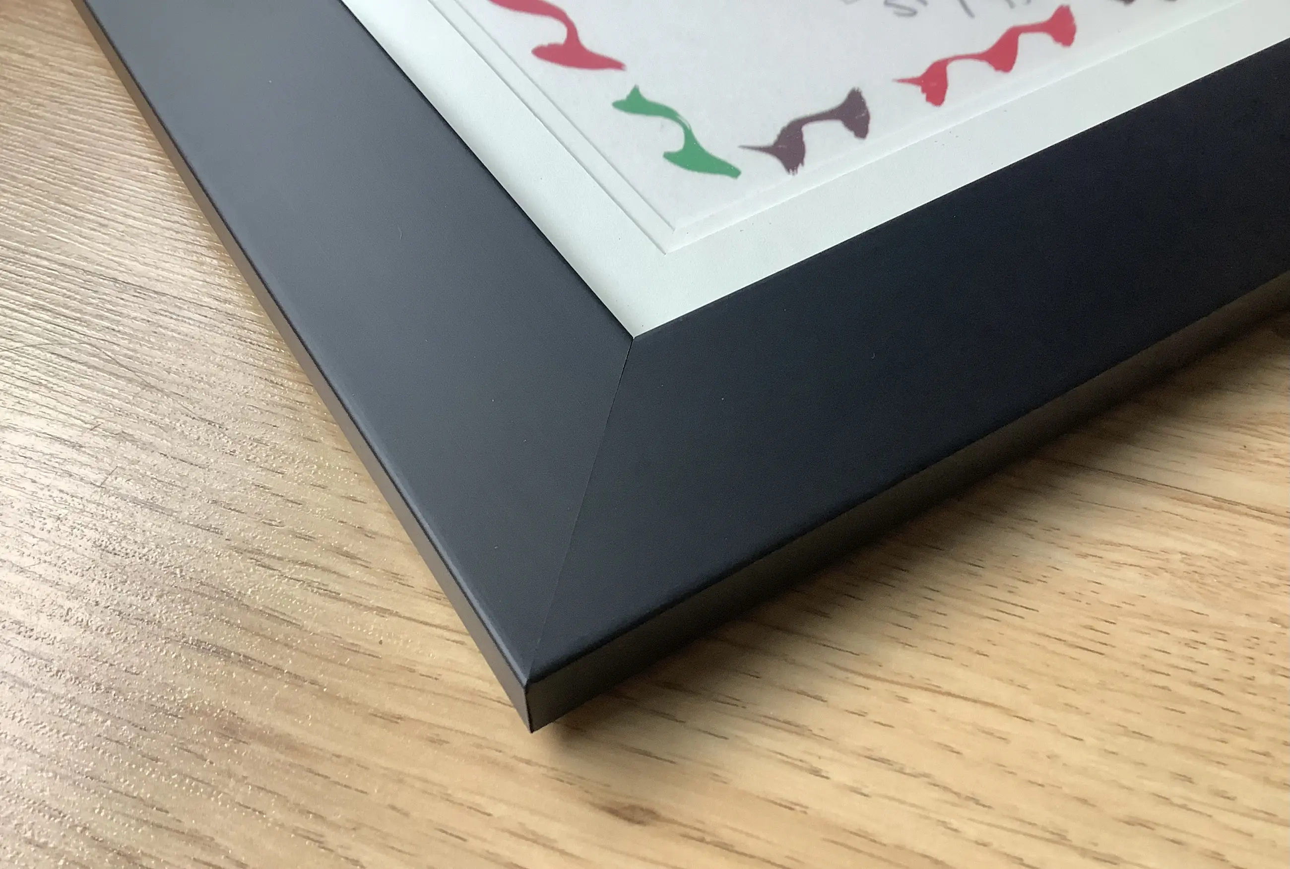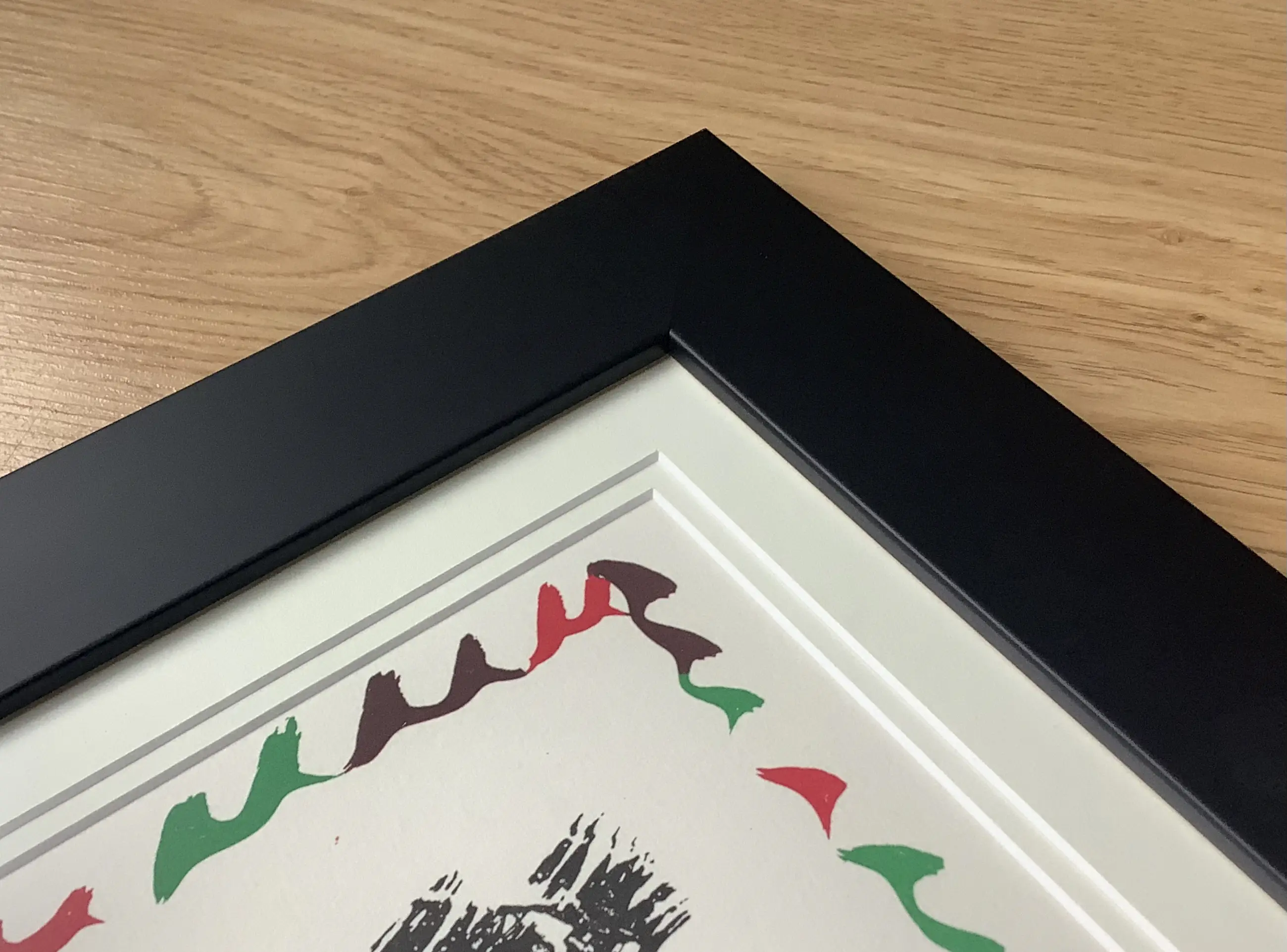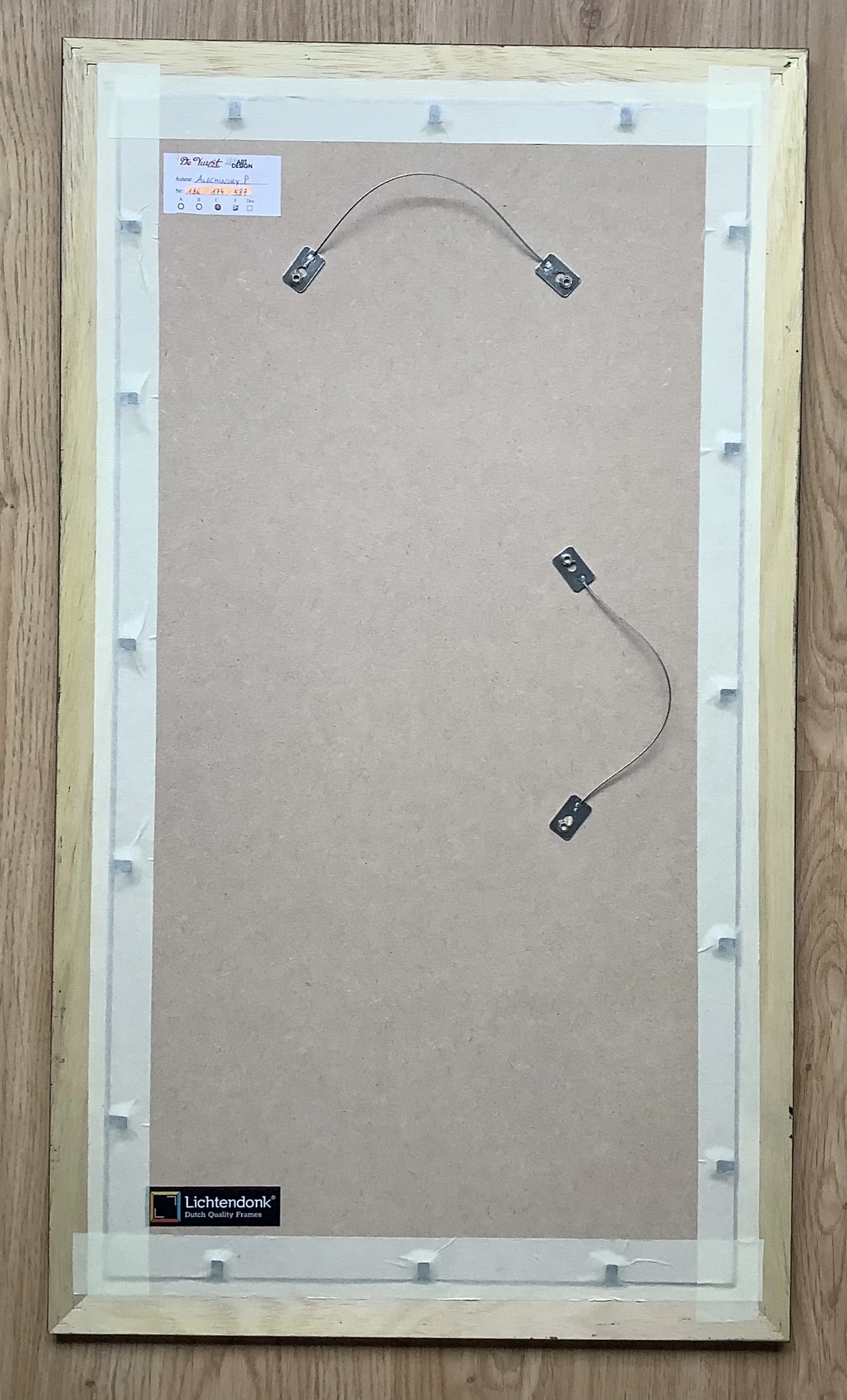 Afmeting lijst: 44 x 76,5 cm. Betreft nieuwe zwarte houten lijst in prachtig dubbel pars partout. Breedte lijst 4 cm, hoogte 1,5 cm. Kan zo aan de muur, beperkte oplage van 90 stuks.