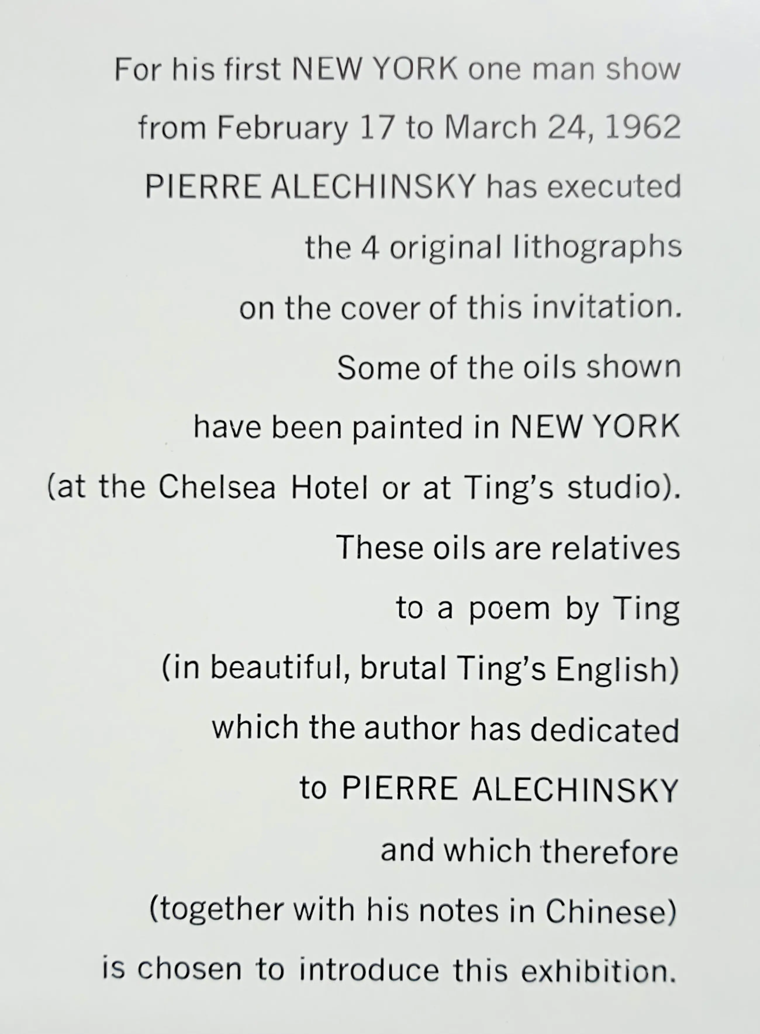 Complete catalogus uit 1962 met vier litho’s (allen op de uitklapbare omslag) ter gelegenheid van Alechinsky’s “first New York one man show” in Galerie Lefebre. In de catalogus ook reproducties van zijn werk en een gedicht door Walasse Ting. In uitstekende conditie. Literatuur: Pierre Alechinsky - The Complete Books, nr. 297, afzonderlijke litho’s Rivière 157-160.