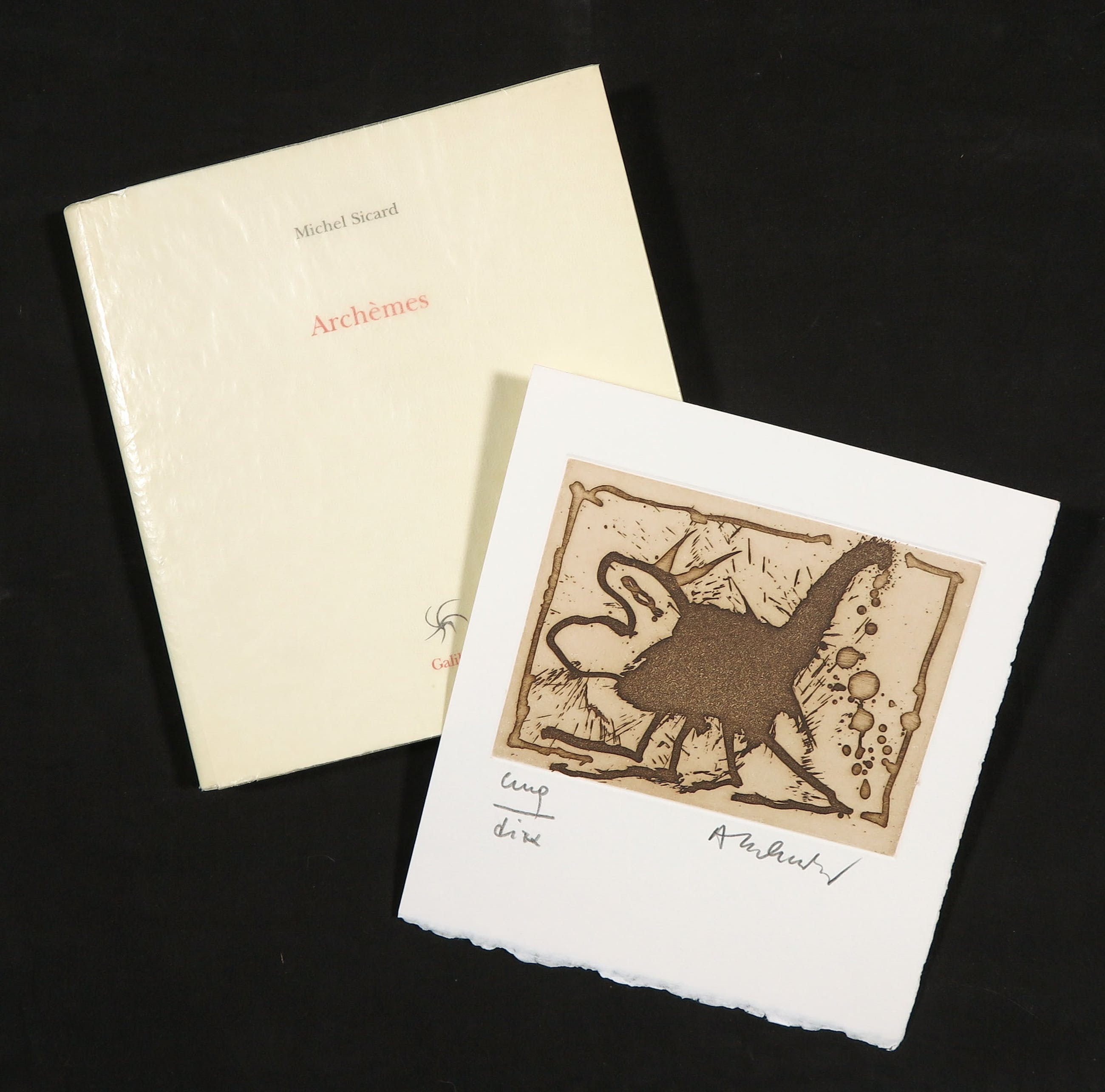 Lot met een handgesigneerde ets en aquatint door Pierre Alechinsky, en een boekje geschreven door Michel Sicard en uitgegeven door Galilée, voorzien van tien ongesigneerde afbeeldingen van Alechinsky.