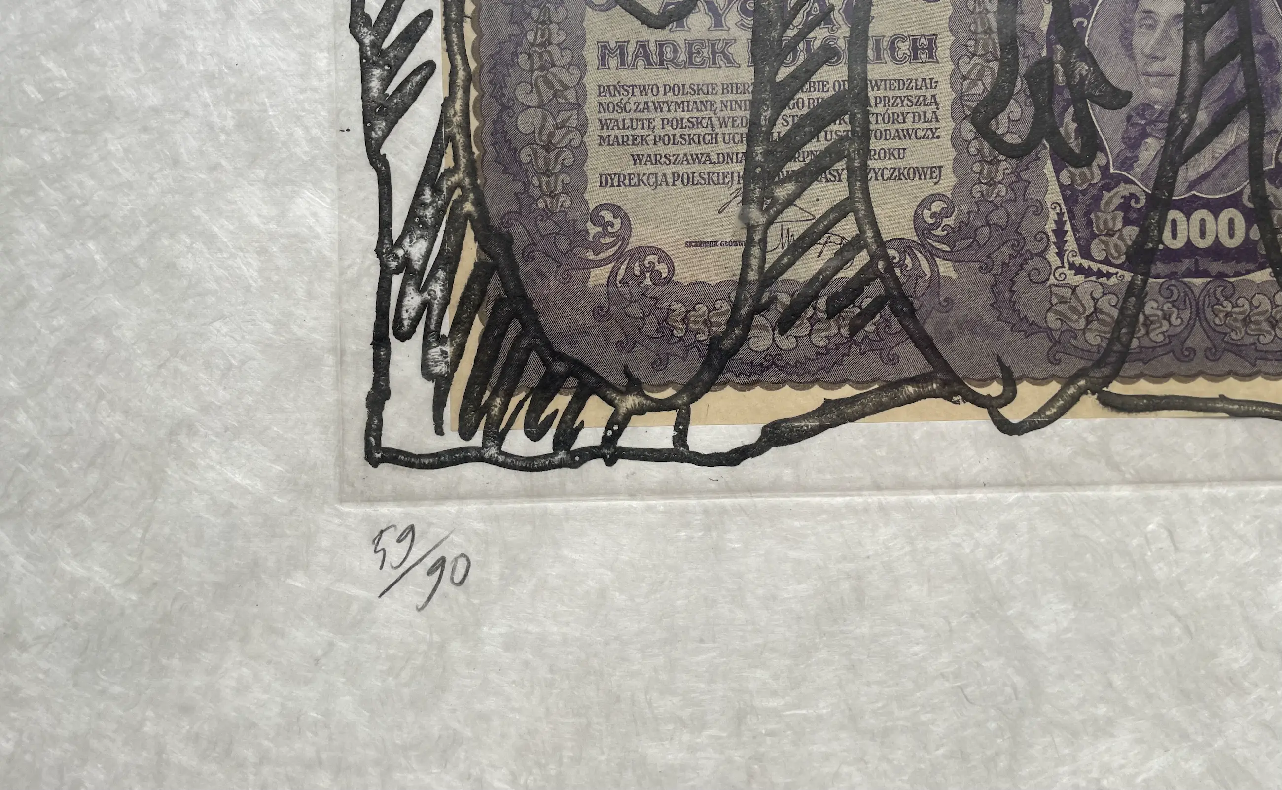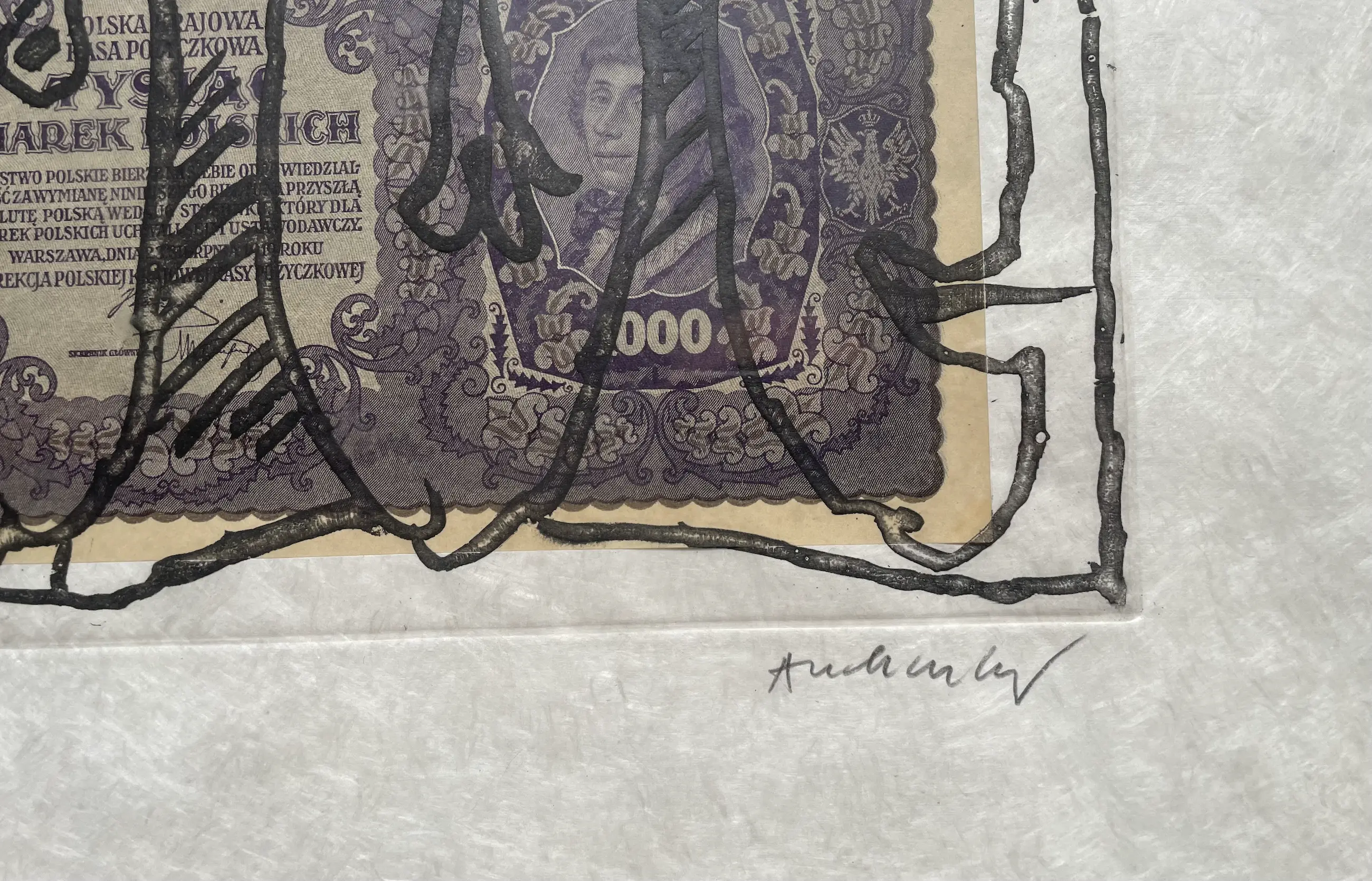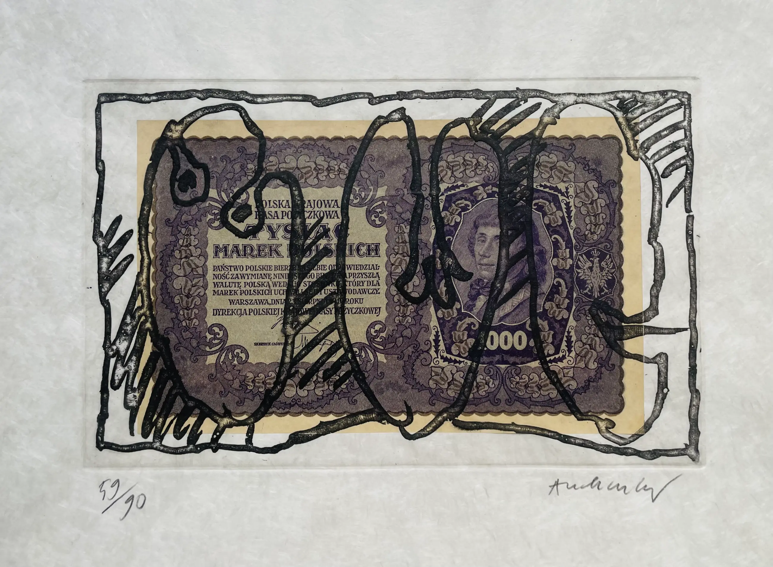 Intrigerende ets op bijzonder Japans papier (Japon nacré). Zie detailfoto. In de druk is een oud Pools biljet (1919) verwerkt.
