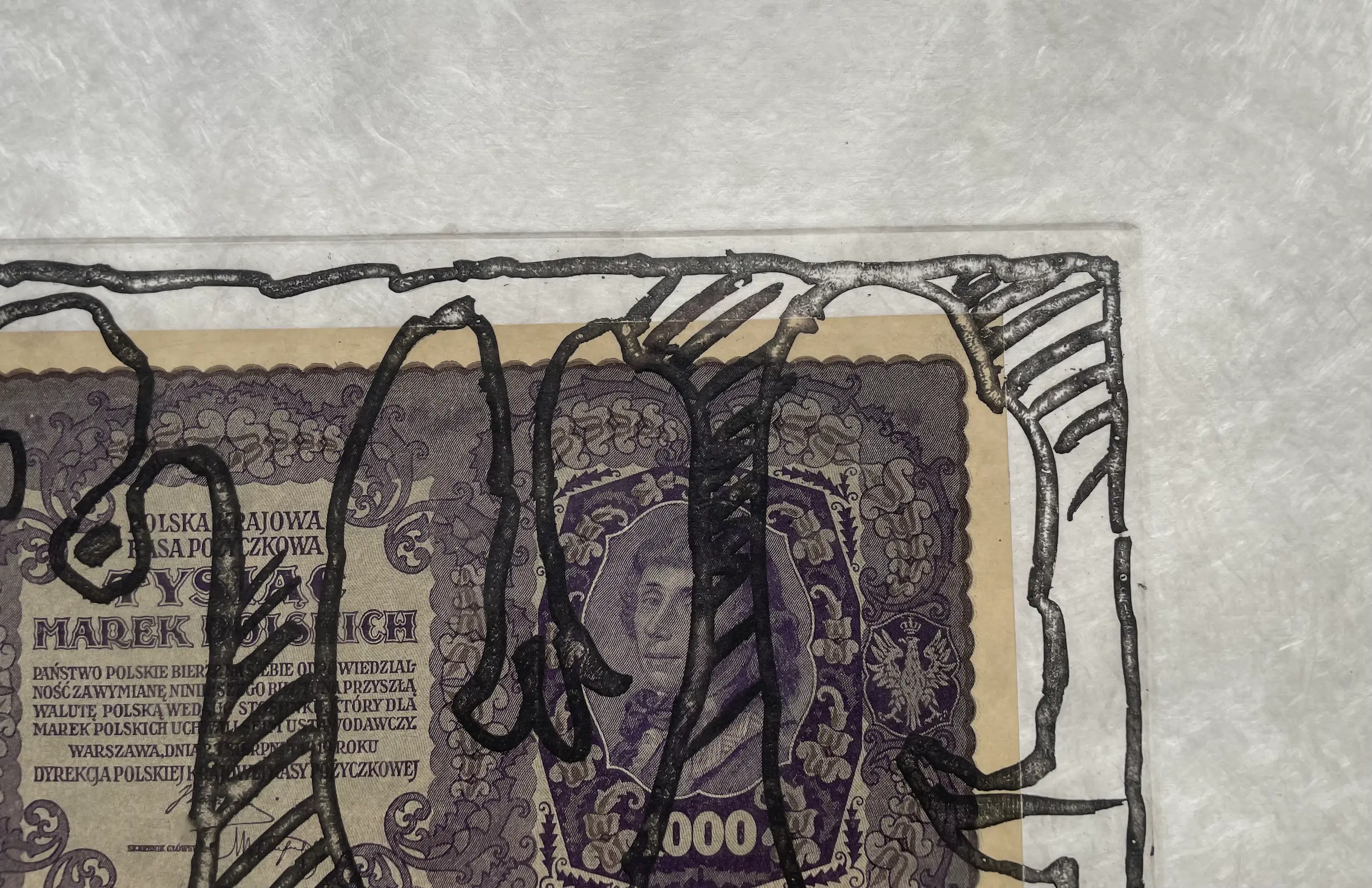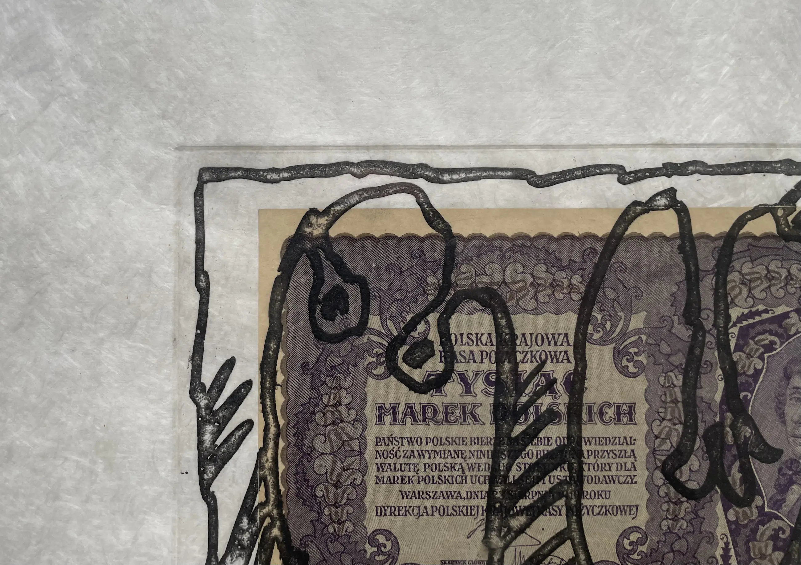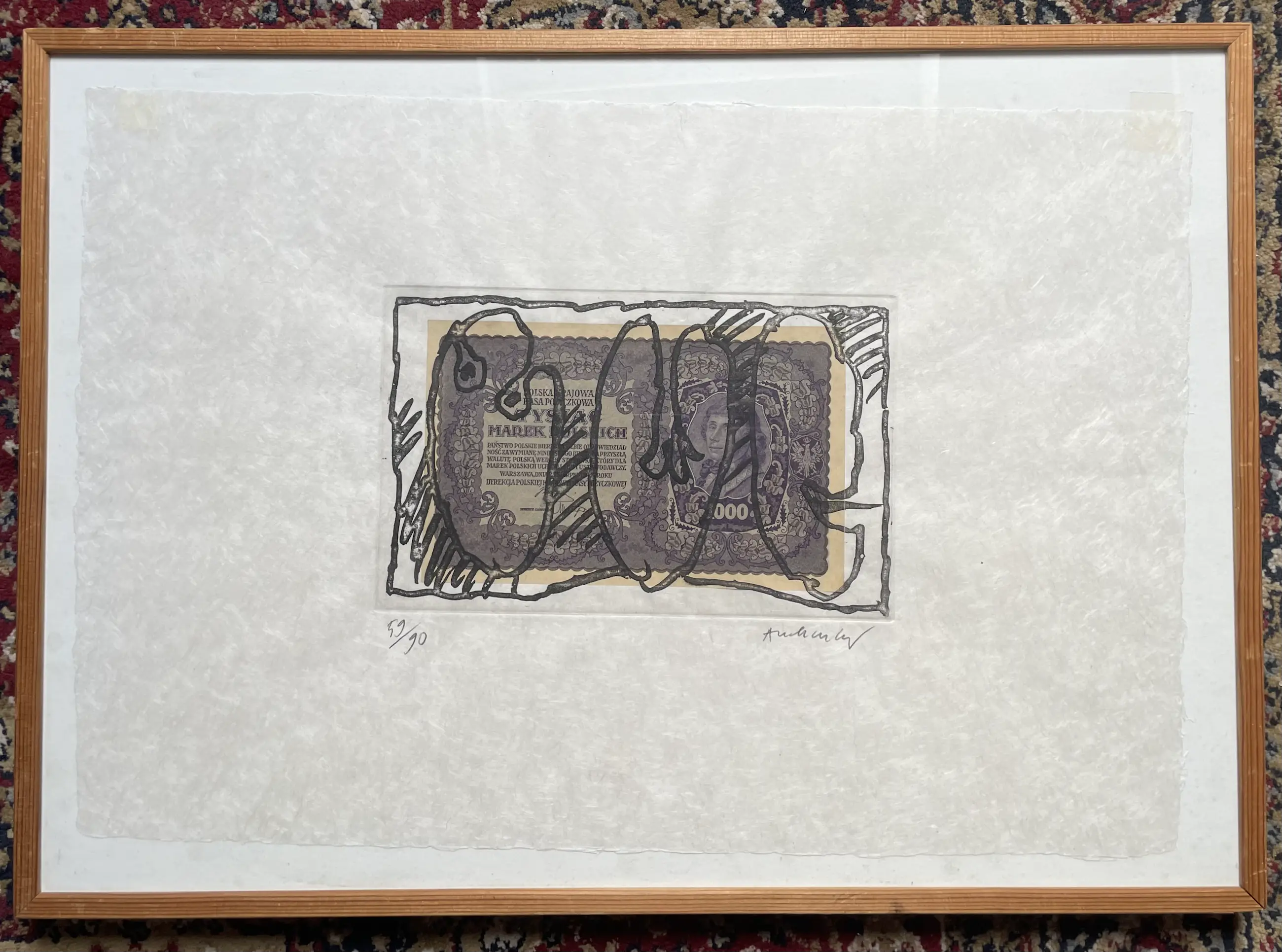 Intrigerende ets op bijzonder Japans papier (Japon nacré). Zie detailfoto. In de druk is een oud Pools biljet (1919) verwerkt.