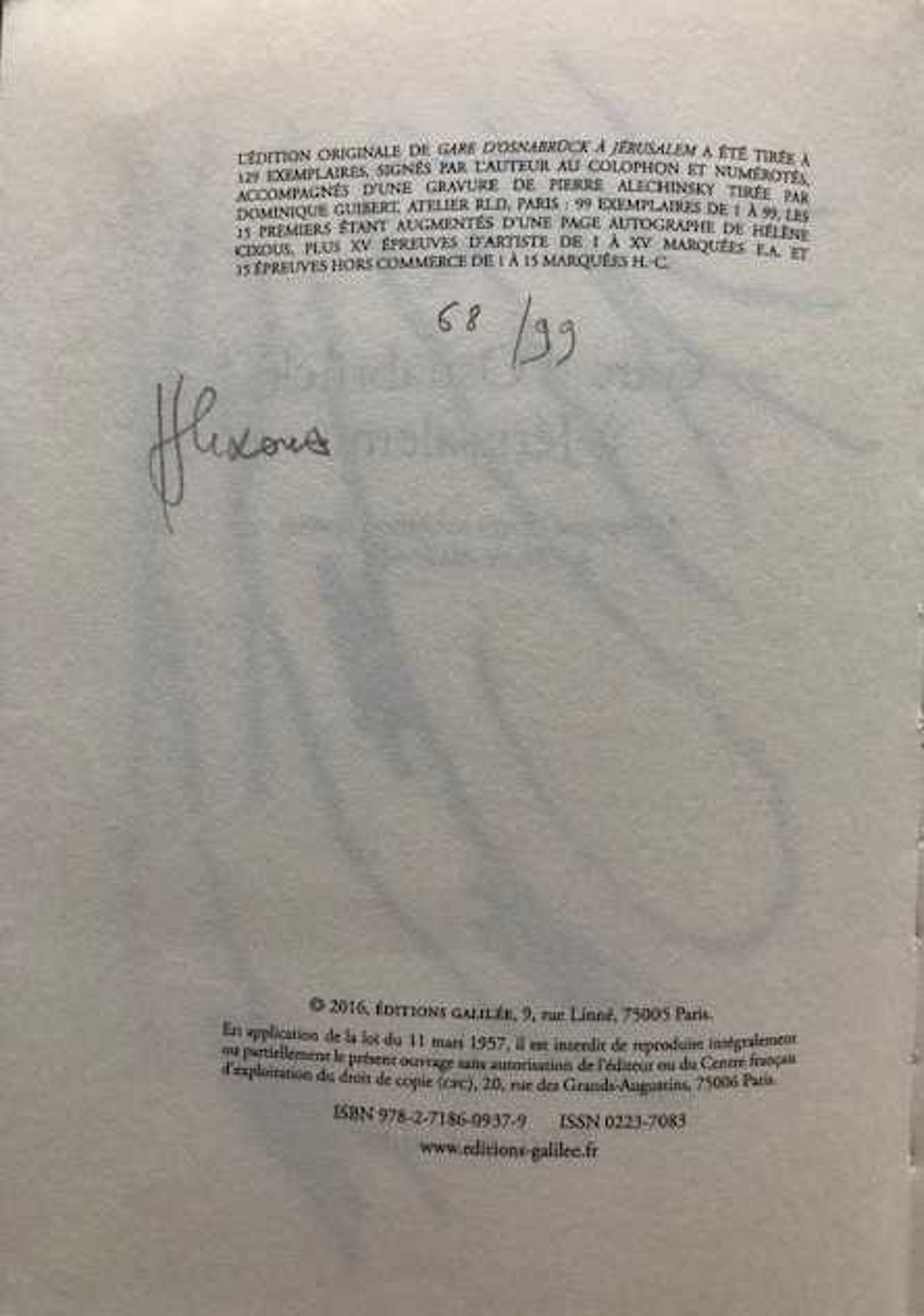 Kleurengravure van Pierre Alechinsky, nr. 68 uit oplage van 99 . Inclusief boek "Gare d'Osnabruck à Jérusalem" in de colofon ondertekend door Hélène Cixous. Boek bevat 7 tekeningen door Pierre Alechinsky.