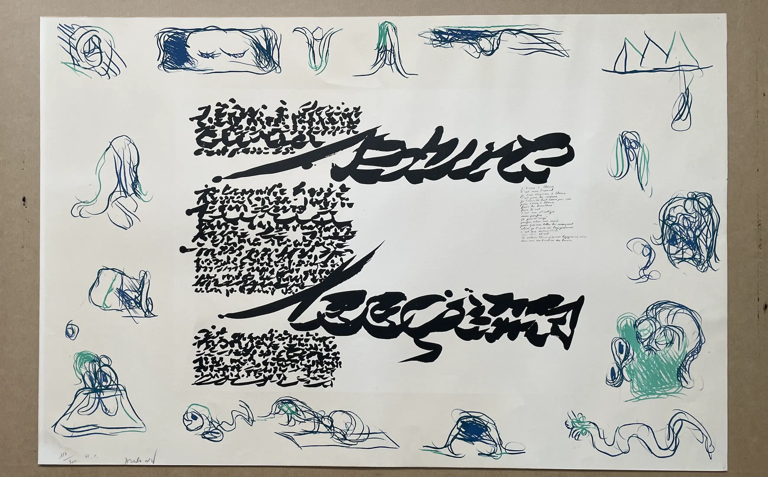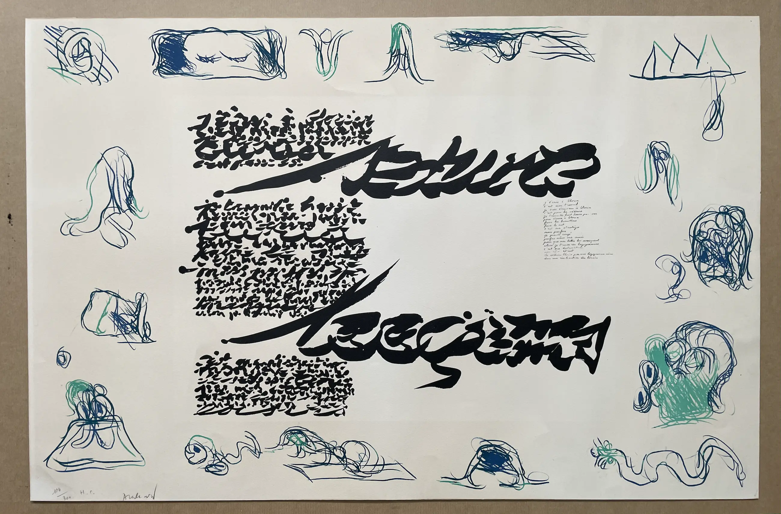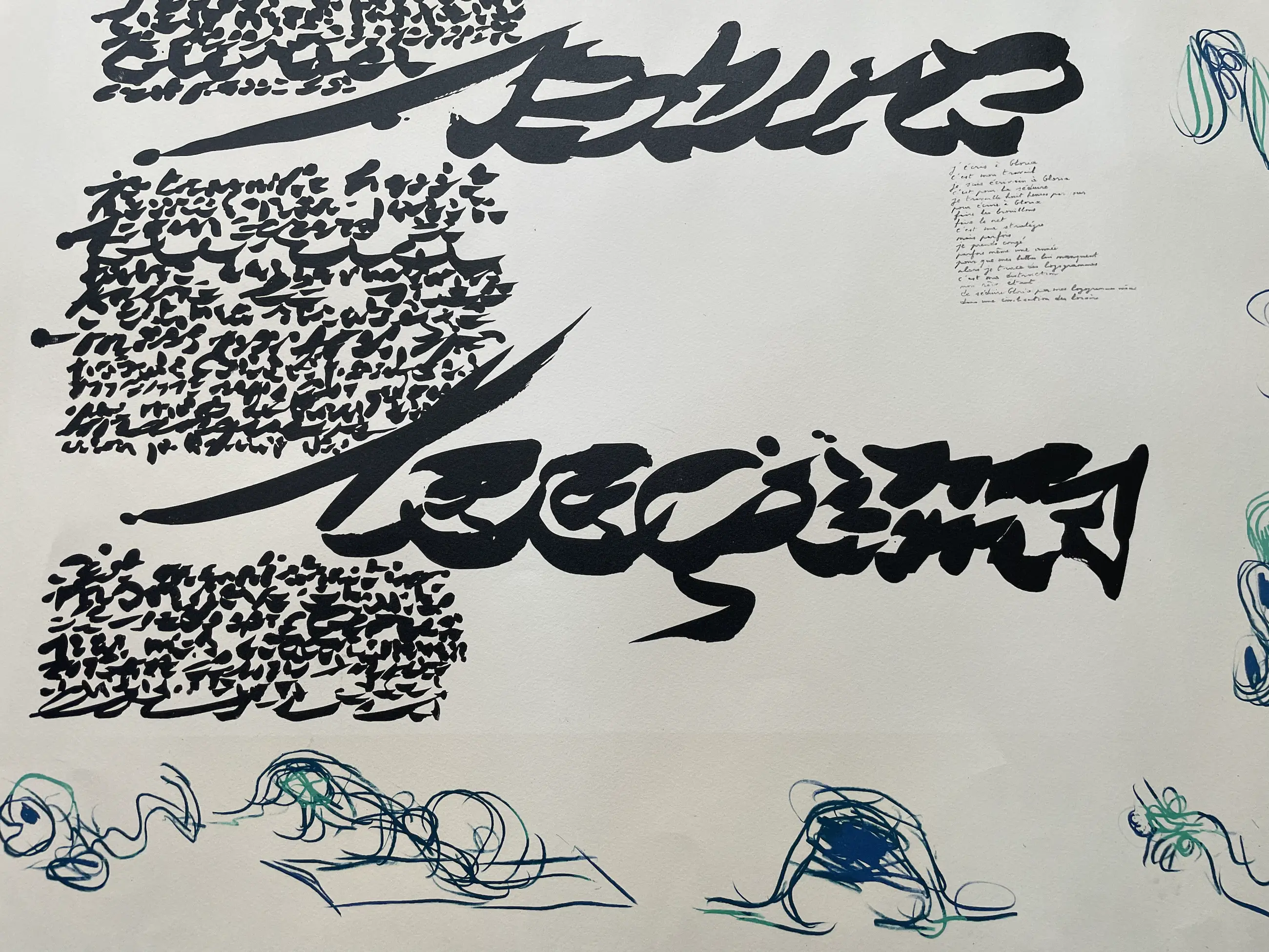 Het origineel van het logogram met het handgeschreven gedicht, dus zonder de randen van Alechinsky, staat in Centre Pompidou. Het gedicht ((J'écris à Gloria) schreef Christian Dortemont voor Gloria, een Deens meisje op wie hij in 1943 verliefd werd.