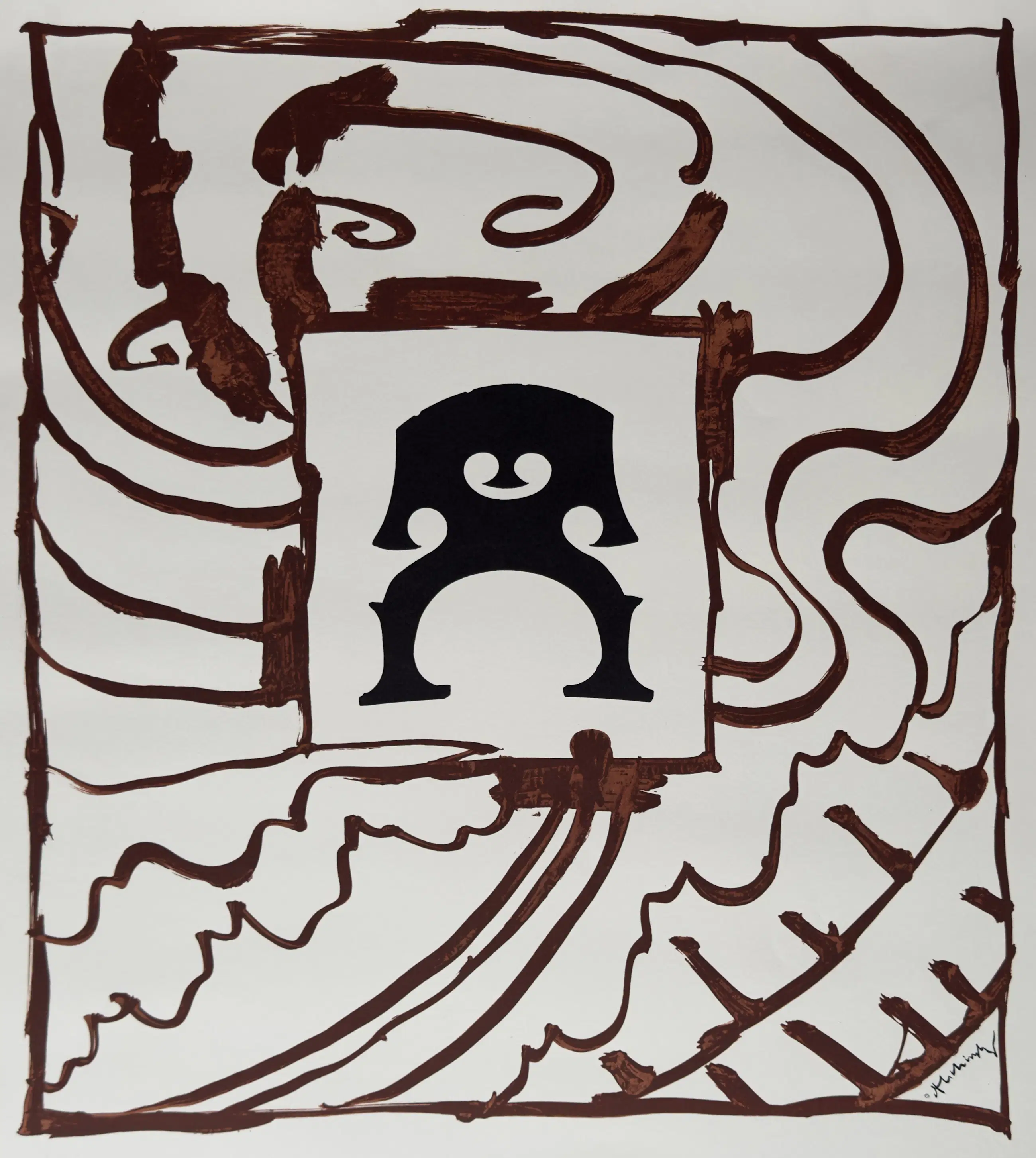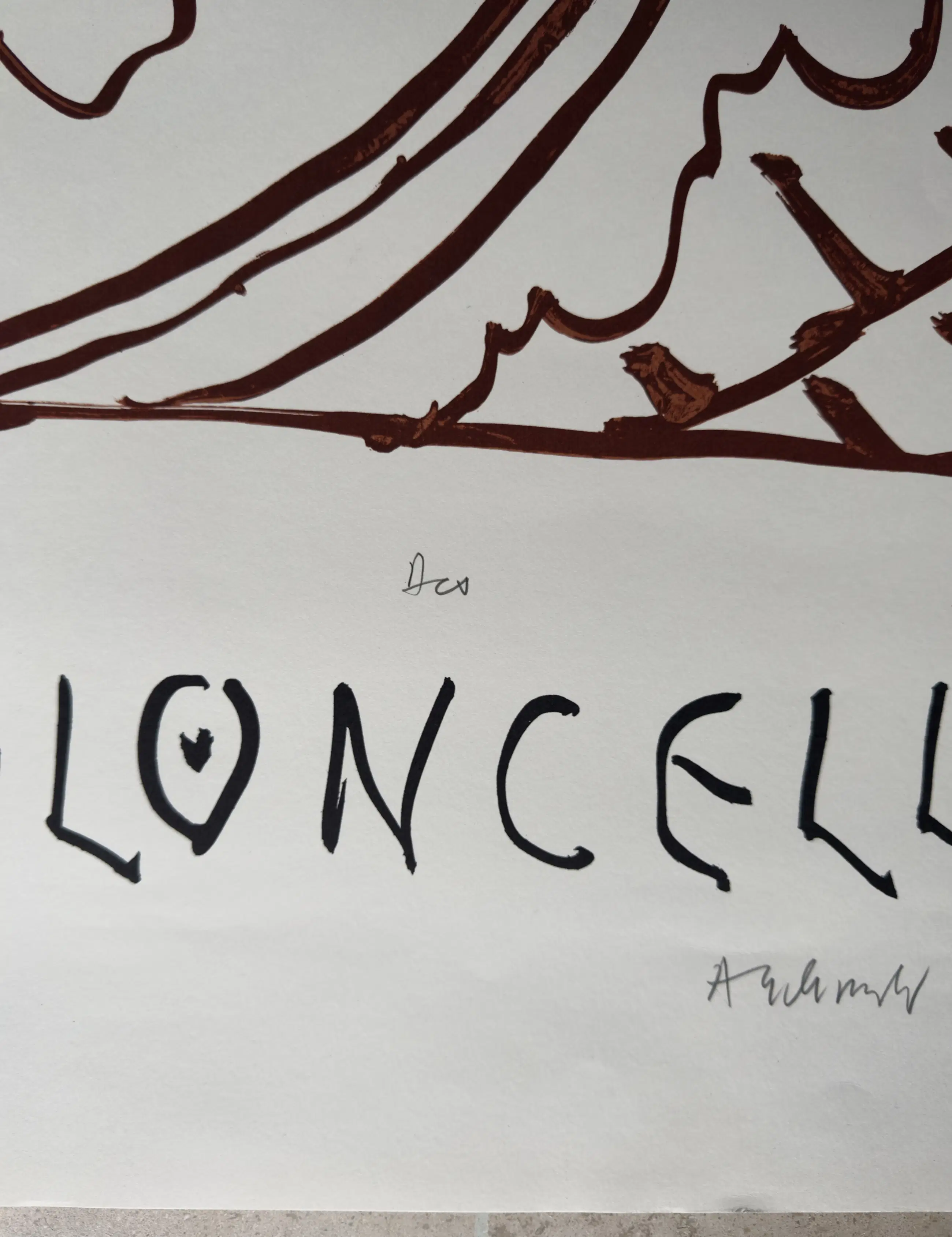 Litho van Pierre Alechinsky met de titel: 'Des Violoncelles' uit 2002. Het werk is rechtsonder met de hand gesigneerd door de kunstenaar.