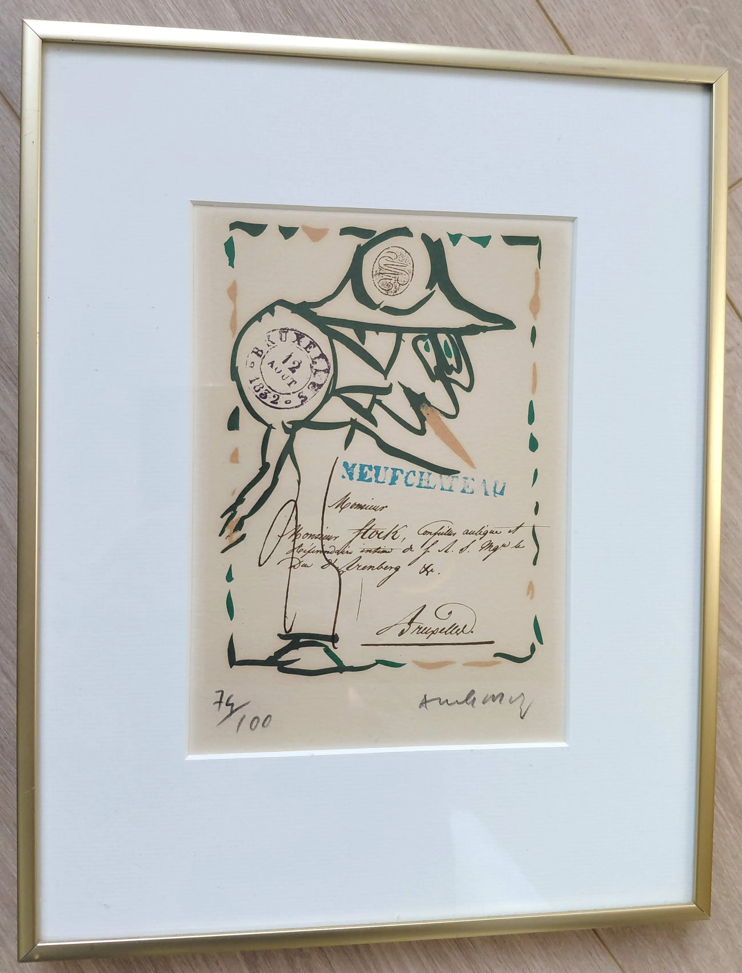 Klein maar karakteristiek werk van Pierre Alechinsky. Litho op geschept papier, met potlood gesigneerd en genummerd (74/100). In zeer nette, goudkleurige lijst, achter glas en met smetteloos, zuurvrij passe-partout. In goede conditie.