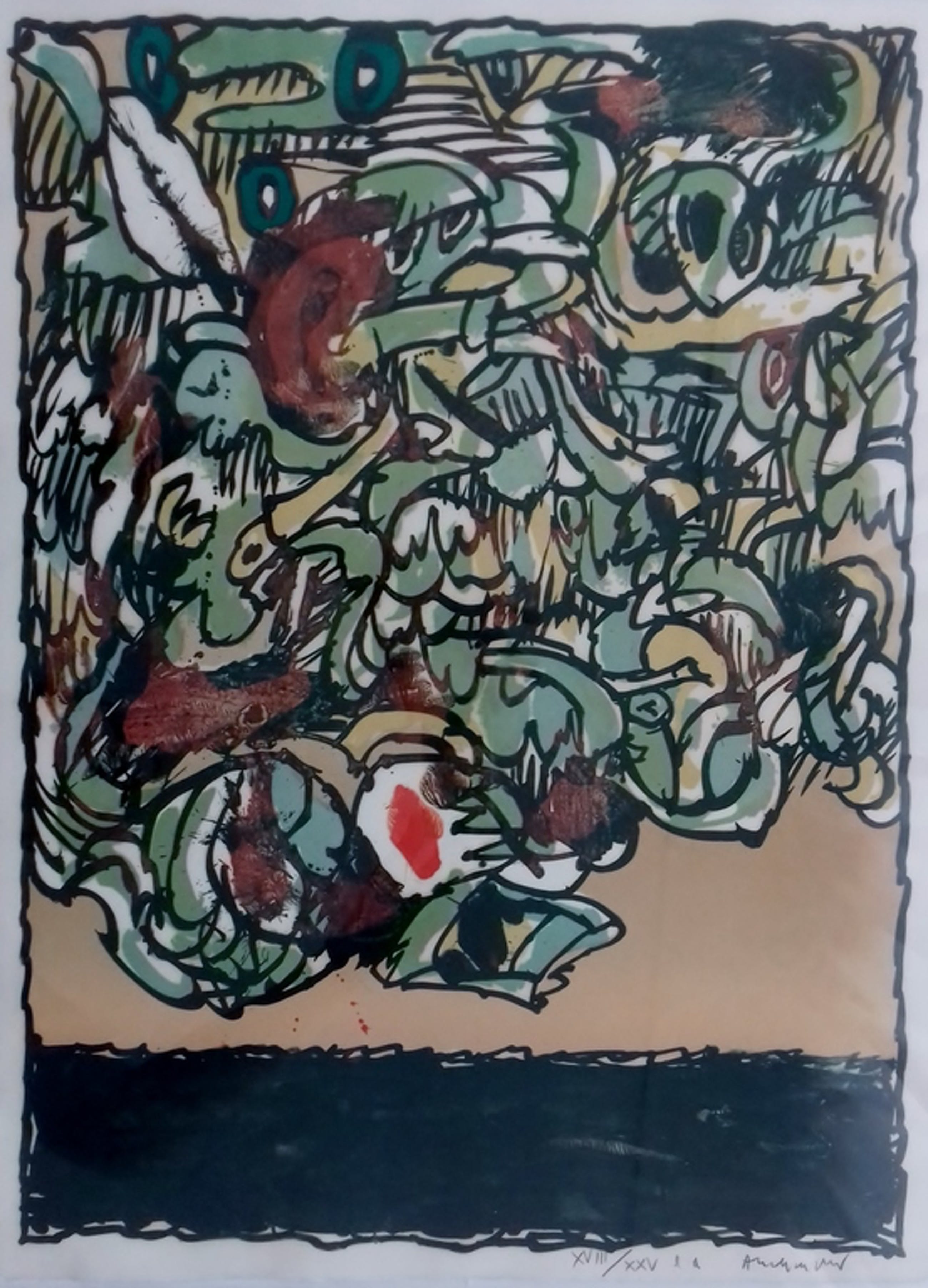 Dit exemplaar uit 1979 is onderdeel van een kleinere serie uitgebracht naast de reguliere oplage van 100 en daarom genummerd in romeinse cijfers. Dit is XVIII/XXV e.a.! Een dergelijke kleine serie was vaak bedoeld voor de kunstenaar om weg te geven aan relaties. Op de achterzijde staat dan ook een door Alechinsky handgeschreven opdracht.