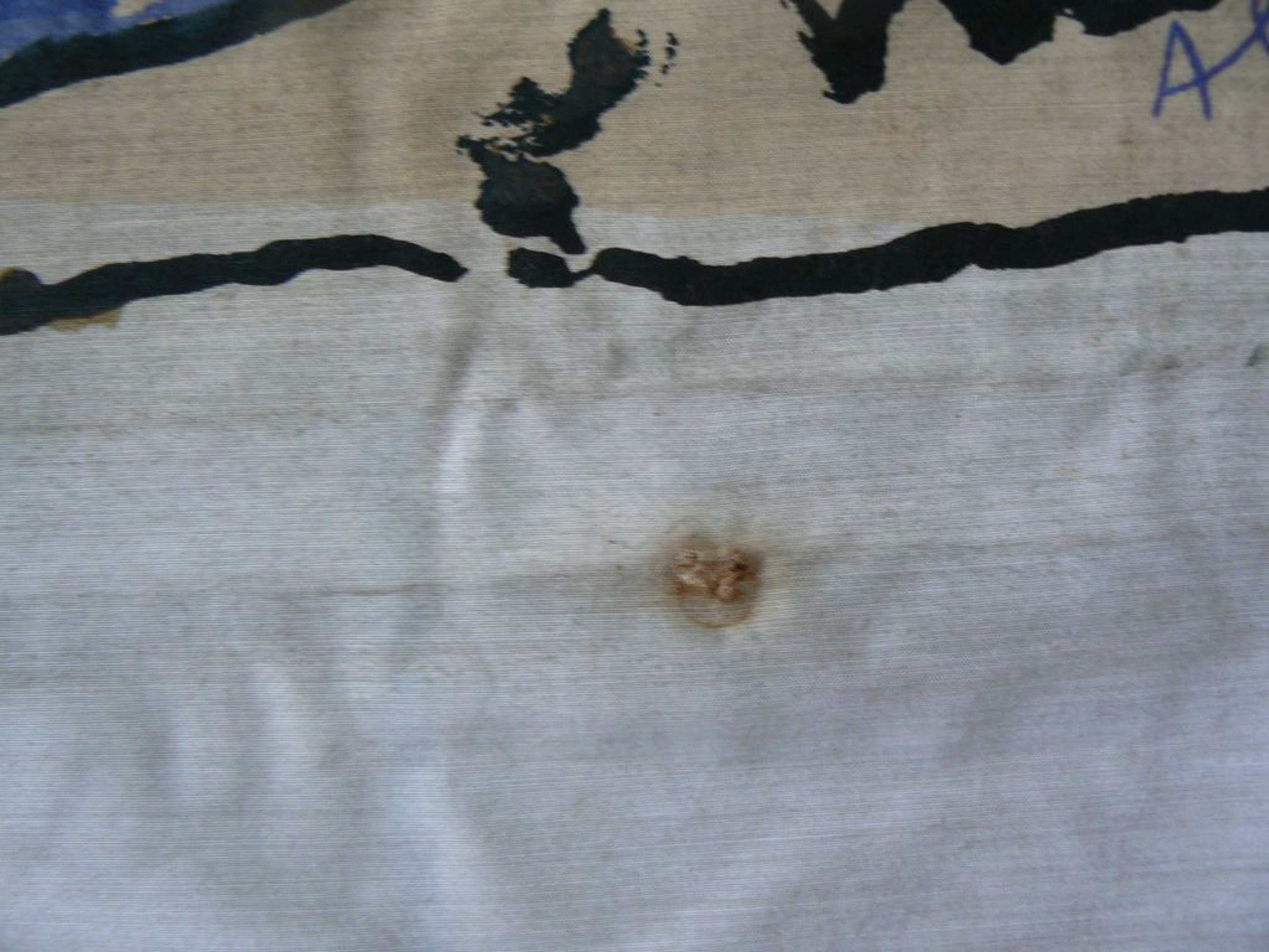We verkregen dit werk gevouwen over een houten frame (zodat het schilderij mooi in zicht was) met het omringende doek om het hout gewikkeld en met punaises vastgezet. We hebben het van het frame losgemaakt. Het omliggende doek is een beetje 'vies' en heeft een aantal gaatjes met daaromheen kringetjes van roest waar de punaises waren geprikt.