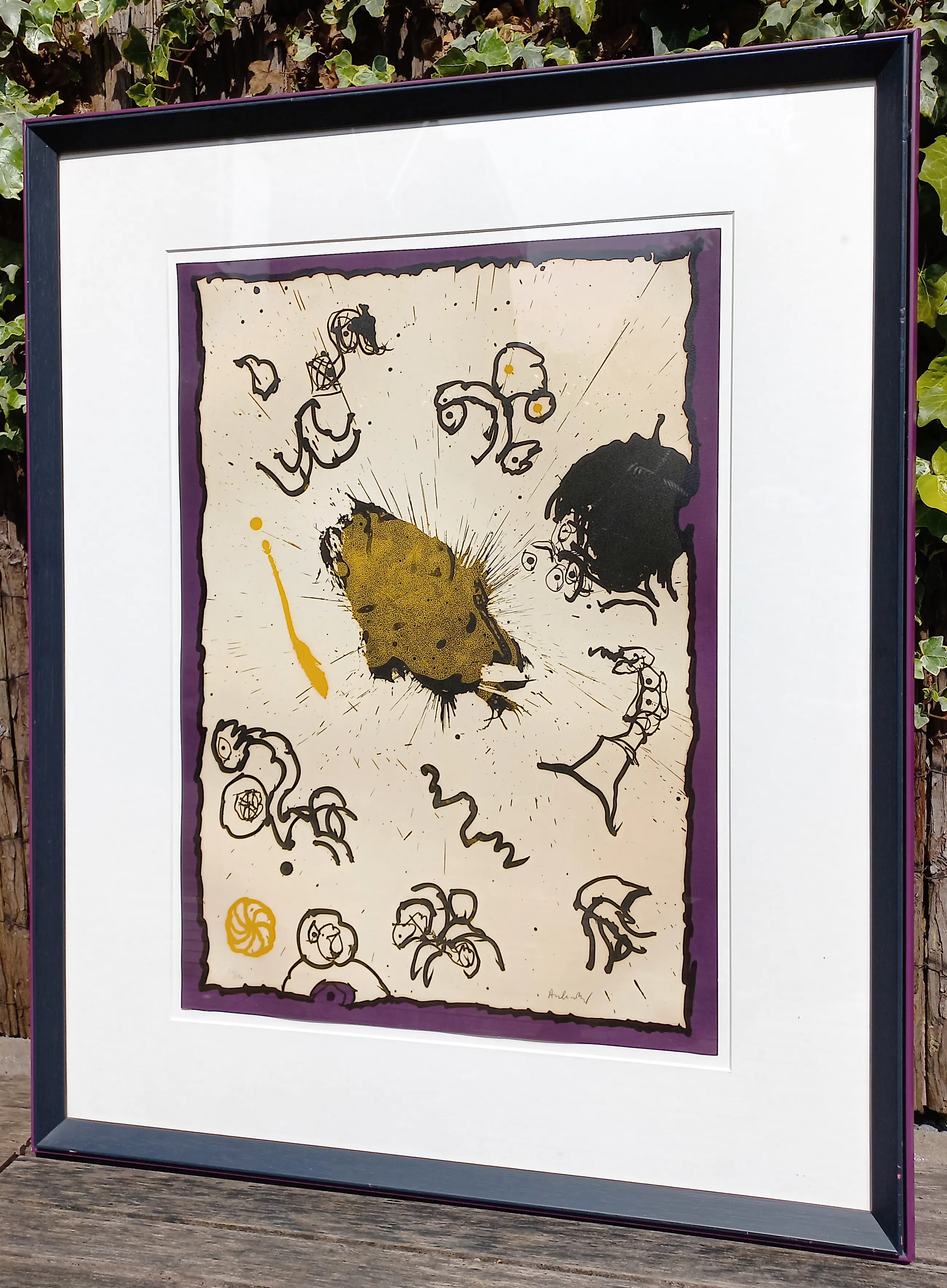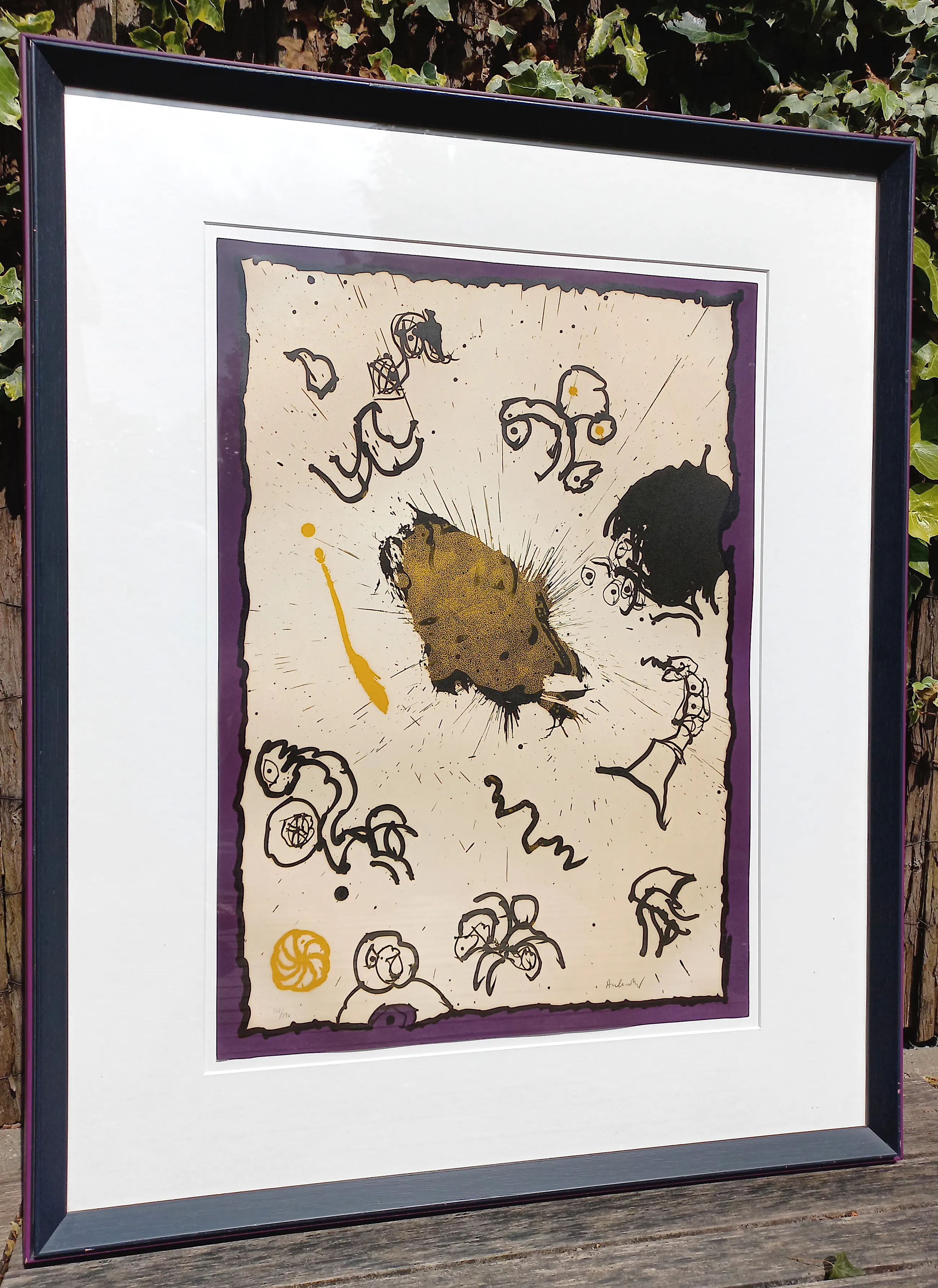 Zeer mooi, bekend werk van Pierre Alechinsky, in 1973 uitgegeven door Prent 190. Litho op geschept papier, met potlood gesigneerd en genummerd (107/190). Het volledige blad in mooie, complementerende lijst, achter glas en met smetteloos, zuurvrij passe-partout. Alles in zeer goede conditie.