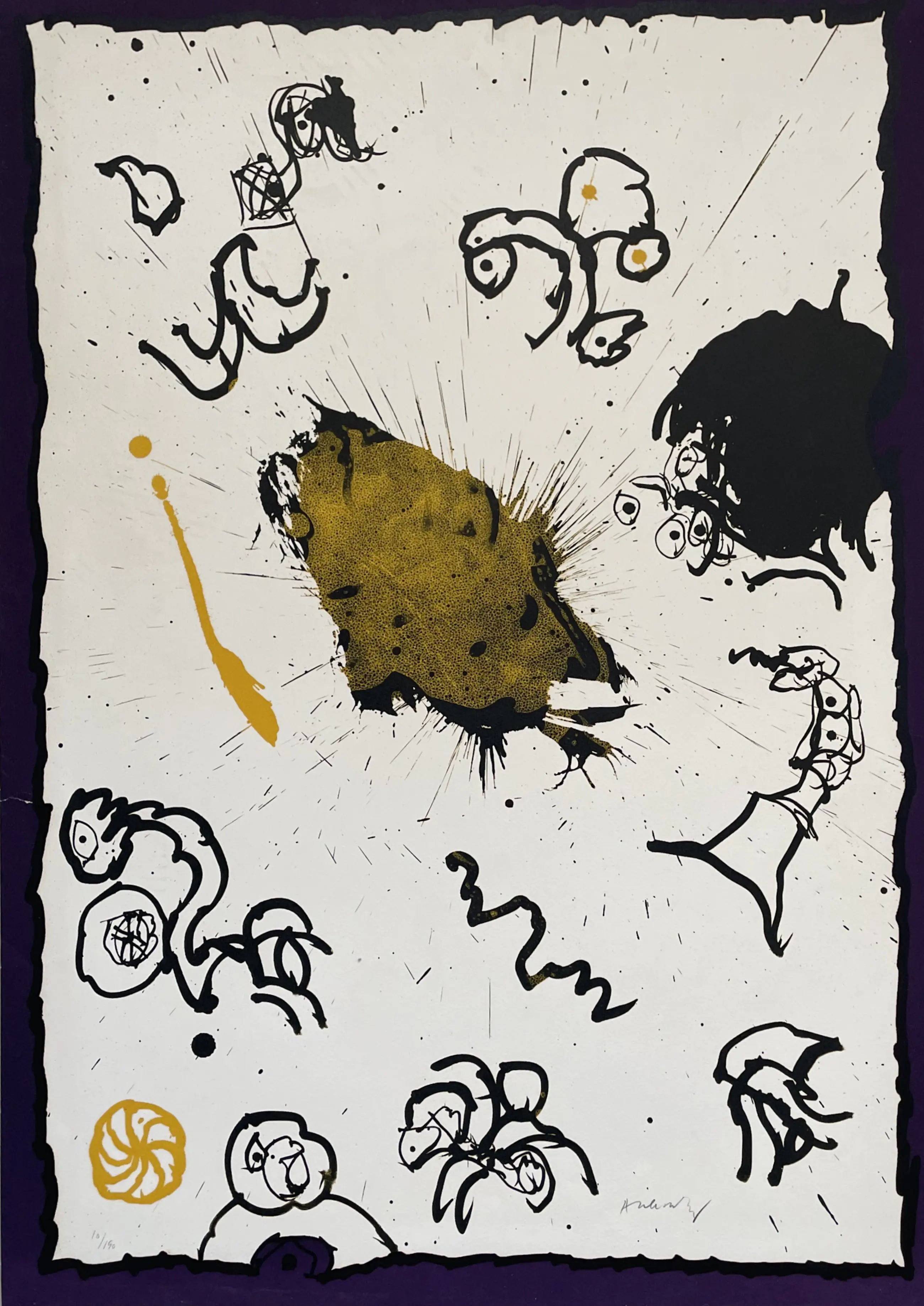 Het werk verkeert in goede staat. Het is onderdeel van Prent 190 een instelling die aan bekende kunstenaars opdracht gaf tot het maken van een kunstwerk in een oplage van 190 stuks (handgesigneerd) Pierre Alechinsky is een nog levende Belgisch kunstenaar die deel uitmaakte van de Cobragroep. Voor meer informatie over de kunstenaar verwijs ik naar het internet