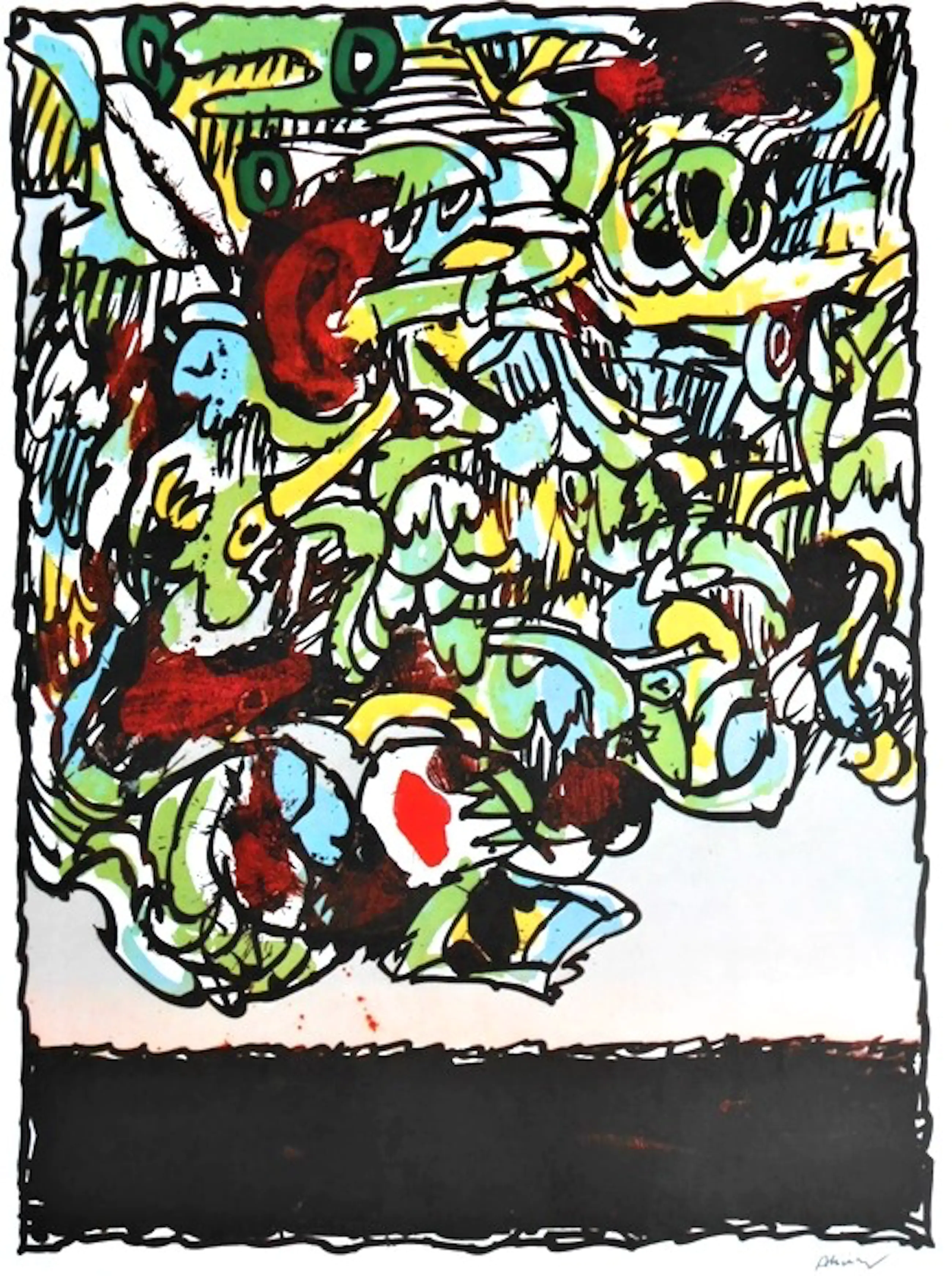 Zeer bijzondere offset-litho,s op gesatineerd papier. Deze werken zijn vervaardigd in de U.S.A. door de uitgever van Alechinsky na het drukken van de handgesigneerde exemplaren. Op deze offsets zit dus net zoveel inkt als op de serie-uitgave. De handtekening van Alechinsky is onder het werk gezet en is dus meegedrukt. De Offset-litho,s zijn uit 1978 en gemaakt van de originele platen.