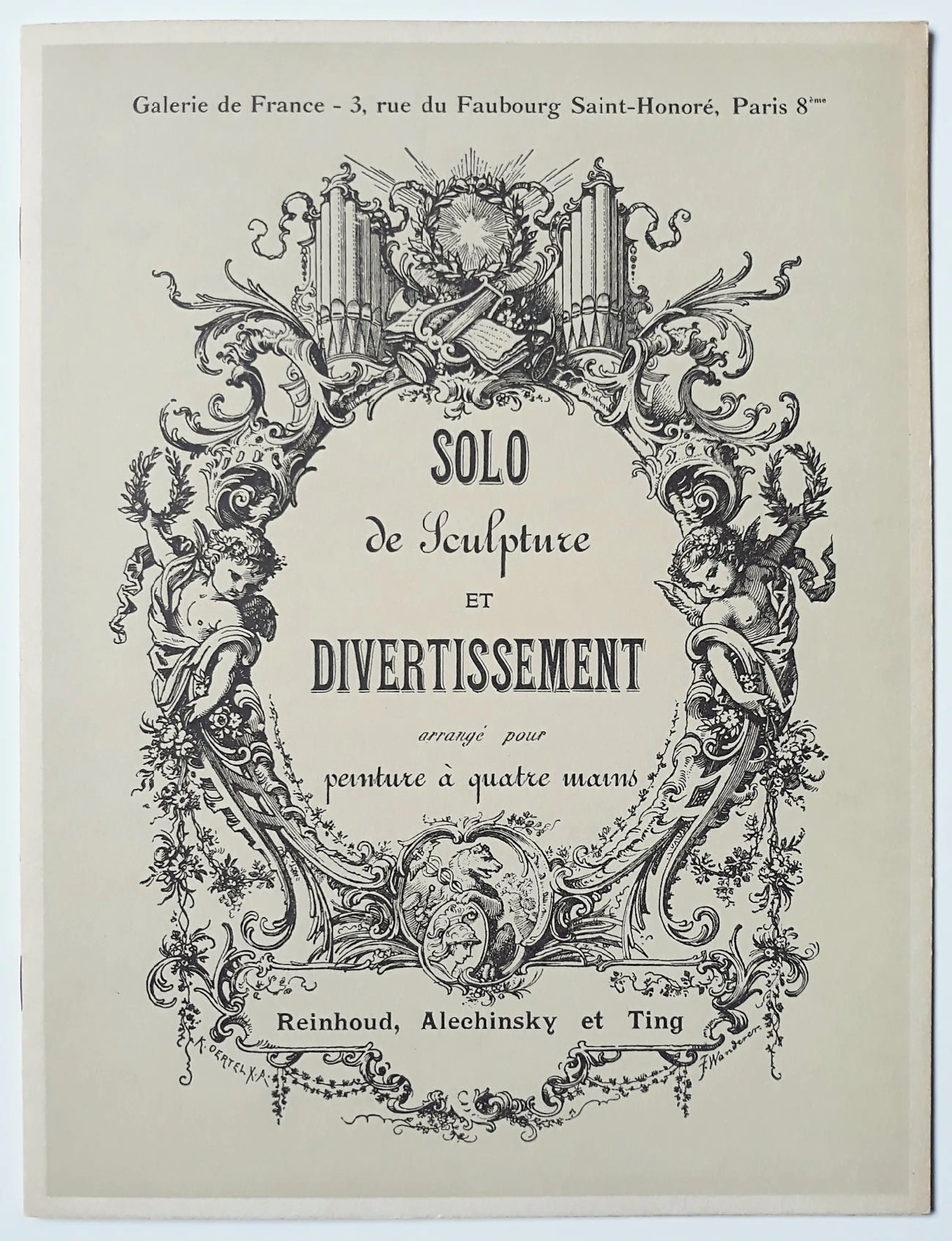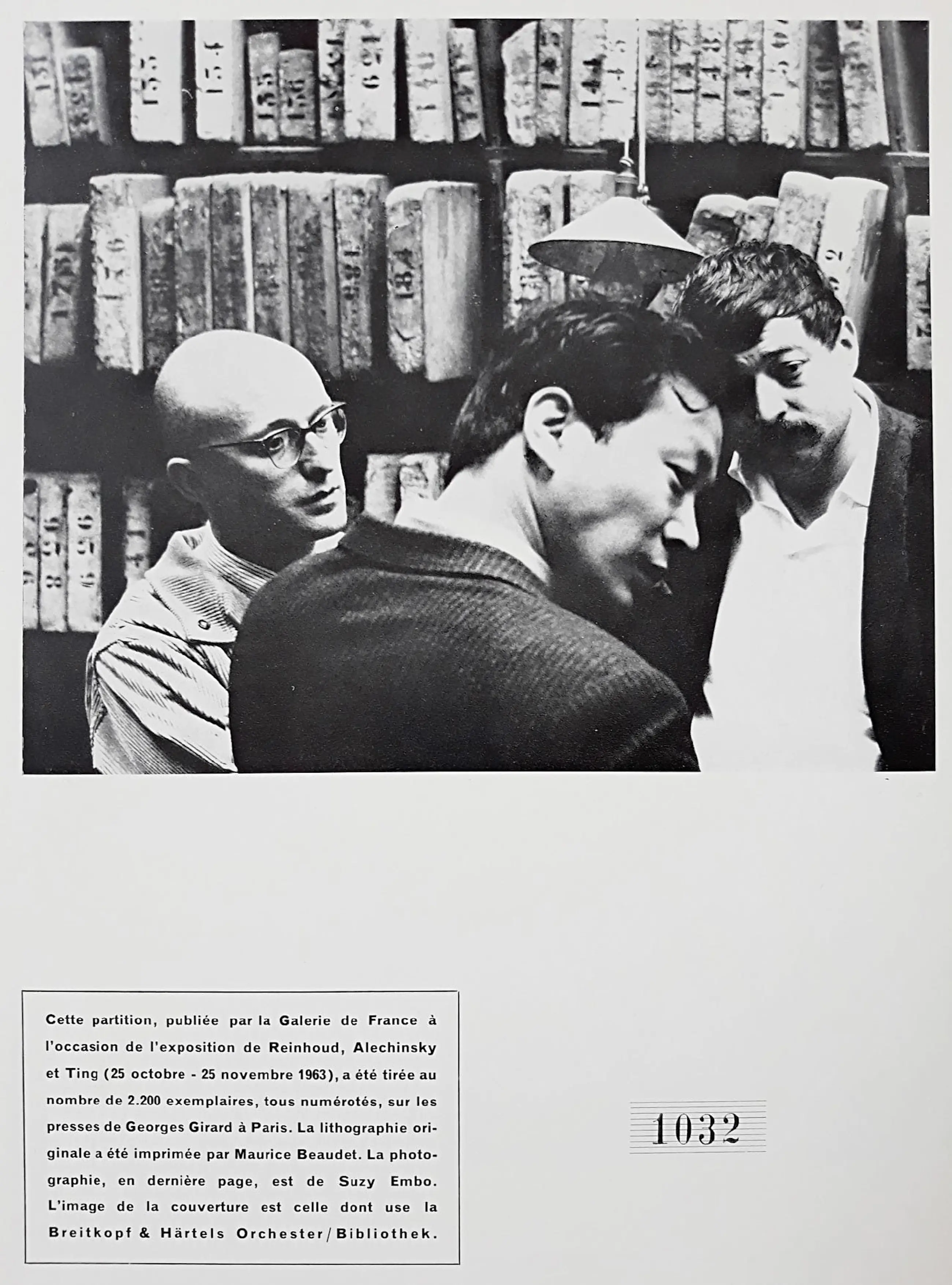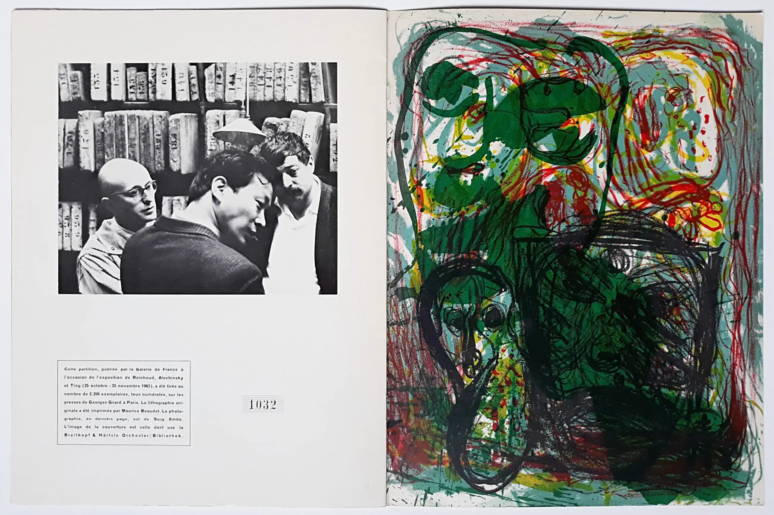 Mooie, historische publicatie ter gelegenheid van een gezamenlijke tentoonstelling van Alechinsky, Walasse Ting en Reinhoud in Galerie de France (1963). Volledige titel: “Solo de Sculpture et Divertissement / arrangé pour peinture de quatre mains”. Het ontwerp van de omslag is met een knipoog geleend van “Breitkopf & Hartel Orchesterbibliothek” (zie laatste foto, item wordt niet meegeleverd). De binnenkant van de omslag is een gezamenlijke dubbelpagina litho van Alechinsky en Ting genaamd Aleching (Literatuur: Rivière 215). Op de achterkant staat een aforisme van Christian Dotremont: “La musique est le silence du pauvre”.